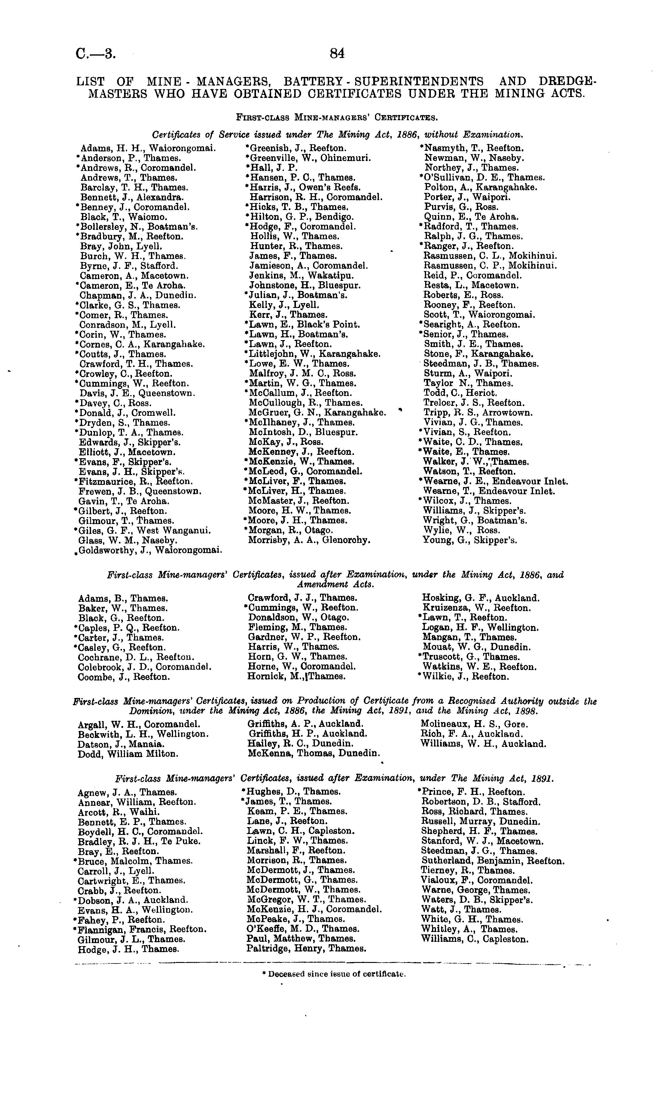 LIST OF MINE - MANAGEES, BATTEEY - SUPEEINTENDENTS AND DBEDGEMASTEES WHO HAVE OBTAINED CEETIFICATES UNDEE THE MINING ACTS. First-class Mine-managers' Certificates. Certificates of Service issued under The Mining Act, 1886, without Examination. Adams, H. H., Waiorongomai. "Greenish, J., Reefton. 'Nasmyth, T., Reefton. "Anderson, P., Thames. 'Greenville, W., Ohinemuri. Newman, W., Naseby. 'Andrews, R., Coromandel. 'Hall, J. P. Northey, J., Thames. Andrews, T., Thames. 'Hansen, P. C, Thames. 'O'Sullivan, D. E., Thames. Barclay, T. H., Thames. 'Harris, J., Owen's Reefs. Polton, A., Karangahake. Bennett, J., Alexandra. Harrison, R. H., Coromandel. Porter, J., Waipori. 'Benney, J., Coromandel. 'Hicks, T. 8., Thames. Purvis, G., Ross. Black, T„ Waiomo. 'Hilton, G. P., Bendigo. Quinn, E., Te Aroha. 'Bollersley, N., Boatman's. 'Hodge, F., Coromandel. 'Radford, T., Thames. 'Bradbury, M., Reefton. Hollis, W., Thames. Ralph, J. G., Thames. Bray, John, Lyell. Hunter, R., Thames. 'Ranger, J., Reefton. Burch, W. H., Thames. James, F., Thames. Rasmussen, C. L., Mokihinui. Byrne, J. F., Stafford. Jamieson, A., Coromandel. Rasmussen, C. P., Mokihinui. Cameron, A., Macetown. Jenkins, M., Wakatipu. Reid, P., Coromandel. 'Cameron, E., Te Aroha. Johnstone, H., Bluespur. Resta, L., Macetown. Chapman, J. A., Dunedin. 'Julian, J., Boatman's. Roberts, E., Ross. 'Clarke, G. S., Thames. Kelly, J., Lyell. Rooney, F., Reefton. 'Comer, R., Thames. Kerr, J., Thames. Scott, T., Waiorongomai. Conradson, M., Lyell. 'Lawn, E., Black's Point. 'Searight, A., Reefton. 'Corin, W., Thames. 'Lawn, H., Boatman's. 'Senior, J., Thames. 'Comes, C. A., Karangahake. 'Lawn, J., Reefton. Smith, J. E., Thames. 'Coutts, J., Thames. 'Littlejohn, W., Karangahake. Stone, F., Karangahake. Crawford, T. H., Thames. 'Lowe, E. W., Thames. Steedman, J. 8., Thames. 'Crowley, C, Reefton. Malfroy, J. M. C, Ross. Sturm, A., Waipori. 'Cummings, W., Reefton. 'Martin, W. G., Thames. Taylor N., Thames. Davis, J. E., Queenstown. 'McCallum, J., Reefton. Todd, C, Heriot. •Davey, C, Ross. McCullough, R., Thames. Treloer, J. S., Reefton. 'Donald, J., Cromwell. McGruer, G. N., Karangahake. Tripp, R. S., Arrowtown. 'Dryden, S., Thames. 'Mcllhaney, J., Thames. Vivian, J. G., Thames. •Dunlop, T. A., Thames. Mcintosh, D., Bluespur. 'Vivian, S., Reefton. Edwards, J., Skipper's. McKay, J., Ross. 'Waite, C. D., Thames. Elliott, J., Macetown. McKenney, J., Reefton. 'Waite, E., Thames. •Evans, F., Skipper's. 'McKenzie, W., Thames. Walker, J. W.,"Thames. Evans, J. H., Skipper's. 'McLeod, G., Coromandel. Watson, T., Reefton. •Fitzmaurice, R., Reefton. 'MoLiver, F., Thames. 'Wearne, J. E., Endeavour Inlet. Frewen, J. 8., Queenstown. 'McLiver, H., Thames. Wearne, T., Endeavour Inlet. Gavin, T., Te Aroha. McMaster, J., Reefton. 'Wilcox, J., Thames. 'Gilbert, J., Reefton. Moore, H. W., Thames. Williams, J., Skipper's. Gilmour, T., Thames. 'Moore, J. H., Thames. Wright, G-., Boatman's. 'Giles, G. F., West Wanganui. 'Morgan, R., Otago. Wylie, W., Ross. Glass, W. M., Naseby. Morrisby, A. A., Glenorohy. Young, G., Skipper's. .Goldsworthy, J., Waiorongomai. First-class Mine-managers' Certificates, issued after Examination, under the Mining Act, 1886, and Amendment Acts. Adams, 8., Thames. Crawford, J. J., Thames. Hosking, G. F., Auckland. Baker, W., Thames. 'Cummings, W., Reefton. Kruizenza, W., Reefton. Black, G., Reefton. Donaldson, W., Otago. 'Lawn, T., Reefton. •Caples, P. Q., Reefton. Fleming, M., Thames. Logan, H. F., Wellington. 'Carter, J., Thames. Gardner, W. P., Reefton. Mangan, T., Thames. •Casley, G., Reefton. Harris, W, Thames. Mouat, W. G., Dunedin. Cochrane, D. L., Reefton. Horn, G. W., Thames. 'Truscott, G., Thames. Colebrook, J. D., Coromandel. Home, W., Coromandel. Watkins, W. E., Reefton. Coombe, J., Reefton. Hornick, M.,jThames. 'Wilkio, J., Reefton. First-class Mine-managers' Certificates, issued on Production of Certificate from a Recognised Authority outside the Dominion, under the Mining Act, 1886, the Mining Act, 1891, and the Mining Act, 1898. Argall, W. H., Coromandel. Griffiths, A. P., Auckland. Moliueaux, H. S., Gore. Beckwith, L. H., Wellington. Griffiths, H. P., Auckland. Rioh, F. A., Auokland. Datson, J., Manaia. Hailey, R. C, Dunedin. Williams, W. H., Auokland. Dodd, William Milton. McKenna, Thomas, Dunedin. First-class Mine-managers' Certificates, issued after Examination, under The Mining Act, 1891. Agnew, J. A., Thames. 'Hughes, D., Thames. 'Prince, F. H., Reefton. Annear, William, Reefton. 'James, T., Thames. Robertson, D. 8., Stafford. Arcott, R., Waihi. Keam, P. E., Thames. Ross, Richard, Thames. Bennett, E. P., Thames. Lane, J., Reefton. Russell, Murray, Dunedin. Boydell, H. C, Coromandel. Lawn, C. H., Capleston. Shepherd, H. F., Thames. Bradley, R. J. H., Te Puke. Linck, F. W., Thames. Stanford, W. J., Macetown. Bray, E., Reefton. Marshall, F., Reefton. Steedman, J. G., Thames. 'Bruce, Malcolm, Thames. Morrison, R., Thames. Sutherland, Benjamin, Reefton. Carroll, J., Lyell. McDermott, J., Thames. Tierney, R., Thames. Cartwright, E., Thames. McDermott, G., Thames. Vialoux, F., Coromandel. Crabb, J., Reefton. McDermott, W., Thames. Warne, George, Thames. •Dobson, J. A., Auckland. McGregor, W. T., Thames. Waters, D. 8., Skipper's. Evans, H. A., Wellington. McKenzie, H. J., Coromandel. Watt, J., Thames. •Fahey, P., Reefton. MoPeake, J., Thames. Whito, G. H., Thames. •Flannigan, Francis, Reefton. O'Keeffe, M. D., Thames. Whitley, A., Thames. Gilmour, J. L., Thameß. Paul, Matthew, Thames. Williams, C, Capleston. Hodge, J. H., Thames. Paltridge, Henry, Thames.
