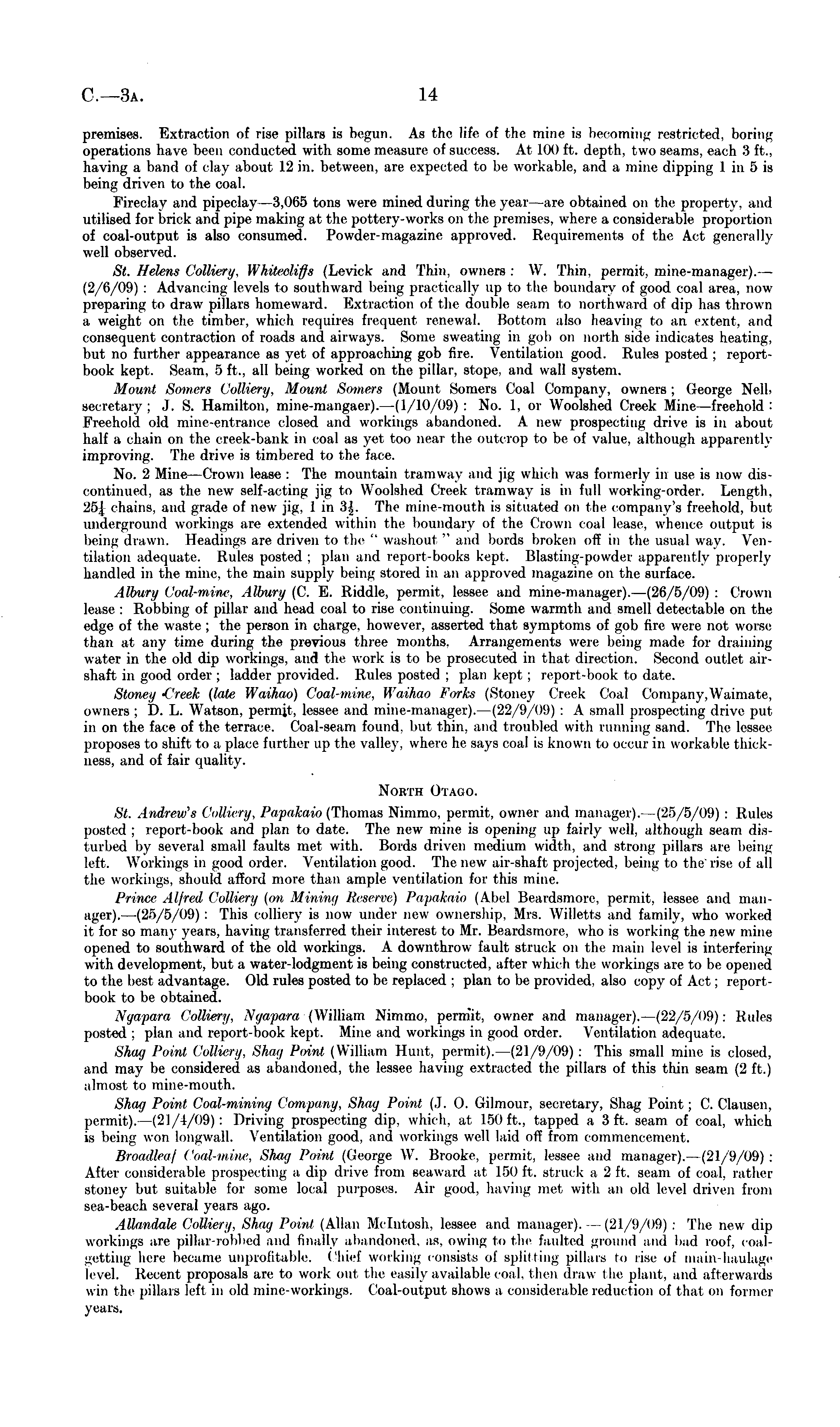premises. Extraction of rise pillars is begun. As the life of the mine is becoming restricted, boring operations have been conducted with some measure of success. At KM) ft. depth, two seams, each 3 ft., having a band of clay about 12 in. between, are expected to be workable, and a mine dipping 1 in 5 is being driven to the coal. Fireclay and pipeclay —3,065 tons were mined during the year —are obtained on the property, and utilised for brick and pipe making at the pottery-works on the premises, where a considerable proportion of coal-output is also consumed. Powder-magazine approved. Requirements of the Act generally well observed. St. Helens Colliery, WkiteoUfft (Levick and Thin, owners : W. Thin, permit, mine-manager).— (2/6/09) : Advancing levels to southward being practically up to the boundary of good coal area, nov preparing to draw pillars homeward. Extraction of the double seam to northward of dip has thrown a weight on the timber, which requires frequent renewal. Bottom also heaving to an extent, and consequent contraction of roads and airways. Some sweating in gob on north side indicates heating, but no further appearance as yet of approaching gob fire. Ventilation good. Rules posted ; reportbook kept. Si , am. sft., all being worked on the pillar, slope, and wall system. Mount Sonnets Colliery, Mount Somers (Mount Somers Coal Company, owners; George Nellsecretary; J. 8. Hamilton, mine-mangaer). — (1/10/09): No. 1. or Wookhed Creek .Mine—freehold: Freehold old mine-entrance closed and workings abandoned. A new prospecting drive is in about half a chain on the creek-bank in coal as yet too near the outcrop to be of value, although apparently improving. The drive is timbered to the face. No. 2 Mine Crown lease : The mountain tramway and jig which was formerly in use is now discontinued, as the new self-acting jig to Wbolshed Creek tramway is in lull working-order. Length, 25| chains, and grade of new jig. lin :)},. The mine-mouth is situated on the company's freehold, but underground workings are extended within the boundary of the Crown coal lease, whence output is being drawn. Headings are driven to the " washout " and Uirds broken off in the usual way. Ventilation adequate. Rules posted : plan and report-books kept. Blasting-powder apparently properly handled in the mine, the main supply being Stored in an approved magazine on the surface. Attntry Coal-mine, AJbury (Q. E. Riddle, permit, lessee and mine-manager). —(26/5/09): Crown lease : Robbing of pillar and head coal to rise continuing. Some warmth and smell detectable on the edge of the waste ; the person in charge, however, asserted that symptoms of gob fire were not worse than at any time during the previous three months. Arrangements were being made for draining water in the old dip workings, and the work is to be prosecuted in that direction. Second outlet airshaft in good order ; ladder provided. Rules posted ; plan kept; report-book to date. Stoney Creek (/«fc Waihao) Cod-mine, Waihao Forks (Stoney Creek Coal Company,Waimate, owners ; D. L. Watson, permit, lessee and mine-manager). —(22/9/0!)) : A small prospecting drive put in on the face of the terrace. Coal-seam found, but thin, and troubled with running sand. The lessee proposes to shift to a place further up the valley, where he says coal is known to occur in workable thickness, and of fair quality. North Otago. St. Andrew's Colliery, Papakaio (Thomas Nimmo. permit, owner and manager). (25/5/09): Rules posted : report-book and plan to date. The new mine is opening up fairly well, although seam disturbed by several small faults met with. Bords driven medium width, and strong pillars are being left. Workings in good order. Ventilation good. The new air-shaft projected, being to the rise of all the winkings, should afford move than ample ventilation for this mine. Prince Alfred CoUiery (on Minim/ Reserve) Papakaio (Abel Beardamore, permit, lessee and manager). —(25/5/09) : This colliery is now under new ownership. Mrs. Willetts and family, who worked it for so many years, having transferred their interest to Mr. Beardsmore, who is working the new mine opened to southward of the old workings. A downthrow fault, struck on the main level is interfering with development, but a water-lodgment is being constructed, after which I he workings are to be opened to the best advantage. Old rules posted to be replaced ; plan to be provided, also copy of Act; reportbook to be obtained. Ngapara CoUiery, Ngwpara (William Nimmo, permit, owner and manager). —(22/5/09): Rules posted : plan and report-book kept. Mine and workings in good order. Ventilation adequate. Shag Point CoUiery, Sim;/ Hoint (William Hunt, permit).—(2l/9/09): This small mine is closed, and may be considered as abandoned, the lessee having extracted the pillars of this thin seam (2 ft.) almost to mine-mouth. Shag Point Coal-minim/ Company, Shai/ Point (J. 0. Gilmour, secretary, Shag Point; C. Clausen, permit). —(21/4/09): Driving prospecting dip. which, at 150 ft., tapped a 3 ft. seam of coal, which is being won longwall. Ventilation good, and workings well laid off from commencement. BroadUaj Coal-mine, Shag Point (George W. Brooke, permit, lessee and manager).—(2l/9/09): After considerable prospecting a dip drive from seaward at 150 ft. struck a 2 ft. seam of coal, lather stoney but suitable for some local purposes. Air good, having met with an old [eve] driven from sea-beach several years ago. AUandale CoUiery, Shag Point (Allan Macintosh, lessee and manager). (21/9/09): The new dip workings are pillar robbed and finally abandoned, as. owing to tin- faulted ground and bad roof, coal getting here became unprofitable. Chief working consists of splitting pillars in rise of main tiaulage level. Recent proposals are to work out the easily available coal, then draw ihe plant, and afterwards win the pillars left in old mine-workings. Coal-output shows a considerable reduction of that on form