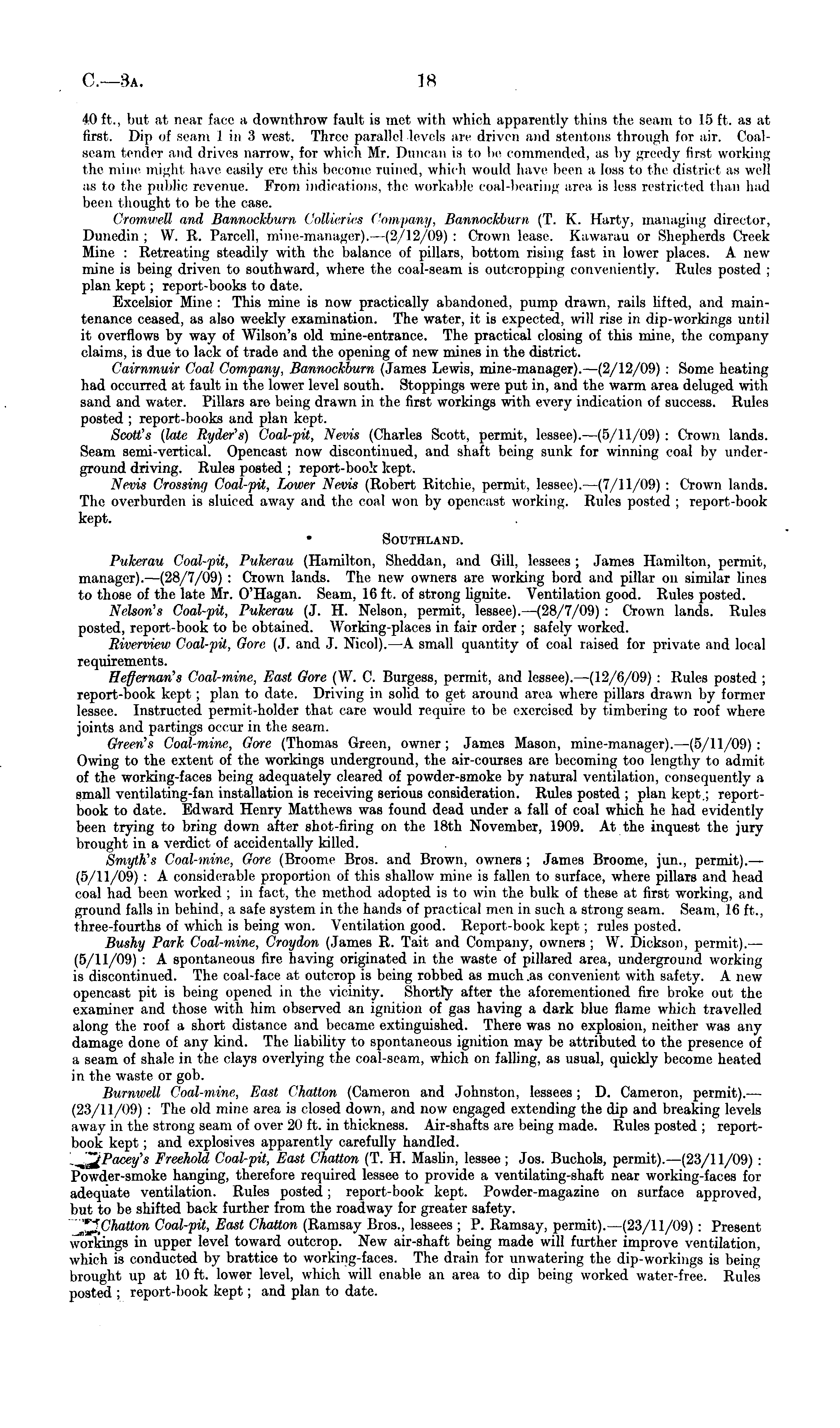 40 ft., but at near faoe a downthrow fault is met with which apparently thins the seam to 15 ft. aa at first. Dip of seam lin 3 west. Three parallel levels arc driven ami stentons through for air. Coal scam tender and drives narrow, for which Mr. Duncan is fco be commended, as by greedy first working the mine mighi have easily ere this become mined, which would have been a loss to the district as well as to the public revenue. From indications, the workable coal-bearing area is less restricted than had been i bought to be the case. Cromwll and Bannockburn Collieries Company, Bannockburn (T. K. Harty, managing director, Dunedin ; W. R. Parcel!, mine-manager). —(2/12/09) : Crown lease. Kawarau or Shepherds Creek Mine : Retreating steadily with the balance of pillars, bottom rising fast in lower places. A new mine is being driven to southward, where the coal-seam is outcropping conveniently. Rules posted ; plan kept; report-books to date. Excelsior Mine : This mine is now practically abandoned, pump drawn, rails lifted, and maintenance ceased, as also weekly examination. The water, it is expected, will rise in dip-workings until it overflows by way of Wilson's old mine-entrance. The practical closing of this mine, the company claims, is due to lack of trade and the opening of new mines in the district. Cairnmuir Coal Company, Bannockburn (James Lewis, mine-manager). —(2/12/09) : Some heating had occurred at fault in the lower level south. Stoppings were put in, and the warm area deluged with sand and water. Pillars are being drawn in the first workings with every indication of success. Rules posted ; report-books and plan kept. Scott's (late Ryder's) Coal-pit, Nevis (Charles Scott, permit, lessee). —(5/11/09) : Crown lands. Seam semi-vertical. Opencast now discontinued, and shaft being sunk for winning coal by underground driving. Rules posted ; report-book kept. Nevis Crossing Coal-pit, Lower Nevis (Robert Ritchie, permit, lessee). —(7/11/09) : Crown lands. The overburden is sluiced away and the coal won by opencast working. Rules posted ; report-book kept. • Southland. I'iikerau Coal-pit, Pukerau (Hamilton, Sheddan, and Gill, lessees ; James Hamilton, permit, manager). —(28/7/09) : Crown lands. The new owners are working bord and pillar on similar lines to those of the late Mr. O'Hagan. Seam, 16 ft. of strong lignite. Ventilation good. Rules posted. Nelson's Coal-pit, Pukerau (J. H. Nelson, permit, lessee). —(28/7/09) : Crown lands. Rules posted, report-book to be obtained. Working-places in fair order ; safely worked. Riverview Coal-pit, Gore (J. and J. Nicol). —A small quantity of coal raised for private and local requirements. Heffernan's Coal-mine, East Gore (W. C. Burgess, permit, and lessee). —(12/6/09) : Rules posted ; report-book kept ; plan to date. Driving in solid to get around area where pillars drawn by former lessee. Instructed permit-holder that care would require to be exercised by timbering to roof where joints and partings occur in the seam. Green's Coal-mine, Gore (Thomas Green, owner; James Mason, mine-manager).—(s/11/09): Owing to the extent of the workings underground, the air-courses are becoming too lengthy to admit of the working-faces being adequately cleared of powder-smoke by natural ventilation, consequently a small ventilating-fan installation is receiving serious consideration. Rules posted ; plan kept.; reportbook to date. Edward Henry Matthews was found dead under a fall of coal which he had evidently been trying to bring down after shot-firing on the 18th November, 1909. At the inquest the jury brought in a verdict of accidentally killed. Smyth's Coal-mine, Gore (Broome Bros, and Brown, owners ; James Broome, jun., permit).— (5/11/09) : A considerable proportion of this shallow mine is fallen to surface, where pillars and head coal had been worked ; in fact, the method adopted is to win the bulk of these at first working, and ground falls in behind, a safe system in the hands of practical men in such a strong seam. Seam. 16 ft., three-fourths of which is being won. Ventilation good. Report-book kept ; rules posted. Bushy Park Coal-mine, Croydon (James R. Tait and Company, owners ; W. Dickson, permit).— (5/11/09) : A spontaneous fire having originated in the waste of pillared area, underground working is discontinued. The coal-face at outcrop is being robbed as much .as convenient with safety. A new opencast pit is being opened in the vicinity. Shortly after the aforementioned fire broke out the examiner and those with him observed an ignition of gas having a dark blue flame which travelled along the roof a short distance and became extinguished. There was no explosion, neither was any damage done of any kind. The liability to spontaneous ignition may be attributed to the presence of a seam of shale in the clays overlying the coal-seam, which on falling, as usual, quickly become heated in the waste or gob. Burnwell Coal-mine, East Chatton (Cameron and Johnston, lessees; D. Cameron, permit).— (23/11/09) : The old mine area is closed down, and now engaged extending the dip and breaking levels away in the strong seam of over 20 ft. in thickness. Air-shafts are being made. Rules posted ; reportbook kept; and explosives apparently carefully handled. Freehold Coal-pit, East Chatton (T. H. Maslin, lessee; Jos. Buchols, permit).—-(23/11/09) : Powder-smoke hanging, therefore required lessee to provide a ventilating-shaft near working-faces for adequate ventilation. Rules posted; report-book kept. Powder-magazine on surface approved, but to be shifted back further from the roadway for greater safety. Coal-pit, East Chatton (Ramsay Bros., lessees ; P. Ramsay, permit).—(23/11/09): Present workings in upper level toward outcrop. New air-shaft being made will further improve ventilation, which is conducted by brattice to working-faces. The drain for unwatering the dip-workings is being brought up at 10 ft. lower level, which will enable an 