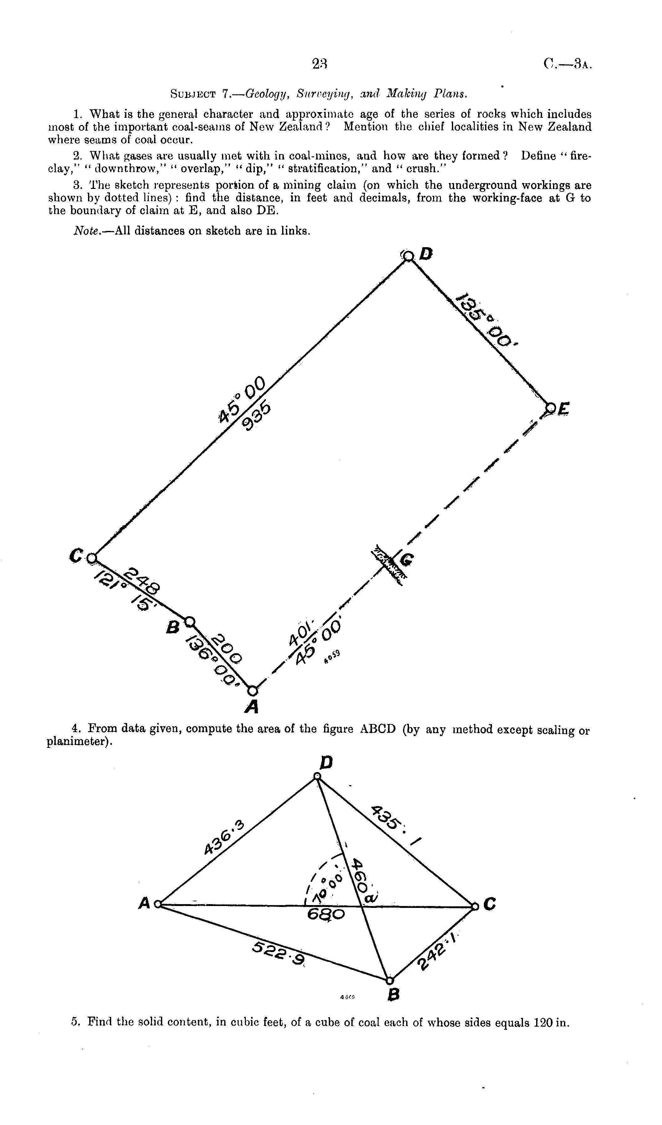 Subject 7.— Geology, Surveying, and Making Plans. 1. What is the general character and approximate age of the series of rocks which includes most of the important coal-seams of Now Zealand? Mention the chief localities in New Zealand where seams of coal occur. 2. What gases are usually met with in coal-mines, and how are they formed? Define " fireclay," " downthrow," " overlap," " dip," " stratification," and " crush." 3. The sketch represents portion of a mining claim (on which the underground workings are shown by dotted lines) : find the distance, in feet and decimals, from the working-face at G to the boundary of claim at E, and also DE. Note. —All distances on sketch are in links.