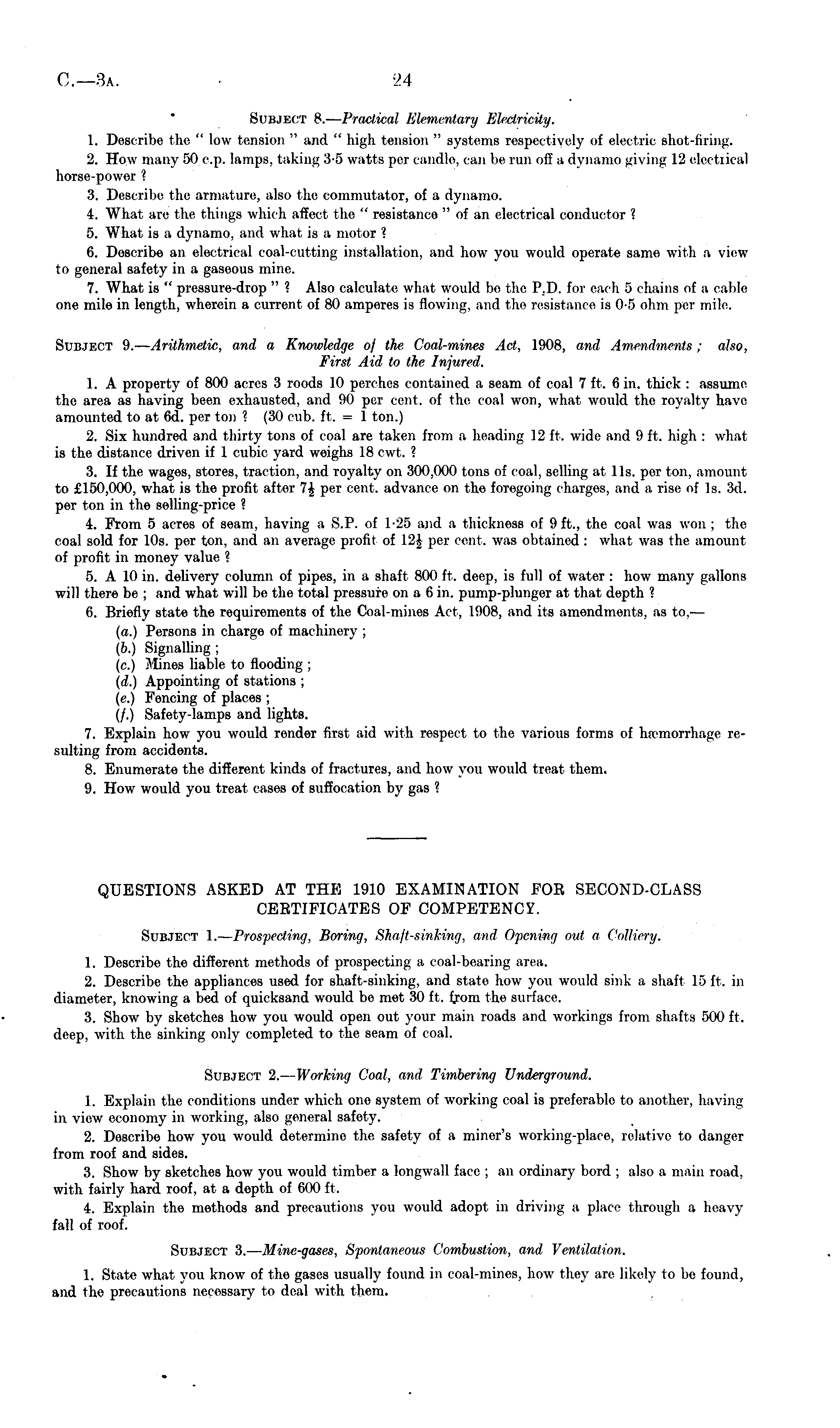 Subject B.— Practical Elementary Electricity. 1. Describe the " low tension " and " high tension " systems respectively of electric shot-firing. 2. How many 50 c.p. lamps, taking 3-5 watts per candle, can be run off a dynamo giving 12 electrical horse-power ? 3. Describe the armature, also the commutator, of a dynamo. 4. What are the things which affect the " resistance " of an electrical conductor i 5. What is a dynamo, and what is a motor ? 6. Describe an electrical coal-cutting insia.lla.tion. and how you would operate same with a view to general safety in a gaseous mine. 7. What is " pressure-drop " ? Also calculate what would be the P.D. for each 5 chains of a cable one mile in length, wherein a current of 80 amperes is flowing, and the resistance is 0-5 ohm per mile. Subject 9. — Arithmetic, and a Knowledge oj the Coal-mines Act, 1908, and Amendments ; also. Firs/ Aid in the Injured. 1. A property of 800 acres 3 roods 10 perches contained a seam of coal 7 ft. 6 in. thick : assume the area as having been exhausted, and 90 per cent, of the coal won, what would the royalty have amounted to at 6d. per ton ? (30 cub. ft. = 1 ton.) 2. Six hundred and thirty tons of coal are taken from a heading 12 ft. wide and 9 ft. high : what is the distance driven if 1 cubic yard weighs 18 cwt. ? '■). If the wages, stores, traction, and royalty on 300,000 tons of coal, selling at lls. per ton, amount to £150,000, what is the profit after 7J per cent, advance on the foregoing charges, and a. rise of Is. 3d. per ton in the selling-price ? 4. From 5 acres of seam, having a S.P. of 1-25 and a thickness of 9 ft., the coal was won ; the coal sold for 10s. per ton, and an average profit of 12£ per cent, was obtained : what was the amount of profit in money value ? 5. A 10 in. delivery column of pipes, in a shaft 800 ft. deep, is full of water : how many gallons will there be ; and what will be the total pressure on a 6 in. pump-plunger at that depth ? fi. Briefly state the requirements of the Coal-mines Act, 1908, and its amendments, as to, — (a.) Persons in charge of machinery ; (b.) Signalling ; (c.) Mines liable to flooding ; (d.) Appointing of stations ; (c.) Fencing of places ; (/.) Safety-lamps and lights. 7. Explain how you would render first aid with respect to the various forms of haemorrhage resulting from accidents. 8. Enumerate the different kinds of fractures, and how you would treat them. 9. How would you treat cases of suffocation by gas ?