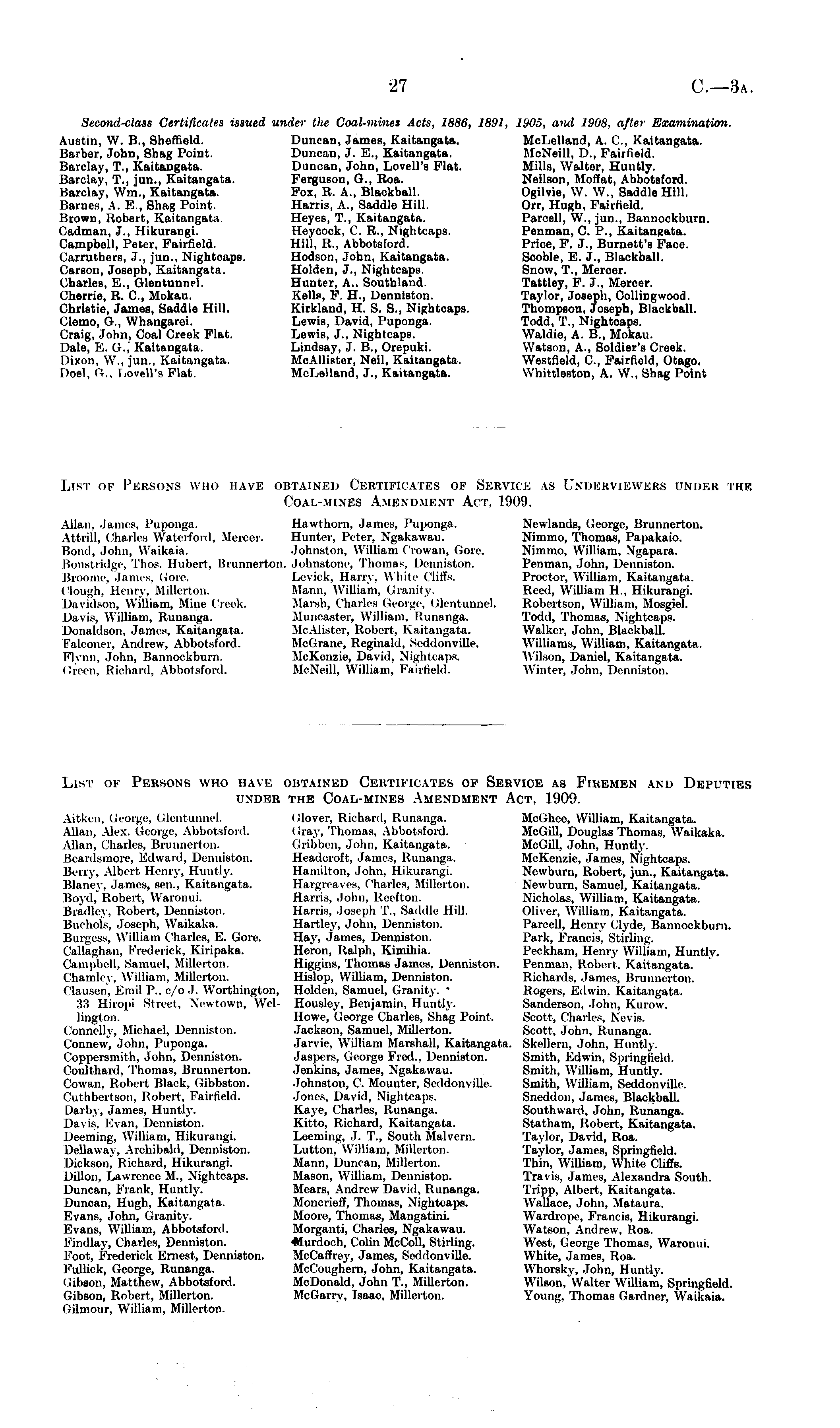 Second-class Certificates issued under the Coal-mines Acts, 1886, 1891, 1906, and 1908, after Examination. Austin, W. 8., Sheffield. Duncan, James, Kaitangata. McLelland, A. C, Kaitangata. Barber, John, Shag Point. Duncan, J. E., Kaitangata. McNeill, D., Fairfield. Barclay, T., Kaitangata. Duncan, John, Lovell's Plat. Mills, Walter, Huntly. Barclay, T., jun., Kaitangata. Ferguson, G., Roa. Neilson, Moffat, Abbotsford. Barclay, Wm, Kaitangata. Fox, R. A., Blackball. Ogilvie, W. W., Saddle Hill. Barnes, A. X., Shag Point. Harris, A., Saddle Hill. Orr, Hugh, Fairtield. Brown, Robert, Kaitangata Heyes, T., Kaitangata. Parcell, W., jun., Bannockburn. Cadman, J., Hikurangi. Heycock, C. R., Nightcaps. Penman, C. P., Kaitangata. Campbell, Peter, Fairfield. Hill, R., Abbotsford. Price, F. J., Burnett's Face. Carruthers, J., jun., Nightcaps. Hodson, John, Kaitangata. Scoble, E. J., Blackball. Carson, Joseph, Kaitangata. Holden, J., Nightcaps. Snow, T., Mercer. Charles, E., Glentunnel. Hunter, A.. Southland. Tattley, F. J., Mercer. Cherrie, R. C, Mokau. Kells, F. H., Denniston. Taylor, Joseph, Collingwood. Chrietie, James, Saddle Hill. Kitkland, H. S. S., Nightcaps. Thompson, Joseph, Blackball. Clemo, G., Whangarei. Lewis, David, Puponga. Todd, T., Nightcaps. Craig, John, Coal Creek Flat. Lewis, J., Nightcaps. Waldie, A. 8., Mokau. Dale, E. (>.,' Kaitangata. Lindsay, J. 8., Orepuki. Watson, A., Soldier's Creek. Dixon, W., jun., Kaitangata. McAllister, Neil, Kaitangata. Westfield, C, Fairfield, Otago. Doel, a., Lovell's Flat. McLelland, J., Kaitangata. Whittleston, A. W., Shag Point