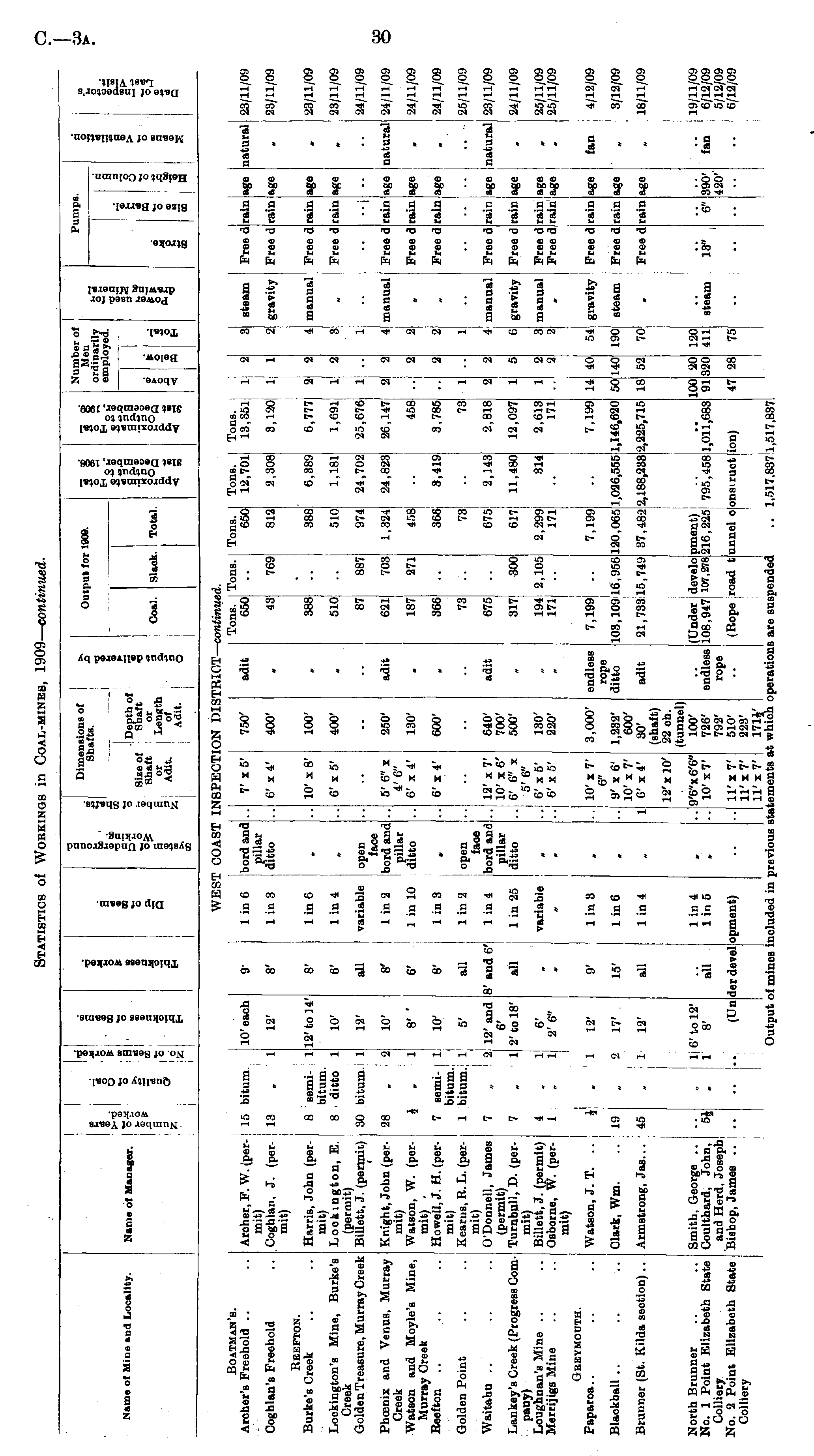 Name of Mine and Locality. Name of Manager. ! c-g I SB ■a % 3 * i I i * i 1 5 'S - 5 d I, & a> Dimensions of 3 Shafts. "o • Depth of r. Size of Shaft j= Shaft or - or I Length S Adit. 1 of 55 j Adit. ; ■a o Output for 1908. O — iil a, x < S3 hi < s Nui on! em mber of Men linarily iployed. H 3 ipe. a 3 6 i I a i a o CO o "I a Coal. Slaok. Total. ! 1 Boatman's. Archer's Freehold Archer, F. W. (permit) . Coghlan, J. (permit) 15 bitum. 10'each 9' 9 I WEST COAST 1 in 6 bord and pillar 1 in 3 ditto INSPECTION DISTRICT— continued. Tons. I Tons. .. 7' x 5' 750' adit 650 .. .. 6' x 4' 400' . 43| 769 Tons. 650 Tons. 12,701 Tons. 13,351 3 steam ] Free d Freed rain age natural 23/ll/0i Coghlan's Freehold 13 . 1 12' 8' 8' 812 2,308 3,120 2 gravity j ] Free d Free d rain age 23/11/0! Reefton. Burke's Creek Harris, John (permit) Look lugton, E. (permit) Billett, J. (permit) 8' 388 6,777 manual ' ] Free d Free d * 23/11/0! 8 semi- 112' to 14' bitum. 8 ditto i 1 10' 8' 6' 1 in 6 .. 10' x 8' 100' . 388i .. 6,389 rain age Lockington's Mine, Burke's Creek Golden Treasure, Murray Creek 6' 1 in 4 .. 6' x 5' 400' . 5io| .. 510 1,181 1,691 ] Free d Free d rain age n 23/11/0! 30 bitum.l 1 12' all all variable open face 1 in 2 bord and pillar 1 in 10 ditto .. .. .. .. 87 887 .. 5' 6" x 250' adit 621 703 4'6" .. 6' x 4' I 130' . 187| 271 974 24,702 25,676 1 •• 24/11/0! Phoenix and Venus, Murray Creek Watson and Moyle's Mine, Murray Creek Beef ton Knight, John (permit) Watson, W. (permit) Howell.J. H. (permit) Kearns, B. L. (permit) O'Donnell, James (permit) Turnbull, D. (permit) Billett, J. (permit) Osborne, W. (permit) 28 . 2 10' 8' 8' I 1,324 24,823 26,147; 4 manual ] Freed Free d rain age natural 24/11/0! I . 1 8' ' 6' 6' 458 458 •2 ] Free d Free d rain age 24/11/0! . 7 semi- 1 10' bitum. 1 bitum. 1 5' 7 „ 2 12' and 6' 7 . 1 2'to 18' 8' all 8' and 6' all 8' 1 in 3 .. 6' x 4' 600' , 366 .. 366J 3,419 3,785 2 ] Free d Free d rain age » 24/11/0! Golden Point all 1 in 2 open faoe 1 in 4 bord and pillar 1 in 25 ditto variable . .. .. .. .. 73 .. .. 12' x 7' 640' adit 675 .. 10' x 6' 700' .. 6' 6" x 500' . 317 300 5'6" .. 6'x5' 130' „ 194 2,105 .. 6' x 5' 220' . 171 .. 73 73 1 25/11/0! ■• Waitahu .. 8' and 6' 675 2,143 2,818 2 manual 1 Freed Freed rain age natural 23/11/0! Lankey's Creek (Progress Company) Loughnan's Mine Merrijigs Mine all 617 11,480 12,097 gravity ] Free d Freed rain age 24/11/0! 4.16' 1.12' 6" 2,299 171 314 2,613 171 1 5 3 2 manual ] Free d T71 J Free d Free d rain rain age age " 25/11/0! 25/11/0! ■• 1 Free d . Gheymouth. 9' 1 in 3 1 in 6 1 in 4 1 in 4 1 in 5 opment) included in previous s .. 10' x 7' 3,000' endless 7,199! .. 6" rope .. 9' x 6' 1,232' ditto 103,10916,956 10' x 7' 600' 1 6'x4' 30' adit 21,73315,749 (shaft) 12'xlO' 22 ch. (tunnel) ..9'6"x6'6" 100' .. (Under develo .. 10' x 7' 726' endless 108,947 107,278 792' rope .. 11' x 7' 510' .. (Rope road t 11' x 7' 223' 11' x 7' 171J' statements at which operations are suspended 7,199 7,199 gravity 1 Free d Free d fan 4/12/0! Faparoa Watson, J. T. i . 1 12' J 9' 14 40 54| rain age Blackball Clark, Wm. 19 19 . 2 17' 15' 15' 120,065 1,026,555 1,146,620 - 140 190J steam ] Free d Free d rain age 3/12/0! Brunner (St. Kilda section).. Armstrong, Jas... 45 45 , 1 12' : all all 37,482 2,188,233 2,225,715 18 52 70 ] Free d Free d rain age 18/11/0! North Brunner No. 1 Point Elizabeth State Colliery No. 2 Point Elizabeth State Colliery Smith. George .. Coulthard, John, and Herd, Joseph Bishop, James .. 1 6'to 12' 5J . 18' •I all (Under 108,947 develo: 107,278 pment) 216,225 795^458 l,0lV,683 X\ 20 320 120 411 steam 13" 6" 390' 420' fan 19/11/0! 6/12/0! 5/12/0! 6/12/0! (Un< der devel (Rope i road t unnel o on struct ion) 47 28 75 •• • • Output 0 of mines i s are susi pended I 1,517,837 1,517,8371
