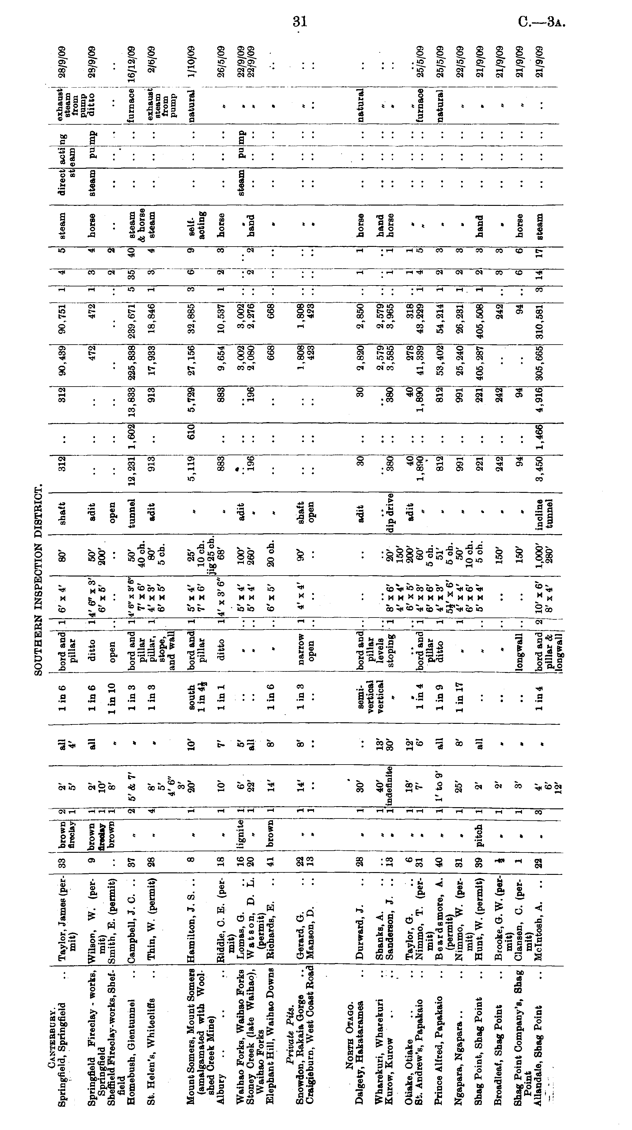 Canterbury. Springfield, Springfield Taylor, James (permit) 38 brown fireclay ■2 1 2' 5' all 4' 1 in 6 bord and pillar 6' x 4' 80' shaft 312 312 90,439 90,751 steam direct st acti earn 11 g exhaust 28/9/0! steam ' ' from pump ditto 2S/9/0! Springfield Fireclay - works, Springfield Sheffield Fireclay- works, Sheffield Homebush, Glentunnel Wilson, W. (permit) Smith, E. (permit) brown fireclay brown 1 1 2' 10' 8' all Iin6 ditto 4' 6" x 3' 6' x5' 50' 200' adit •• 472 472 horse steam pu ,mp 1 in 10 open open 2 " St. Helen's, Whiteoliffs Campbell, J. C. Thin, W. (permit) 37 •28 . 5'& 7' 8' 5' 4' 6" 3' 20' ■ 1 in 3 Iin3 bord and pillar pillar, stope, and wall 4'6"x3'6" 7'x6' 4' x3' 6'x5' 50' 40 ch. 80' 5 ch. tunnel adit 12,231 913 1,602 13,833, 913 225,838 17,933 239,671 18,846 5 1 35 3 40 4 steam & horse steam furnace 16/12/0! exhaust 2/6/0! steam ' ' from pump Mount Somers, Mount Somers (amalgamated with Woolshed Greek Mine) Albury Hamilton, J. S. .. 10' south lin4J bord and pillar 5'x4' 7'x6' 25' 10 ch. jig 25 eh. 68' 5,119 610 5,729 27,156 32,885 selfacting natural 1/10/0! • Waihao Forks, Waihao Forks Stoney Creek (late Waihao), Waihao Forks Elephant Hill, Waihao Downs Riddle, C. E. (permit) Lamas, G. Watson, D. L. (permit) Richards, E. 18 16 •20 lignite l l 10' 6' 22' r 5' all linl ditto 4' x 3' 6" 5'x4' 5'x4' 100' 260' adit 883 196 883 196 9,654 3,002 2,080 10,537 3,002 2,276 "i "2 horse hand steam pu mp : 26/5/Oi 22/9/0! 22/9/0! • • 41 brown 14' s . 1 in 6 • 6'x5' 20 oh. 668 668 * • • Private Pits. Snowdon, Rakaia Gorge Craigieburn, West Coast Road Gerard, G. Maneon, D. 22 13 * l 1 14' s . 1 in 3 narrow open 4' x4' 90 , shaft open 1,808 423 1,808 423 . • ■ .. • • .. North Otago. Dalgety, Hakataramea Durward, J. semivertical vertical 28 30' bord and pillar levels stoping adit 30 30 2,820 2,850] horse natural I Wharekuri, Wharekuri Kurow, Kurow Shanks, A. Sanderson, J. .. 18 !i 40' ndennite 13' 30' i 8'x6' 4' x 4' 6'x5' 4'x3' 6'x6' 4'x3' 5J' x 6' 4' x 4' 6' x6' 5' x4' 20' 150' 200' 60' 5ch. 51' 5 oh. 50' 10 oh. 5 oh. dip drive 3801 '380 2,579 3,585 2,579 3,965 'i 1 hand horse m •• a> Otiake, Otiake St. Andrew's, Papakaio Prince Alfred, Papakaio Taylor, G. Nimmo, T. (permit) Beardsmore, A. (permit) Nimmo, W. (permit) Hunt, W. (permit) G 31 40 • m 1 1 18' r V to 9' 12' 6' all 1 in 4 1 in 'J bord and pillar ditto i adit 40 1,890 812 40 1,890 812 278 41,339 58,402 318 43,229 54,214! 1 1 4 1 5 •3 M furnace natural i 25'/5/0! 25/5/0! Ngapara, Ngapara SI 25' 8' Iinl7 * 991 991 25,240 26,231 1 3 ■ 22/5/0! Shag Point, Shag Point 39 pitch 2' all 221 221 405,287 405,508 1 3 hand . i 21/9/0! Broadleaf, Shag Point Shag Point Company's, Shag Point Allandalo, Shag Point Brooke, G. W. (permit) Glansen, G. (permit) Mclntosh, A. 1 1 * 2' 3' • I - Iongwall 150' 150' * m 242 94 242 94 242 94 G 6 horse „ ! 21/9/0! 21/9/0! 22 4' 6' 12' « 1 in 4 bord and pillar & Iongwall 10' x 6' 8' x4' 1,000' 280' incline tunnel 3,450 1,466 4,916J 305,665 310,581 14 17 steam "■ 21/9/0!