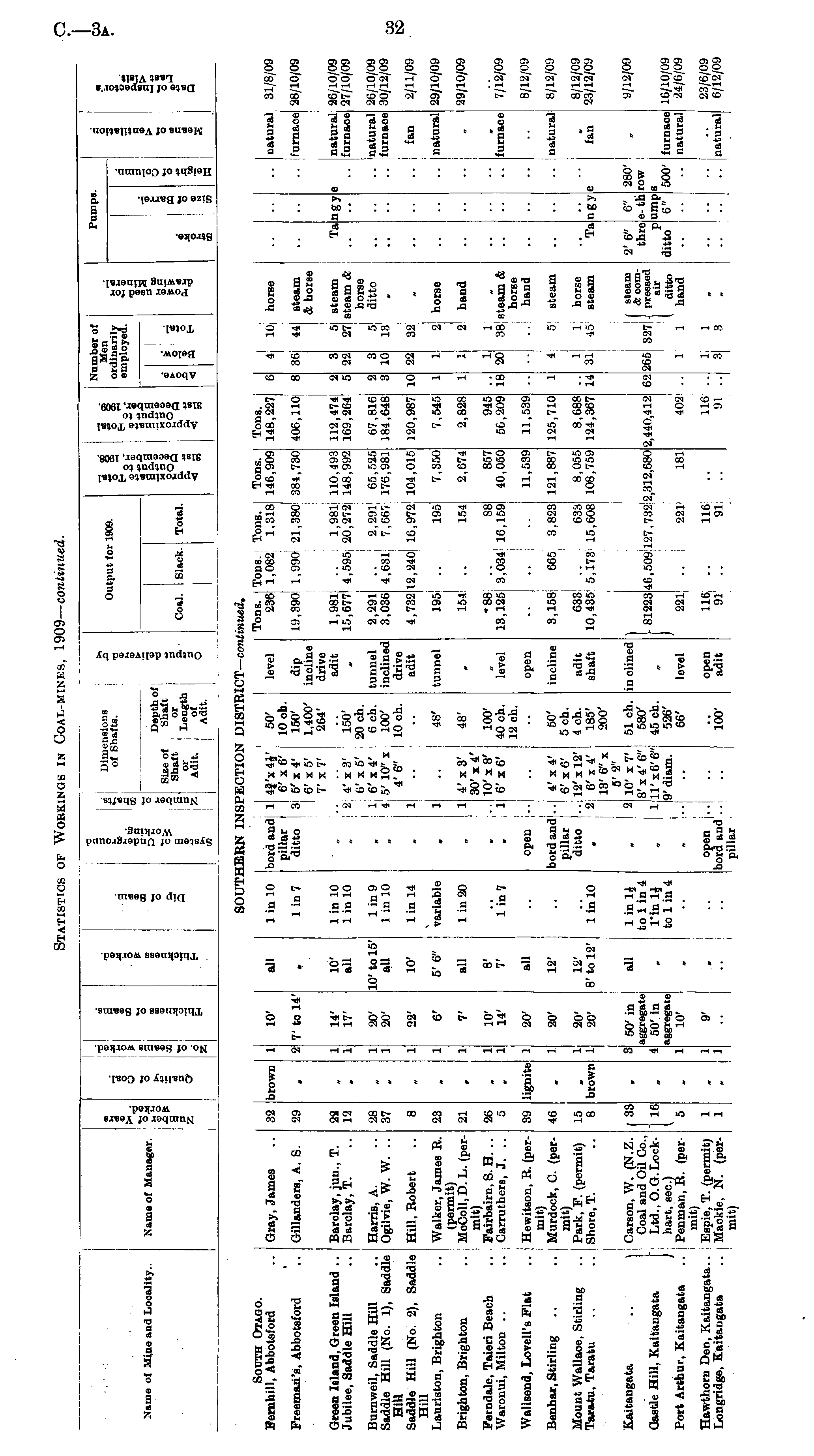Name ot Mine and Locality.. Name of Manager. as r 5•a I I ID o a a CD CD 3 1 a a s o a Sob si a ED 'o Dimensions of Shafts. Depth of Size of Shaft ! Shaft or or Length Adit. of Adit. 3 O Output for 1909. Coal. Slack. Total. II! a 1 Sal W Number of Men ordinarily employed. l|l'« •03 I! 9 Pumps. ! § O s 3 Jm 1 South Otago. Fernhill, Abbotsford .. Gray, James SOUTHERN INS! PECTICHS DISTI ;ICT— con tinned. 1 in 10 bord and 1 pillar 1 in 7 ditto 3 4f'x44' 6' x6' 5'x4' 6' x 5' 7'x7' 50' 10 ch. 150' 1,400' 264' level Tons. 236 Tons. Tons. 1,082 1,318 1,990 21,380 Tons. 146,909 Tons. 148,227 4 10 horse □atural 31/8/09 39 brown 10' all 4 10 • 2<J 7' to 14' dip incline drive adit l'J,39O 384,730 406,110; 36 k; 44 steam & horse 44 furnace 28/10/09 Freeman's, Abbotsford .. Gillanders, A. S. m m Green Island, Green Island .. Barclay, jun., T. Jubilee, Saddle Hill .. Barclay, T. 12 1 l 14' 17' 10' all 1 in 10 1 in 10 „ 8 2 4'x3' 6' x5' 6'x4' 5' 10" x 4'6" 150' 20 ch. 6 ch. 100' 10 ch. 1,981 15,677 l,98li 4,595 2O,272| 110,493 148,992 112,474, 169,264' ■2 5 3 ■22 3 3 5 steam 27 steam & horse 5 ditto 1 o 5 27 Ta ngy e natural furnace 26/10/09 27/10/09 m • • Burnweil, Saddle Hill .. Harris, A. Saddle Hill (No. 1), Saddle Ogilvie, W. W. .. Hill Saddle Hill (No. 2), Saddle Hill, Robert Hill Laui'iston, Brighton .. Walker, James R. (permit) Brighton, Brighton .. McColl.D. L. (permit) Perndale, Taieri Beach .. Fairbairn, S. H. .. Waronui, Milton .. .. Carrutbers, J. .. 28 37 if i 20' 20' 10' to 15' all 1 in 9 „ 1 1 in 10 „ 4 l 4 tunnel inclined drive adit 2,291 3,036 2,291 4,631 7,667 65,525 176,981 67,816 184,648 2 3 3 5 IS natural furnace 26/10/09 30/12/09 m 13 . 8 it 22' 10' 1 in 14 . 1 4,732 12,24o| 16,972 104,015 120,987 10 22 12 32 . 32 fan 2/11/09 23 6' 5'6" variable . 1 48' tunnel 195 195 7,35o| 7,545 1 1 2 horse natural 29/10/09 21 ■> tjt all 1 in 20 . 1 1' x 3' 30' x 4' 10' x 8' 6'x6' 48' 154 154 2,674 2,828 1 1 2 hand m 29/10/09 26 5 1 1 10' 14' 8' 7' Iin7 ". 1 1 100' 40 ch. 12 ch. level ■ 88 13,125 88 3,034 16,159 857 40,050 945 50,209 is A 1 1 38 steam & horse hand m furnace 7/12/09 Wallsend, Lovell's Flat .. Hewitson, R. (permit) Benhar, Stirling .. .. Murdock, C. (permit) Mount Wallace, Stirling .. Park, F. (permit) Taratu, Taratu .. .. Shore, T. ■ 89 lignite 20' all open .. open ! 665 3,823 11,539 11,539 8/12/09 "I •• 46 1 20' 12' bord and .. pillar ditto .. 1 in 10 . 2 4'x4' 6'x6' 12'xl2' 6' x 4' 13' 6" x 5' 2" 10' x V 8' x 4' 6" Il'x6'6" 9' diam. 50' 5 eh. 4 ch. 185' 200' incline 3,158 121,887 125, 710; 1 i 4 5 steam natural 8/12/09 15 8 brown l 1 20' 20' 12' 8' to 12' 2 adit shaft 633 10,435 638 5,173 15,608 8,055 108,759 8,688 124,367 14 1 31 1 11 1 horse i~) steam "Ta •• ngy e fan 8/12/09 23/12/09 Kaitangata .. 1 Carson, W. (N.Z. Coal and Oil Co., Castle Hill, Kaitangata [j Ltd., O.G.Lock- ) hart, sec.) Port Arthur, Kaitangata .. Penman, R. (permit) Hawthorn Den, Kaitangata.. Espie, T. (permit) Longridge, Kaitaugata .. Maokie, N. (per1 mit) 33 16 5 * H 50' in aggregate 50' in aggregate 10' all . I 1 in 14 . 2 to 1 in 4 Tin li . 1 to 1 in 4 51 ch. 580' 45 ch. 526' 66' in clined it level 181293 46,509 127,732J! 221| 2,312,680 t 181 2,440,412 402: G2 265; .5 I steam &com327 - pressed air 1 ditto 1 hand 2'6" thre ditto 6" e-th ump 6" 280' row a 500' * furnace natural 9/12/09 16/10/09 24/6/09 . .. 221, 1 1 m i 9' - open .. bord and .. pillar 100' open adit 116 91 116 91 " 116 91 1 S 1 8 •• 23/6/09 6/12/09 . .. • • .. • • ■ • natural