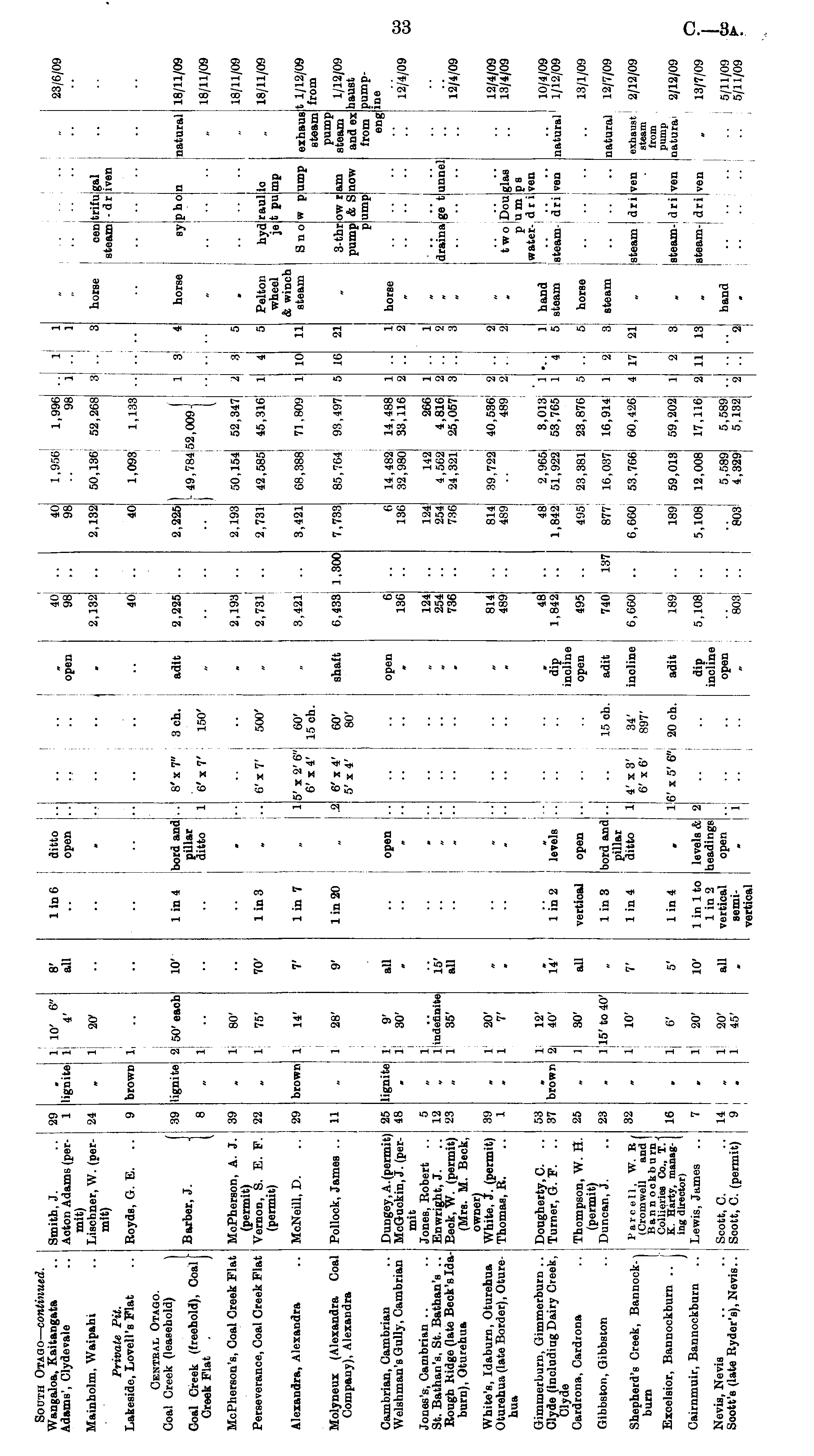 South Otago — continued. Wangaloa, Kaitangata Adams', Clydevale Smith, J. Acton Adams (permit) Lischner, W. (oermit) •29 1 lignite! 1 10' 6" 1 4' 8' all Iin6 ; ditto open open 40J 401 98 1,956 1,996 98 'i 1 1 1 23/6/09 •• •• .. Mainbolm, Waipahi 24 tt 1 2O , m 2,132 2,132 50,136 52,268 a horse cen steam trifu -dr gal iven m 3 Private Pit. Lakeside, Lovell's Plat Royds, G. E. .. browD 1 40 40 1,093 1,133 .. Central Otago. Goal Creek (leasehold) \ Coal Creek (freehold), Coal t Creek Plat . ) Barber, J. J 88 lignite 2 50' eaoh 1 10' 1 in 4 1 bord and pillar ditto 8' x 7" 3 ch. adit 2,225 2,225 [ 49,784 52,0094 horse sy pho n natural 18/11/09 8 6' x 7' 150' 18/11/09 McPherson's, Coal Creek Plat MoPherson, A. J. (permit) Vernon, S. E. P. (permit) 39 1 80' * " 2,193 2.193 50,154 52,347 18/11/09 1 3 I •■ ■ Perseverance, Coal Creek Plat 29 1 75' 70' 1 in 3 6' x 7' 500' 2,731 2,731 42,585 45,316 Pelton wheel & winch steam hyd raul t pu io mp 18/11/09 Alexandra, Alexandra McNeill, D. 29 brown 1 14' V 1 in 7 5' X 2' 6" 60' 6'x4' 15 ch. 3,42l! 3,421 68,388 71,809 10! 11 Sno w p ump exhaust 1/12/09 steam from pump steam 1/12/09 and ex hauet from pumpeng ine Molyneux (Alexandra Coal Company), Alexandra Pollock, James .. 1 28' 9' lin20 6' x 4' 60' 5' x 4' 80' shaft 6,433 1,300 7,733 85,764 93,497 11 2 Lβ 21 3-thr ow r pump & S pump ow r & S ump am now Cambrian, Cambrian Welshman's Gully, Cambrian Jones's, Cambrian St. Bathan's, St. Bathan's .. Bough Kidge (late Beck's Idaburn), Oturehua Dungey, A.(permit) McGuckin, j. (permit Jones, Robert Enwright, J. Beck, W. (permit) (Mrs. M. Beck, owner) White, J. (permit) Thomas, R. 25 48 5 12 23 lignite m 1 9' 1 30' 1 1 indefinite 1 35' all 15' all open . " open m open 6 136 124 254 736 6 136 124 254 736 14,482 14,488 32,9801 33,116 142 266 4,562 4,816 24,321 25,057 l 2 1 2 3 1 2 1 2 3 horse . I draina ge t ge t •■ unnel ! ', 12/4/09 !! 12/4/09 .. .. • • • • White's, Idaburn, Oturehua Oturehua (late Border), Oturehua 98 1 1 20' 1 7' 814 489 814 489 39,722 40,536 489 3 2 2 2 two Dou p um water- d r i 12/4/09 13/4/09 m glas ps ven Gimmerburn, Gimmerburn .. Clyde (includiug Dairy Creek, Clyde Cardrona, Cardrona Dougherty, C. Turner, G. F. 58 37 m brown 1 12' 2, 40' 1 2 14' 1 in 2 J levels j:_ 48 dip 1,842 incline 48 1,842 2,965 3,013 51,922 53,765 1 4 1 5 hand steam 10/4/09 natural 1 1/12/09 " steam- dri dip inclini ven Thompson, W. H. (permit) Duncan, J. 26 1 30' all vertical open .. open open 495 495J 23,381 23,876 5 horse 13/1/09 ■• Gibbston, Gibbston 23 1 15' to 40' 1 in 3 I 1 in 4 bord and pillar ditto 15 oh. adit adit 740 137 877 16,037 16,914 2 3 steam steam dri natural 12/7/09 Shepherd's Creek, Bannock- \ burn Excelsior, Bannockburn .. I Parcell, W. K / (Cromwell and Ba nn ockbnrn ! Collieries Co., T.I K. Harty, managing director) ' Lewis, James 82 m 1 10' V 4'x3' 34' 6' x 6' 897' inclini incline 6,660 6,660 53,766 60,426 17 21 ven exhaust 2/12/09 steam ' from pump uatura 2/12/09 16 1 6' 5' 1 in 4 m 6' x 5' 6" 20 ch. adit adit 189j 189 59,013 59,202 steam-! dri ven 3 Cairnmuir, Bannockburn 7 w 1 20' 10' 1 in 1 to 1 in 2 I vertical semivertical levels & headings open JMm dip ; 5,108 incline open 803 5,108 12,008 17,116 13 steam- dri ven .. dip 11 13/7/09 Nevis, Nevis Soott's (late Ryder's), Nevis.. Scott, C. Scott, C. (permit) 1 20' 1 45' all J inclini 14 9 1 .. 803 5,589 5,589 4,329 5,132 a "2 hand .. .. .. i 5/11/09 5/11/09 . * .. .. I I I I