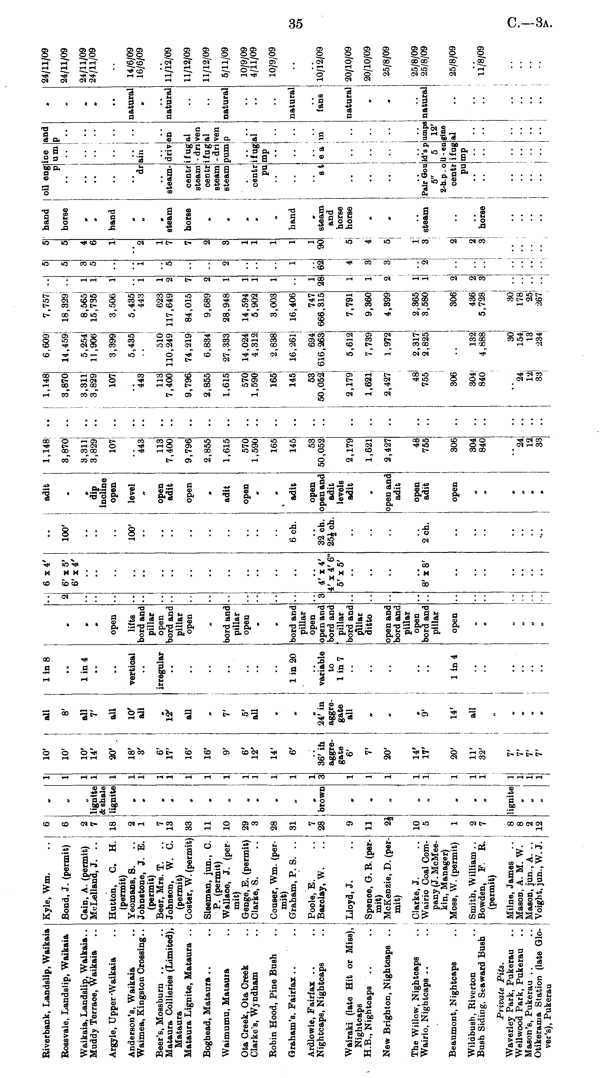 Biverbank, Landslip, Waikaia Kyle, Wm. .. I 6 6 10' all 1 in 8 6x4' adit ; 1,148 I 1,148 6,609 7,757 51 hand oil eng P ioe 1 um 1 Bossvale, Landslip, Waikaia Bond, J. (permit) j 6 G 10' 8' 6' x5' 6'x4' 100' 3,870 3,870] 14,459 18,329 5 horse .. 24/11/09 Waikaia, Landslip, Waikaia.. Muddy Terraoe, Waikaia Cain, A. (permit) 2 McLelland, J. .. 7 2 7 lignite & shale lignite 1 1 10' 14' all 1 in 4 ■ dip incline open 3,311 3,829 3,311 3,829 5,254 11,906 8,565 15,735 1 1 3 5 4 4 6 •• ■• 24/11/09 24/11/09 n> 6 . • • • Argyle, Upper 'Waikaia Anderson's, Waikaia Waimea, Kingston Crossing.. Hutton, C. H. 18 (permit) Yeomans, S. .. 2 Johnstone, J. E. 1 (permit) Beer, Mrs. T. .. 7 Johnson, W. C. 13 (permit) Coster, W. (permit) 33 IS 2 1 7 13 1 1 20' . 18' 3' 6' 17' all 10' all vertical irregular open lifts bord and pillar open bord and pillar open 100' level 107 443 113 7,400 107 '443 113 7,400 3,399' 5,435J 510 110,249 3,506 5,435 443 623 117,649 1 1 "2 1 hand n 2 1 "dr ain natural m 14/6/09 16/6/09 Beer's, Mossburn .. Mataura Collieries (Limited), Mataura Mataura Lignite, Mataura .. * 1 1 12' open adit 1 2 5' 1 7 steam 1 7 steamdriv en natural 11/12/09 33 16' all open 9,796 9,796 74,219 84,015 7 horee 7 centr steam centr steam steam ifug -dri ifug -dri pum |al ven al 11/12/09 Boghead, Mataura Sleeman, jun., C. 11 P. (permit) Wallace, J. (per- 10 mit) Genge, E. (permit) 29 Clarke, S. .. 3 11 * 16' 2,855 2,855; 6,834l 9,689 2 2 11/12/09 2 3 jven natural 5/11/09 Waimumu, Macauta 10 9' 7' bord and pillar open adit 1,615 1,615| 27,333 28,948i 3 . iP Ota Creek, Ota Creek Clarke's, Wjndham 29 3 1 1 6' 12' 5' all open 570 570 1,590 14,024 4,312; 14,594 5,902 1 1 1 1 1 centr ifug mp al" 10/9/09 4/11/09 1 Robin Hood, Pine Bush Couser, Wm. (per- 28 mit) Graham, P. S. .. 31 28 14' 165 165 2,838! 3,003 1 pu 10/9/09 1 31 6' 1 in 20 6ch. • 145 1 hand natural Graham's, Fairfax Ardlowie, Fairfax Nightcaps, Nightcaps Poole, E. .. 7 Barclay, W. .. 28 7 2S J brown I 36' in aggregate 6' 24' in aggregate all variable to Iin7 bord and pillar open open and bord and pillar bord and pillar ditto *3 4' x4' :' X 4' 6" 5' x5' 32 oh. 25 J ch. adit open open and adit levels adit 53 50,052 145 53 50,052 16,261 694; 616,2631 16,406 747 666,315 'I 1 ■28 62 1 90 steam and horse S horse 90, "st I" e a in .. fans J IO/V2/O9 Wairaki (late Hit or Miss), Nightcaps H.B., Nightcaps Lloyd, J. .. 9 9 2,179 2,179 5,612 7,791 natural 20/10/09 Spenoe, G. R. (per- 11 mit) McKenzie, D. (per- 21 mit) 11 t 7' 1,621 1,621 7,739 9,360 4 20/10/09 New Brighton, Nightcaps .. 2J 20' open and bord and pillar open bord and pillar open and adit 2,427 2,427 1,972 4,399 5 25/8/09 The Willow, Nightcaps Wairio, Nightcaps Clarke, J. .. 10 Wairio Coal Com- 5 pany(J.McMeekin, Manager) Moss, W. (permit) 1 10 5 1 1 14' 17' 9' 8' x 8' 2 ch. open adit 48 755 48 755 2,317 2,825 2,365 3,580| 1 1 2 1 3 steam Pair Gou 5" 2-h.p. 0 centr j 5 U-en ifug mp amps 12' Bine al natural 25/8/09 25/8/09 Beaumont, Nightcaps 20' 14' 1 in 4 open open 306i 306 306 2 2 3 horse 25/8/09 Wildbush, Biverton Bush Siding, Seaward Bush Smith, William .. 2 Bowden, F. B. 7 (permit) Milne, James .. 8 Mason, A. M. W. 8 Mason, jun., A. .. 2 Voight,jun.,W.J. 12 11' 32' all 304 840 304! 840 132 4,888 4361 5,728: pu| 1 1 - 11/8/09 * Private Pits. Waverley Park, Pukerau Wellwood Park, Pukerau Mason's, Pukerau .. Otikerama Station (late Glover's), Pukerau lignite " 1 1 1 1 7' 7' 7' 7' 24 12 33 "24 12 33 30 154: 18 234 30 178 25 267 •• 1 .. .. •■ ■• •• - •■ . • . . .. ..