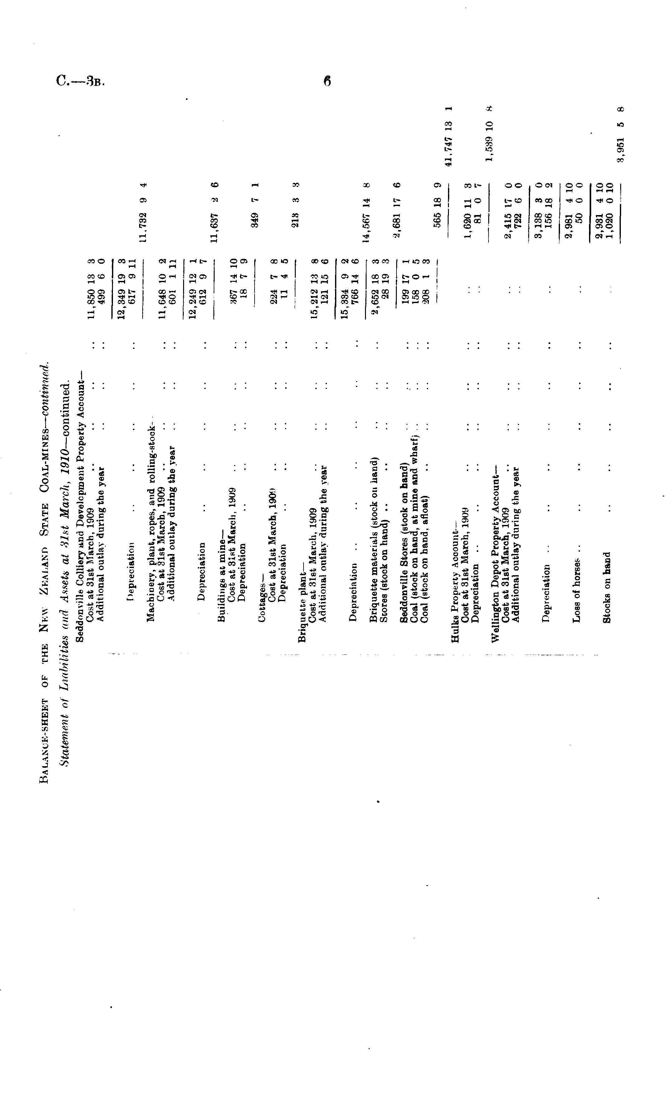 Balance-sheet of the New Zealand State Coal-mines— continued. Statement of Liabilities and Assets at 31st March, 1910— continued. Seddonville Colliery and Development Property Account— Cost at 31st March, 1909 .. .. .. .. 11,850 13 3 Additional outlay during the year .. .. .. 499 6 0 12,349 19 3 l>epieeiation .. .. .. .. 617 9 11 11,732 9 4 Machinery, plant, ropes, and rolling-stock-Cost at 31st March, 1909 .. .. .. 11,648 10 2 Additional outlay during the year .. .. .. 601 111 12,249 12 1 Depreciation .. .. .. 012 9 7 11,637 2 6 Buildings at mme— Cost at 31st March. 1909 .. .. 867 14 10 Depreciation .. .. .. .. 18 7 9 349 7 1 Cottages— Cost at 31st March, 1909 .. .. .. .. 224 7 8 Depreciation .. .. .. .. 114 5 213 3 3 Briquette plant— Cost at 31st Maroh, 1909 .. .. .. .. 15,212 13 8 Additional outlay during the year .. .. .. 121 15 6 15,384 9 2 Depreciation .. .. .. .. .. .. 766 14 6 14,567 14 8 Briquette materials (stock on hand) .. .. 2,652 18 3 Stores (stock on hand) .. .. .. .. 28 19 3 2,681 17 6 Seddonville Stores (stock on hand) .. .. 199 17 1 Coal (stock on hand, at mine and wharf) .. .. 158 0 5 Coal (stock on hand, afloat) .. .. 208 I 3 565 18 9 „ ~ „ , — 41.747 13 1 Hulks Property AccountCost at 31st March, 1909 .. .. .. .. 1,620 11 3 Depreciation .. .. .. .. .. 81 0 7 Wellington Depot Property Account— Cost at 31st March, 1909 .. .. .. 2,415 17 0 Additional outlay during the year .. .. .. 722 G 0 8,138 3 0 Depreciation .. .. .. .. .. .. .. 156 18 2 2,981 4 10 Loss of horses .. .. .. .. .. .. .. 50 0 0 2,931 4 10 Stocks on hand .. .. .. .. .. 1 Q2O 010 3,951 5 8