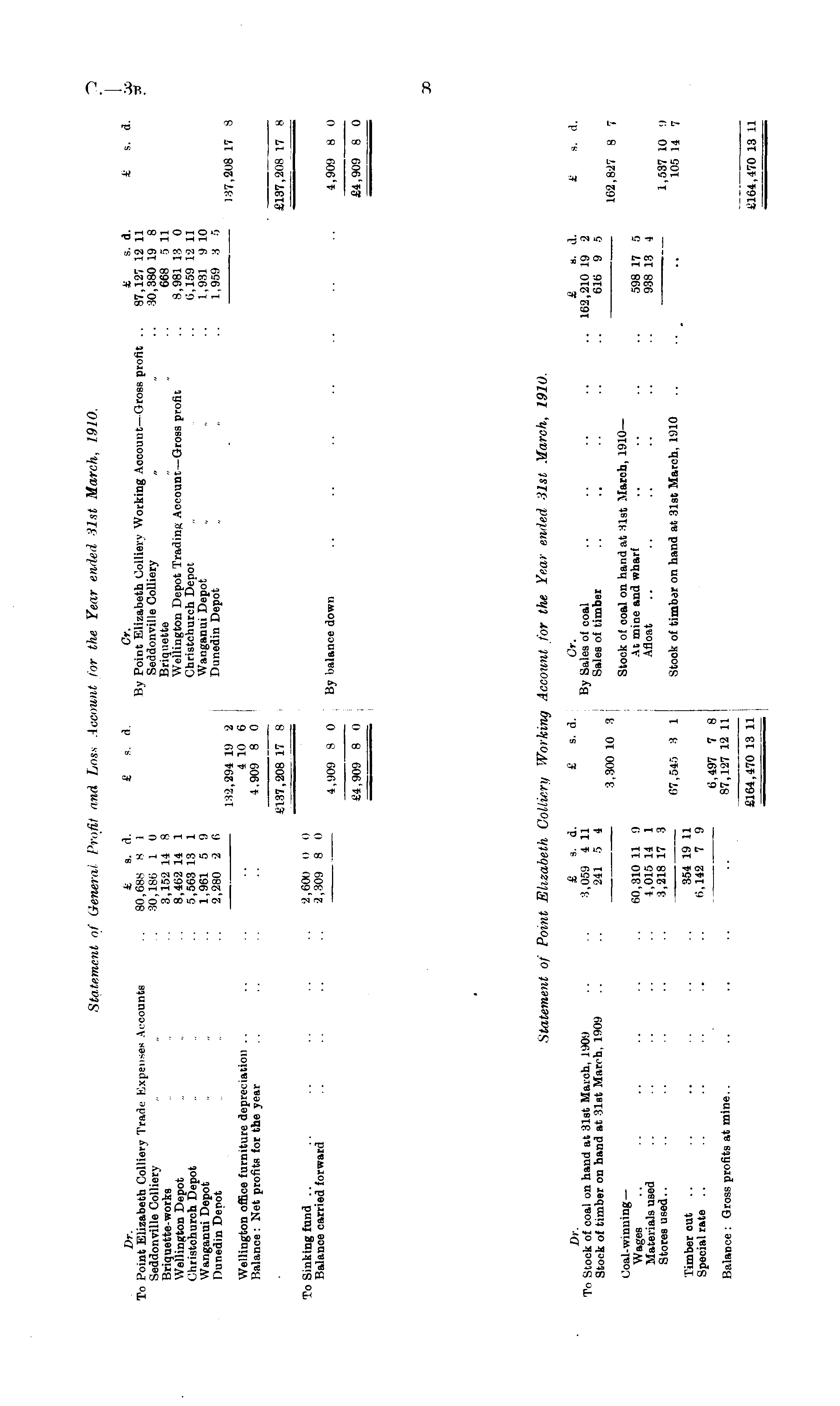 Statement of General Profit and Tjoss Account for the Year ended 31st March, 1910. I),-. £ s. A. £ a. d. Gr. £ s. A. £ s. d. To Point Elizabeth Colliery Trade Kxpenses Accounts .. 80,688 8 1 By Point Elizabeth Colliery Working Account— Gross profit .. 87,127 12 11 Seddonville Colliery . „ 30,186 1 0 Seddonville Colliery „ . .. 30,380 19 8 Briquette-works 3,152 14 8 Briquette . ... 668 5 11 Wellington Depot 8,462 14 1 Wellington Depot Trading Account— Gross profit .. 8,981 13 0 Christchurch Depot „ 5,563 13 1 Christchurch Depot „ .. 6,159 12 11 Wanganui Depot „ 1,961 5 9 Wanganui Depot „ .. 1,931 9 10 Dunedin Deoot 2,280 2 0 Dunedin Depot . „ .. 1,959 3 5 132,294 19 2 • 137,208 17 8 Wellington office furniture depreciation .. .. .. .. 410 6 j Balance: Net profits for the year .. .. 4.909 8 0 £137,208 17 8 £137,208 17 8 To Sinking fund .. .. .. 2,600 o 0 Balance carried forward .. .. .. .. 2,309 8 0 4,909 8 0 By balance down .. .. .. .. .. .. .. 4,909 8 0 £4,909 8 0 | £4,909 8 0 Statement of Point Elizabeth Colliery Working Account for the Year ended 31st March, 1910. Br. £ s. d. £ s. d. Or. £ a. d. £ s. d. To Stock of coal on hand at 31st March, 1909 .. .. 3,059 411 By Sales of coal .. .. .. .. .. 162,210 19 2 Stock of timber on hand at 31st March, 1909 .. 241 5 4 Sales of timber .. .. .. .. .. 616 9 5 3,300 10 3 162,827 8 7 Coal-winning— Stock of coal on hand at 31st Maroh, 1910— Wages .. .. •• •■ •• •• 60,310 11 9At mine and wharf .. .. .. .. 598 17 5 Materials used .. .. .. •• •• 4,015 14 1 Afloat .. .. .. .. .. .. 938 13 4 Stores used.. .. .. •• •• •• 3,218 17 3 1,537 10 9 07,545 3 1 Stook of timber on hand at 31st March, 1910 .. .. .. 105 14 7 Timber out .. .. .. .• ■. 354 19 11 Special rate .. .. .. .. 6,142 7 9 6,497 7 8 Balance: Gross profits at mine.. .. .. .. 87,127 12 11 £164,470 13 11 £164,470 13 11