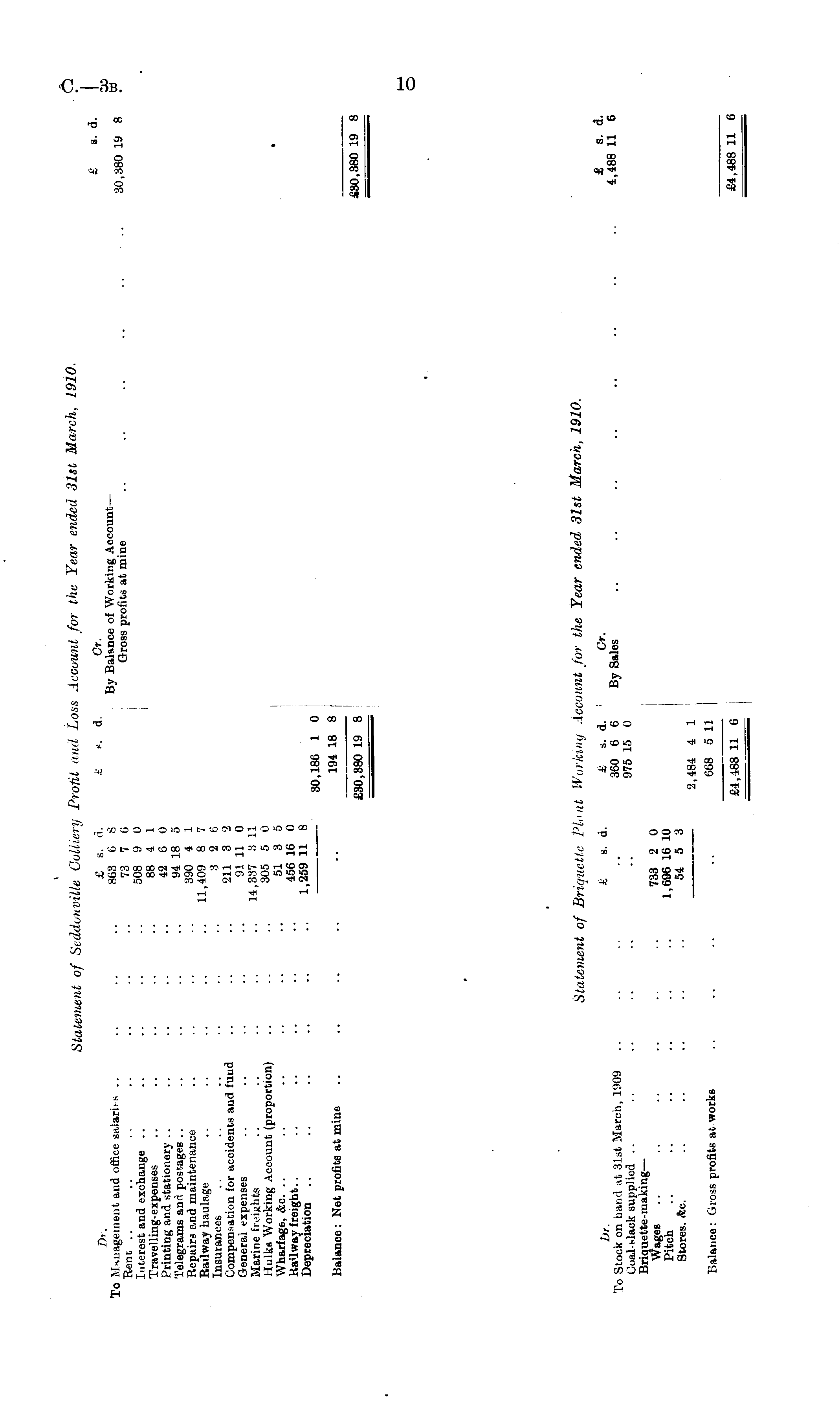 Statement of Seddvnville Colliery Front and Loss Account for the Year ended 31st March, 1910. Interest and exchange .. .. .- •■ •- 508 9 0 Travelling-expenses .. .. •• • • • •88 4 1 Printing and stationery .. .. .. • ■ • •42 6 0 Telegrams and postages .. .. ■. • ■ • •9418 o Repairs and maintenance .. • ■ ■ • ■ • 390 * 1 Railway haulage .. .. .. •• •• 11,409 8 7 Insurances .. .. .. .. • ■ • ■3 2 6 Compensation for accidents and fund .. .. .. 211 3 2 General expenses .. .. .• • • • •9111 0 Marine freights .. .. ■■ •• •■ 14,337 811 Hulks Working Account (proportion) .. .. • • 305 5 0 Wharfage, &c. .. .. .. ■ • • • ■•51 3 5 RaUway freight.. .. .. .. •• •• 456 16 0 Depreciation 30,186 1 0 Balance: Net profits at mine .. .. .. ■ •• • 19i 18 8 I £30T380 19 8 ' g0.380 19 8 Statement of BriquetU Phint Working Account for the Year ended 31st March, 1910. ]j r & a. d. k, a. d. Cr. £ s. d. To Stook on hand at 31st March, 1909 ■• 360 6 6 By Sales 4,488 11 6 Coal-slack supplied .. .. .. •■ ■• •• 975 15 0 Briquette-making— Wages 733 2 0 Pitch 1,696 16 10 Stores, ifec. .. .. .. • • ■ •54 5 3 _ 2,484 4 1 Balance: Gross profits at works .. .. .. .. 668 511 £4,488 11 6 £4,488 11 6