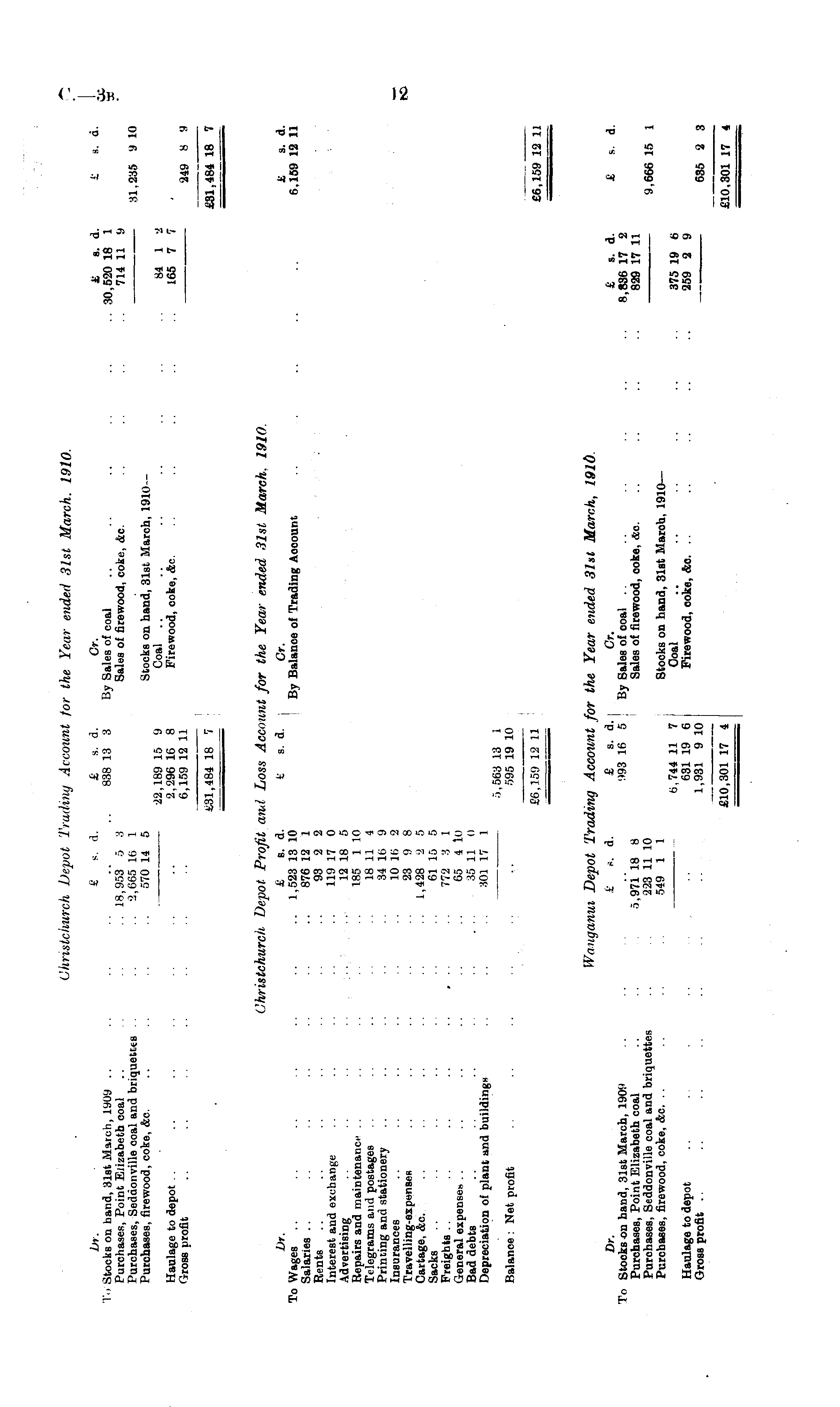Ckristciiurch Depot Trading Account tor the Year ended Slst March. 1910. L>r. & s. d. £ B. d. Cr. £ a. d. i: s. d. T. Stocks on band, 31st March, lyO9 .. .. .. .. .. .. 838 13 3By Sales of coal .. .. .. .. .. .. 30,520 18 1 Purchases, Point Elizabeth coal .. . .. 18,953 5 3 Sales of firewood, coke, &c. .. .. .. .. 714 11 9 Purchases, Seddonville coal and briquetteß .. .. .. 2,665 16 1 31,235 i) 10 Purchases, firewood, coke, &c. .. .. .. .. 570 14 5 Stocks on hand, 31st March, 1910— 22,189 15 9 Coal .. .. .. .. .. .. .. 84 1 2 Haulage to depot . ... .. .. .. .. 2.296 16 8 Firewood, coke, &c. .. .. .. .. .. 165 7 7 Gross profit .. .. .. .. .. .. . . 6,159 12 11 249 8 9 t31,484 18 7 . £31.484 18 7 Ghristchurch Depot Profit ami Loss Account for the Year ended 31st March. 1910. Or. i s. d. t s. d. I Cr. £ s. d. To Wages .. .. .. .. .. .. .. 1,523 13 10 By Balance of Trading Aocount .. ... .. .. 6.159 12 11 Salaries .. .. .. .. .. .. .. 876 12 1 Rents .. .. .. .. .. .. .. 93 2 2 Interest and exchange .. .. .. .. .. 119 17 0 Advertising ......... 12 18 5 Repairs and maintenance .. .. .. . 185 110 Telegrams and postages .. .. .. .. .. 18 11 4 Printing and stationery .. .. . . .. .. 34 16 9 Insurances .. .. .. .. . .1016 2 Travelling-expenaeß .. .. .. .. .. 23 9 8 Cartage, &c. .. .. .. .. .. .. i,428 2 5 Sacks .. .. .. .. .. .. . .6115 5 Freights .. . . .. .. .. ... .. 772 3 1 (ieneral expense . . .. . . .. . . .. 65 410 Bad debts .. .. .. .3511 (I Depreciation of plant and buildings .. .. .. 301 17 1 5,668 13 1 Balance: Net profit . . .. .. .. .. 595 19 10 i £6,159 12 11 £6,159 12 11 Wanganui Depot Trading Account for the Year ended 31st March, WlO. Dr. £ R. d. £ s. d. ! Cr. £ s. d. S, s. d. To Stocks on hand, 31st March, 1909 .. .. .. .. 1>93 16 sBy Sales of coal .. .. .. .. .. .. 8,836 17 2 Purchases, Point Elizabeth coal .. .. 0<971 18 8 Sales of firewood, coke, <fee. .. .. .. .. 829 17 11 Purchases, Seddonviile coal and briquettes .. 223 11 10 9,666 15 1 Purchases, firewood, coke, &c. .. .. .. .. 549 1 1 Stocks on hand, 31st March, 1910— 6,744 11 7 Coal .. .. .. .. .. .. 375 19 6 Haulage to depot .. . . .. ... 631 19 6 Firewood, coke, &c. .. .. .. .. .. 259 2 9 Gross profit .. .. .. .. .. .. 1,931 910 635 2 3 £10,301 17 4 £10,301 17 4