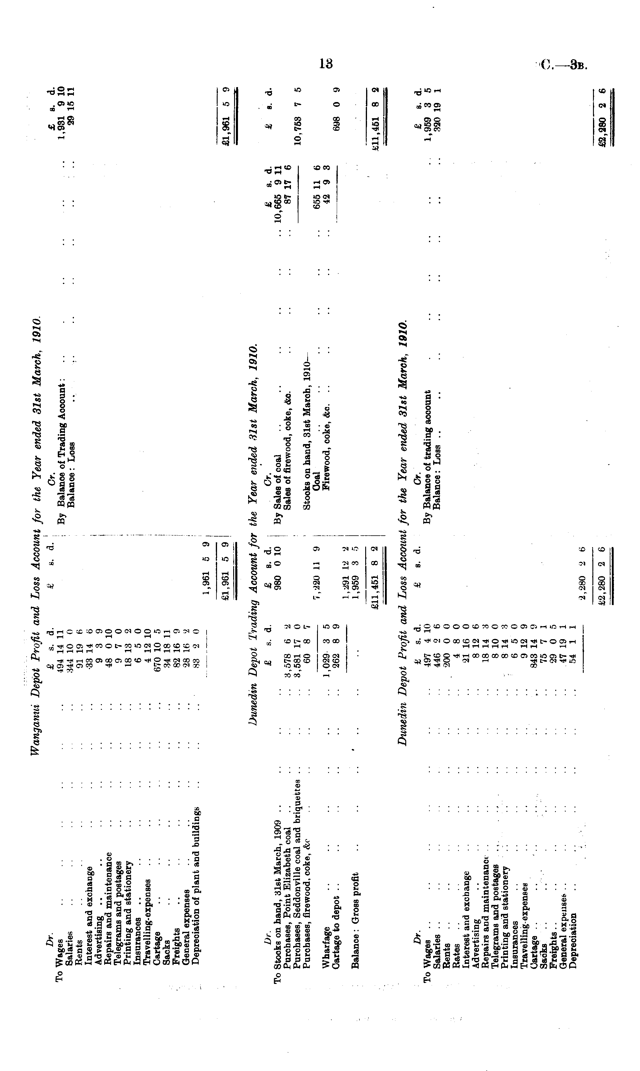 Wanganui Depot Profit and Loss Account for the Year ended 31st March, 1910 Dr. £ s. d. £ s. d. Cr. £ s. d. To Wages .. .. .. 494 14 11 By Balance of Trading Account: .. . .. .. .. .. 1,931 910 Salaries .. .. .. .. .. .. 344 10 o Balance: Loss .. .. .. .. .. .. .. 29 15 11 Rents .. .. .. .. .. .. 91 19 e> Interest and exchange .. .. .. .. -33 14 6 Advertising .. .. .. .. .. .. 939 Repairs and maintenance .. .. .. .. 48 010 Telegrams and postages .. .. .. .. 97 0 Printing and stationery .. . . .. .. 18 13 2 Insurances .. .. .. .. .. .. 650 Travelling-expenses .. .. .. .. .. 412 10 Cartage .. .. .. . . .. .. ej7o 10 5 Sacks .. .. .. .. .. .. 34 18 11 Freights .. .. .. .. .. .. 82 16 9 General expenses .. .. .. .. .. 28 16 '2 Depreciation of plant and buildings .. .. .. 88 8 0 1,961 6 9 £1.961 5 9 £1,961 5 9 Dunedm Depot Trading Account for the Year ended 81st March, 1910. Dr. £ s. d. £ s. d. i Cr. £ s. d. £ 8. d. To Stocks on hand, 31st March, 1909 .. .. .. .. 980 010 By Sales of coal .. .. .. .. .. .. 10,665 911 Purchases, Point Elizabeth coal .. .. . .. 3,578 6 2 Sales of firewood, coke, &o. .. .. .. .. 87 17 6 Purchases, Seddonville coal and briquettes .. .. .. 3,581 17 0 10,753 7 5 Purchases, firewood, coke, &o .. .. .. .. 60 8 7 Stooks on hand, 31st March, 1910— 7,220 U 9 Coal .. .. .. .. .. .. 655 11 6 Wharfage .. .. .. .. .. .. 1,029- 3 5 Firewood, coke, &c. .. .. .. .. .. 42 9 3 Cartage to depot ............ 262 8 9 698 0 9 —— 1,291 12 2 Balance: Gross profit .. .. .. .. .. 1,959 3 5 £11,451 8 2 E11,451 8 2 Duneiin Depot Profit and Loss Account for the Year ended 31st March, 1910. Dr. £ s. d. t s. d. Cr. £ s. d. To Wages .. .. .. .. .. .. .. 497 410 By Balanoe of trading account . .. .. .. .. . 1,959 3 5 Salaries .. .. .... . .. .. 446 2 6 Balance: Loss .. .. .. .. .. .. .. .. 320 19 1 Rents .. .. .. . . .. .. .. 200 0 0 Bates .. .. .. .. .. .. .. 480 Interest and exchange . . .. . . .. .. 21 16 0 Advertising .. .. .. .. .. .. 812 6 Repairs and maintenanci .. .. .. .. .. 18 14 3 Telegrams and postages ~ . .. .. .. 810 o Printing and stationery .. . . . . .. .814 o Insurances .. .. . .. .. .. 650 Travelling expenses .. .. .. . .. 912 9 Cartage .. .. . . .. .. .. .. 843 14 'J Sacks . . .. . . . .. .. .. 75 7 1 Freights.. .. .. .. .. .', .. 29 0 5 General expense!- .. .. .. .. . . .. 47 19 1 Depreciation .. .. .. .. .. . .54 1 1 £2,280 2 6 £2,280 2 6