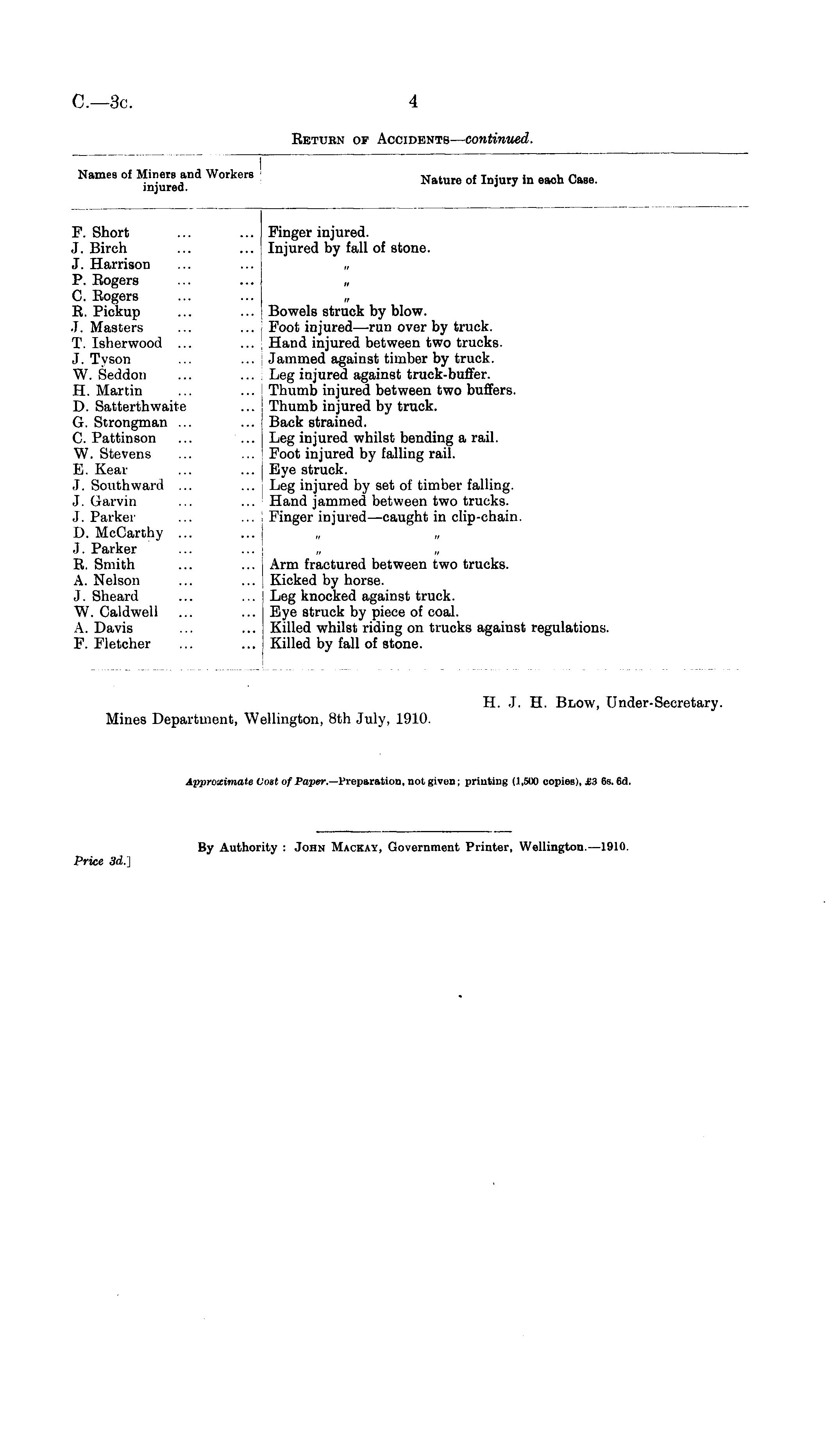 H. J. H. Blow, Under-Secretary Mines Department, Wellington, Bth July, 1910.