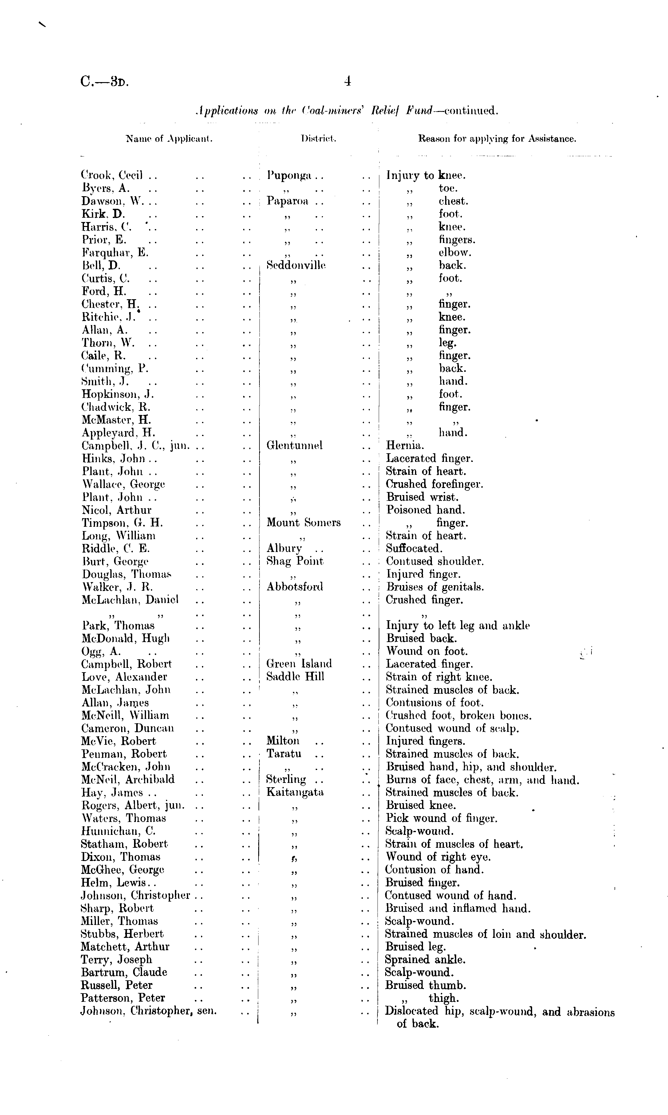 Name of Applicant. District. Reason tor a|i|>lvin<r lor Assistance. Crook. Cecil .. Byers. A. Dawson, \\. Kirk. D Harris. ('.'.. Prior, E. Farquhar, E. Bell, D. Curtis. C. Ford, H Chester. H. .. Ritchie. .I.' .. Allan. A Thorn. \V. Caile, R Cumming, V. Smith. .). Hopkinson. .). Chadwick, K. McMaster, H. Appleyard, H. Campbell, J. ('.. jun. .. Hinks. .John Plant. John Wallace. George Plant, John Nicol. Arthur Timpson, (I. H. Long, William Riddle. C. E. Burt, George Douglas. Thomas Walker. .1. R. McLachlan. Daniel Puponga.. Paparoa .. ,, ,, ,, Seddonville - • j) • • j) • • >> )>. • • 3J • • >S • ' >5 • • >> ' • >5 • • >> • • j> Glentunne] • • >> Mount Somers • • i? Albury .. Shag Point Abbotsford • • >> Injury to knee. ,, boe. „ chest. foot. „ knee. fingers. „ elbow. „ back. ,, foot. >> j) finger. „ knee. finger. leg. finger. ,, hack. ,, hand. „ foot. finger. ,, hand. Hernia. Lacerated finger. Strain of heart. Crushed forefinger. Bruised wrist. Poisoned hand, finger. Strain of heart. Suffocated. ('(mi used shoulder. Injured finger. Bruises of genitals. Crushed finger. 55 >> Park, Thomas McDonald. Hugh < >gg> A Campbell, Robert Love. Alexander McLachlan. John Allan. James McNeill, William ( lameron, Duncan McYie, Robert Penman, Robert McCracken, John McNeil. Archibald Say, James Rogers, Albert, jun. . . Waters. Thomas Hunnichan, C. Statham. Robert Dixon, Thomas McGhee, George Helm, Lewis.. Johnson. ( Ihristopher .. Sharp, Robert .Miller. Thomas Stubbs, Herbert Matchett, Arthur Terry, Joseph Bartrum, Claude Russell, Peter Patterson, Peter Johnson, Christopher, sen. • • >> • • >> • • ?! Green Island .. Saddle Hill 1 I? • • >> ■ ' 55 Milton .. Taratu .. Sterling .. .. ! Kaitangata • • I >> ■ • J • • )) ' ' )> r> • * 7) • * ! J) • ' )5 ■ ■ J) . . : ,j .. • * )) • * J> • * J' •• J „ >> Injury to left lei; and ankle Bruised back. Wound on foot. Lacerated finger. Strain of right knee. St rained muscles of back. Contusions of foot. Crushed foot, broken hones. Contused wound of scalp. Injured fingers. Strained muscles of hack. Bruised hand. hip. and shoulder. Burns of face, chest, arm. and hand. Strained muscles of back. Bruised knee. Pick wound of finger. Scalp-wound. Strain of muscles of heart. Wound of right eye. Contusion of hand. Bruised finger. Contused wound of hand. Bruised and inflamed hand. Scalp-wound. Strained muscles of loin and shoulder. Bruised leg. Sprained ankle. Scalp-wound. Bruised thumb. thigh. Dislocated hip, scalp-wound, and abrasion: of back.