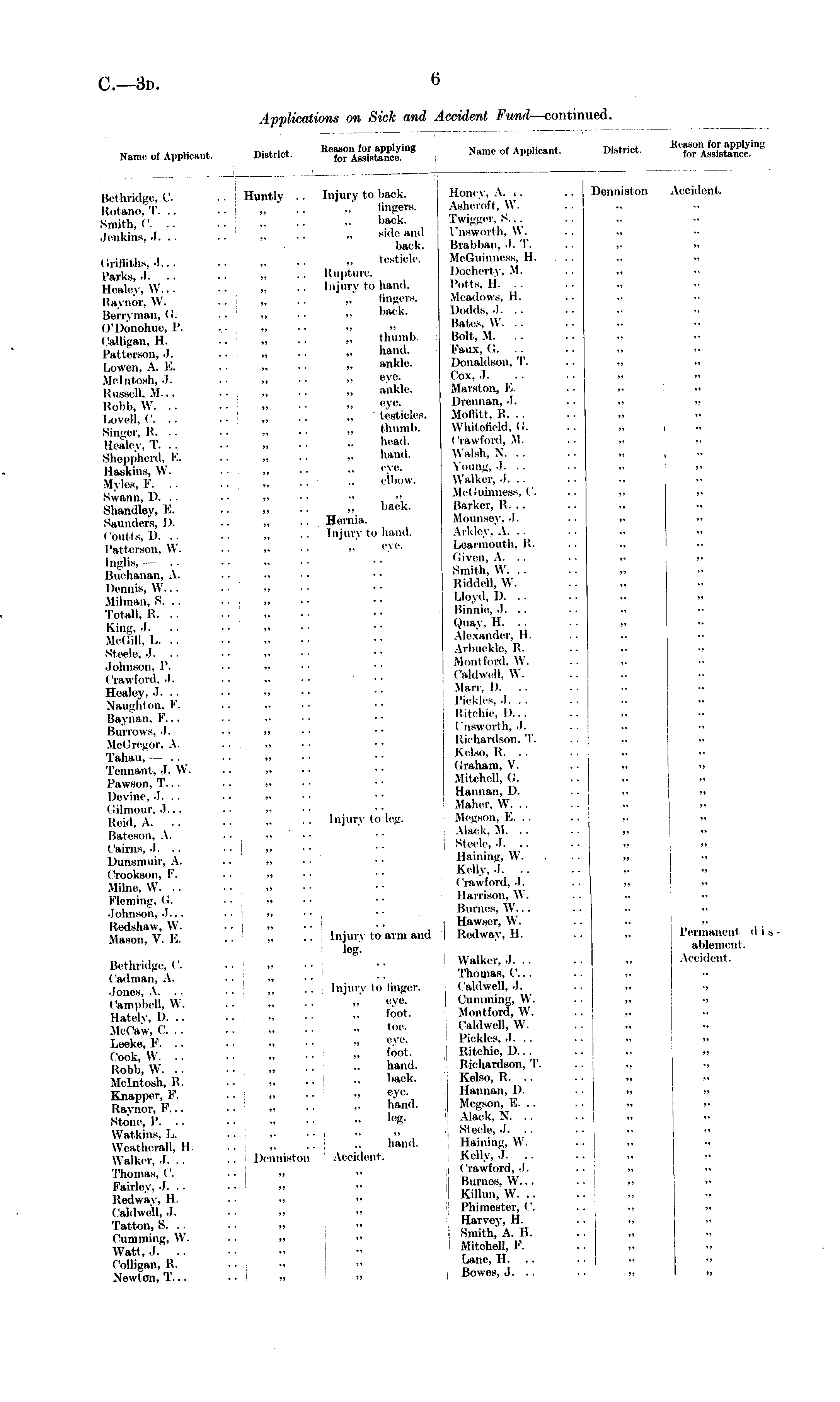Nam, of A,*..™,,,. District. , * N™e of Applic, Name of Applicant. ,nt. Oistrict. Kfason for applying for Assistance. Bethridge, C. •• Huntly .. Injury to l>a<k. Honey, A... Rotano, T „ •■ .. fingers. Asheroft,W. Smith, c btok. rwiggerS. Jenkins, J - ride and Unswortb, W. back. Brabban, ■). 1 • Griffiths, J •• » u ' sticl, '- MKJuiim.-ss h. Parks, J ■• Rupture. Dooherty, M. Healey.W „ •• Injury to hand. Potte, H. .. Raynor, W. ■• „ •• - Sneers. Meadows, H. Berryman,G. .. „ ■• .. back. podds .1. .. O'Donohue, P. ... „ ■• » », ,!.'%, " Calligan, H. .. „ •• .. thumb. *&, SI .. Patterson, J. •■ „ •• » ha " d - i'* 11 *', f" ™ Lowen, A. K. .. „ •• .. a « kl «- Donaldson, T. Molntosh, J. .. ey e - r " x - •'• _•■ Russell. M „ •• » ""Wβ- Mwston.E. Bobb,w „ •• » eye- , i; re ;!" an --'- Lovellc ■• » Wi.U's. Moffltt-ft .. Singer l> •• ». •• ■■ thumb. Whiteneld, G. HeaLev, T. '.'. '■'■ „ •• ■■ J"*"*- < Word. M. Sheppherd,E. .. „ •■ » han(l - Walsh, N. .. Haskins, W. .. eye. Young, J. .. Mvles, K „ •■ ■• elbow. Watter, J. .. Swann, 1) „ •• » . •• McGuinneee, C. Shandley, E .. >J ack - , B , ark( ' r ' R - ■ Baunden, D. .. „ •■ Hernia. Monnsey, J. Ootttts, D „ •• Injury to hand. Arkley, A... Patterson, W. .. „ •• ■■ eye. Loarmonth. l>. Inglis,- .. •• ,, •• •• a ,ve ?'w '• Bu.hanan, A •■ , ;. w :. ■ ' Dennis, W „ ■■ •• K.ddoll \\. Milman, S „ •• ■• H 0 " 1 - ' - ' Totall. R „ •■ •• Binnie,J. .. Kin- I » •• Qu&y, H. .. McGui,l. .. .. „ •■ •• xa '; , l ll 'p 11 ' Steele, J ■• \, 1 >,.<-1<U-. 1. Johnson,P. •• „ •• •• ,", u u Crawford..!. .. „ .. •• Caldwell, W. Healey.J .. •• •• gtarr- D - •• Naughton,F •• • ■ • ■ Bavnan. V •• Hitehic, l>... Burrows,.!. .. „ •• •• nsworth. .1. MoQregor.A. .. „ •• •• Richardson, I. Tahau,-.. .. " •• •• M, 'r' ! V Tennant, J. W. .. „ • • ';':"'»"»• J I'awson.T „ •• •■ MitoheU, G. GilmouV.J „ •• •• al,,r. \\ ij.,: r i a .. lnjiirv to l<'a. Megson, E. .. Bateeon,A ' •• •• v a 'f' ,'• " Cairns, 3 „ •• •• Steele, J. .. Dunsmuir. A. .. „ .. • • 5T n t Crookson, P. •■ .. •• ■• v t ' , V Milne. W , •• •■ Crawford... Plemtog.G. •• >. •• •• amsou.W. Johns,,,.. .1 „ .. •• Burne8,W... Redshaw.W. .. „ •• ■• . I Haw.scr, \\ Mason. V. K. .. „ •• Injury to arm and 1 Kcdway, H. lcji. Bethridge, C. .. „ •■ ■• ,", ,llkrl '■'• • • Ca-lman. A. .. „ ■■ •■ ,'' ' Jones. A „ •■ [njury to finger. (aldwcll. J Campbell, W. .. „ •■ •■ «.™- V,""'," f ""T" u Hately, 1) ., •• - foot - Jf^T ,^, » •• •■ ""■■ ; ,"' - , i ,. P v« v „ eye. Pickles, J. .. IZT'W •■ " Ritchie, U.. Robb,W. I: ■• ,, •■ •• J Richardson,'!'. VUlntosh. K. .. „ •• .. *>«*• Kelso,R. .. Knapper, V. .. „ •• •• eye. , Hannan.D. Raynor, F „ ■• >• '»»"<'• M.rsonlv .. Stone, P , •• .. leg- Ala( ; k - N- ■• Wat kins. I, .. » Steele, J. .. Wcatherall, H. .. , hand. Haming, W. Walker J. .. Dennistoii Accident. Kelly, J. .. Tkniniu (' ., » Crawford, J. i nomas, \ . • • »> _ ... Fairlev. J „ » Kedwav, H. .. » Kill,,,, W caldwell, J. •• -. PhimestenC. Tatton,S „ » f^\\ Cumtiring,W. .. » ,™*' | A , H ' w H i •! Mitohell, I , . f'olligan, K. .... ,. "• ■ • Newton, T I- . » I Bowes, J. .. Denniston »» J? ,» ,» Accident. >> >' »» " >> »t )> Permanent d i t ablement. Accident. „ " »» ,i