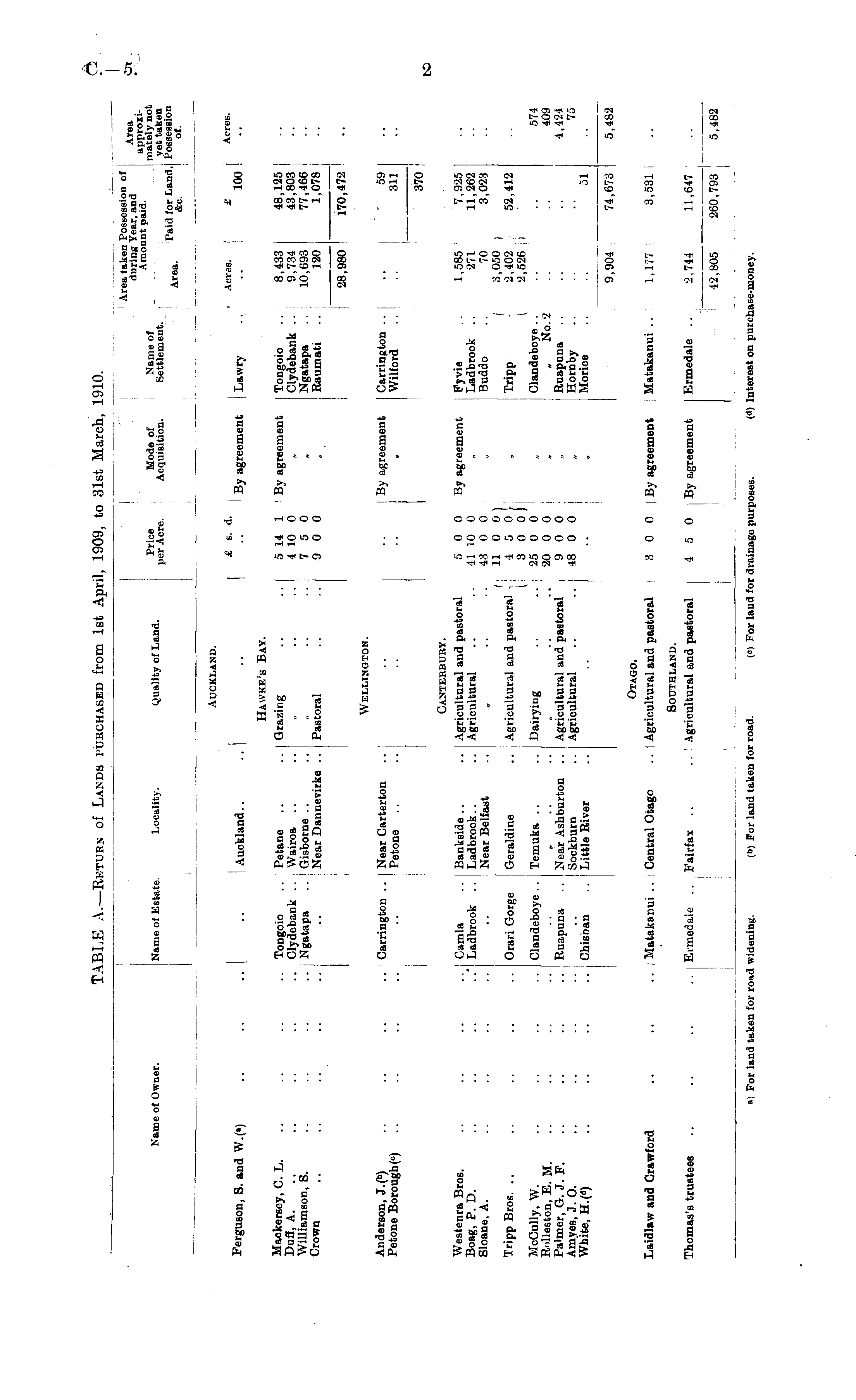 TABLE A.—Return of Lands purchased from 1st April, 1909, to 31st March, 1910.