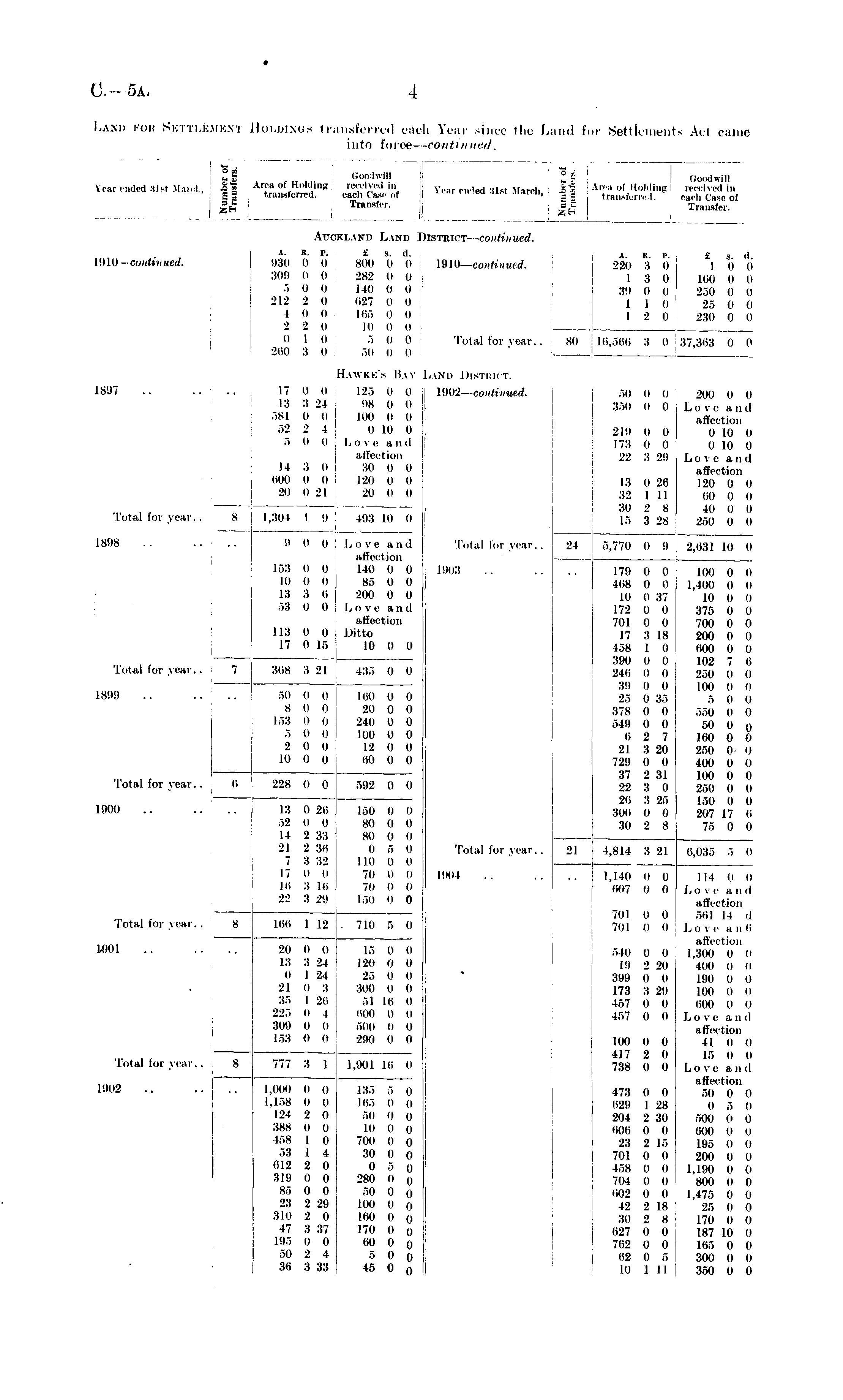 It . ,„ ,,. ''""'"i" It Goodwill tear ended 81st March, Ar ?a '",""'""'-' received In year ended 81st March i* tree of Holding received in 11 transferred. each Case of "'"' '■""'' z= transferred. each Case of j 5£ Transfer. =.-- Transfer. i - I [ I Auckland Land District— continued. A. E. P. £ B, d. I A It I' £ s d \)Vi-continued. 930 (I (I 8IMI ll li 19|0 continued. 220 3 o I ll fj 309 o ii 282 ii o I 3 o 160 o i. 5 0 (I 140 o o ;»., o 0 250 0 0 212 2 (I 627 0 0 1 1 0 25 0 0 4 0 (I 165 0 ll 12 (I 230 0 0 2 2 II 10 (I II 11 I 0 5 0 6 'Total for vear. . 80 16.566 3 0 37,363 0 0 260 3 o 50 O (I . 8(1 16.566 3 0 37,363 (I 0 H iwks's Bay Land Dbtrict. L897 .. .. .. 17 o o 125 0 0 1902 continued. 50 0 0 200 0 0 13 3 21 98 o ii 360 o 0 Love ftnd 581 0 0 KM) 0 0 affection 52 2 I 0 10 0 219 o I) 0 Id (i •> 0 o Love ami 173 n o 0 10 0 affection 22 3 29 Love and II 3 II 30 0 (I affection 600 0 0 j 120 0 li 13 (I 26 120 0 0 20 0 21 20 0 0 32 1 11 60 o o 50 o o 350 (I 0 219 0 0 173 0 (I 22 .3 29 200 o o Love an d affection 0 Id (i 0 10 0 I, i. v e and affection 120 0 0 6(1 0 (I 40 0 0 250 0 (I 13 (I 26 32 1 II 30 2 8 15 3 28 'Total for year. . 1.304 I 9 493 10 0 898 9 0 (I 153 0 0 K 13 3 6 53 (I 0 Love and affection 140 0 0 85 0 II 2IMI 0 0 I, o v c a m il affection Ditto 10 0 0 Total for yefl r . 1903 24 5.770 0 9 179 0 0 408 0 0 III (I 37 172 0 0 701 0 0 17 3 18 458 1 0 391 246 0 (I 39 I) (I 25 0 35 378 0 0 549 0 0 6 2 7 21 3 20 729 (I 0 37 2 31 22 3 0 26 3 25 306 I) o 30 2 8 2,631 10 0 KM! 0 (I 1,400 o ii 10 o o 375 0 0 700 0 0 200 0 0 600 0 0 102 7 (i 250 0 0 100 ii ii 5 0 0 550 0 0 50 (I o 160 0 0 250 0 ii 400 0 0 100 0 0 250 0 (I 150 0 0 207 17 6 75 0 0 113 0 0 17 O I.", 'Tnlal lor year.. 7 368 3 21 435 0 0 1899 50 0 0 8 II 0 153 0 II 5 0 II 2 II 0 10 (I 0 160 ll 0 20 0 0 240 0 0 100 II (I 12 (I 0 60 0 0 'Total for year.. 6 228 0 ll 592 0 II 190(1 13 0 26 52 0 0 14 2 33 21 2 36 7 3 32 17 0 O 16 3 16 22 3 29 15(1 0 II 80 0 (I 80 0 0 II 5 II 110 0 0 70 0 0 70 0 0 150 II 0 'Total lol' year. . 21 4,814 3 21 6.035 5 II 1904 19111 1*»V1 Total for year.. 'Total lor \ car. . 20 II II 13 3 24 0 I 24 21 (I 3 35 I 26 225 0 4 309 (I 0 153 (I 0 777 166 I 12 3 1 710 5 (I 1,901 16 0 15 0 0 120 o 0 25 o o 300 0 0 51 16 0 600 0 0 600 o o 290 II (I 1.140 ll (I 607 (I 0 701 0 0 701 o o 540 o II 19 2 20 399 0 0 173 3 29 457 n li 457 o 0 100 0 0 417 2 0 738 0 0 114 0 (I I. o v e a ii il affection 561 14 il I. o \ e a ii 6 affect ion 1,300 o o 400 0 o 190 0 0 100 0 o 600 0 O I. o v c a n il affection 41 o ii 15 (I O I. o v c a n il affect ion 50 0 0 I) 5 0 500 0 0 60(1 II 0 195 0 (I 200 0 0 1.190 0 0 800 0 0 1,475 0 0 25 0 0 170 (I 0 187 10 0 165 0 0 300 0 (I 350 (I 0 1902 473 0 0 62! I 1 28 204 2 30 606 0 0 23 2 15 701 0 0 458 0 (I 704 0 ll 602 0 0 42 2 18 30 2 8 627 0 0 762 0 0 62 0 5 10 1 II 1.000 (I 0 1.158 (I II 124 2 0 388 0 0 458 | 0 53 1 4 612 2 0 319 (I 0 85 0 0 23 2 29 310 2 (I 47 3 37 195 0 0 50 2 4 36 3 33 135 5 (I 166 o o 60 0 0 10 0 0 700 0 o 30 0 o 0 5 o 280 0 o 50 0 0 100 0 o 160 0 0 170 0 o 60 0 0 5 0 o 45 0 o