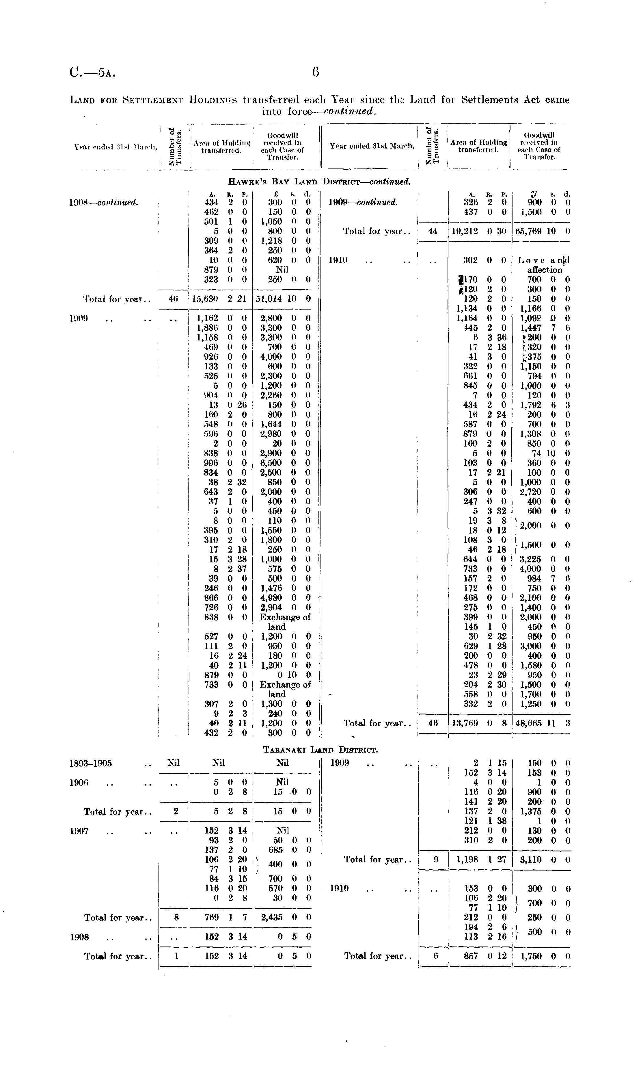 I S,j r i Vear ended :;l-i March, -= L Area i.i Holding i ransferred. Goodwill received in each Case ni Transfer. Vear ended Blsi Harch, '. ° £ _= "g Area of Holding *= ~ transferred, | • (.niMlwill received in each <'nse of Transfer. Haw :r's Bay Lard District — continued. 908 — continued. A. R. P. 434 2 0 462 0 o 501 1 0 5 0 o 309 0 0 364 2 0 10 (I 0 879 0 0 323 0 0 £ H. d. 300 0 0 150 0 0 1,050 0 0 800 0 0 1,218 0 0 250 0 0 620 0 0 Xil 250 0 0 1909— continual. I A. R. 1'. &26 2 0 A. R. I>. 326 2 0 437 0 0 tf s. d. VMM) 0 0 1,600 0 o 'Total for year.. 19,212 0 30 65.769 1(1 (I 1910 302 0 0 Love a njd affection 700 0 0 300 0 0 150 0 o 1,106 0 (I 1,099 o n 1,447 7 6 -200 0 0 320 0 0 0 0 1,150 o 0 794 0 0 1,000 0 0 120 o 0 1,792 6 3 200 0 0 700 0 0 1,308 0 (I 850 0 0 74 10 o 360 0 0 100 0 0 1.000 0 0 2,720 0 0 400 0 (I 600 0 0 909 Total for year.. 16 15,630 2 21 1,162 0 0 1,886 0 0 1,158 0 0 469 0 0 926 0 0 133 0 o 525 0 0 5 0 0 904 o (I 13 o 26 160 2 0 548 0 0 596 0 0 2 0 0 838 (I 0 996 0 0 834 0 0 38 2 32 643 2 0 37 1 0 5 (I 0 8 0 0 395 0 0 310 2 0 17 2 18 15 3 28 8 2 37 39 0 0 246 0 0 866 0 0 726 0 0 838 0 0 527 0 0 111 2 0 16 2 24 40 2 11 879 0 0 733 0 0 307 2 0 9 2 3 40 2 11 , 432 2 0 2,800 0 0 3,300 0 0 3,300 0 0 700 0 0 4,000 0 0 600 0 0 2,300 0 0 1,200 0 0 2,260 0 0 150 0 0 800 0 0 1,644 0 0 2,980 0 0 20 0 0 2,900 0 0 6,500 0 0 2,500 0 0 850 0 0 2,000 0 0 400 0 0 450 0 0 110 0 0 1,550 0 0 1,800 0 0 250 0 0 1,000 0 0 575 0 0 500 0 0 1,476 0 0 4,980 0 0 2,904 0 0 Exchange of land 1,200 0 0 950 0 0 180 0 0 1,200 0 0 0 10 0 Exohange of land 1.300 0 0 240 0 0 1,200 0 o 300 0 0 51,014 10 0 117(1 0 (I 1*12(1 2 0 120 2 0 1,134 0 0 1,164 0 0 445 2 0 6 3 36 17 2 18 41 3 0 322 0 0 661 0 0 845 o 0 7 0 0 434 2 0 16 2 24 587 0 0 879 O 0 160 2 0 5 0 0 103 0 0 17 2 21 5 0 0 306 0 0 247 0 0 5 3 32 19 3 8 18 0 12 108 3 0 46 2 18 644 0 0 733 0 0 157 2 0 172 0 0 468 0 0 275 0 0 399 0 0 145 1 (I 30 2 32 629 1 28 200 0 0 478 0 0 23 2 29 204 2 30 558 0 0 332 2 0 | 2,(MM) 0 0 j 1,500 0 0 3.225 (I 0 1.000 0 0 984 7 0 750 (I (I 2,100 0 0 1,400 0 0 2,000 0 0 450 0 0 950 0 0 3,000 0 0 400 0 (1 1,580 0 0 950 0 0 1,500 0 0 1,700 0 0 1,250 0 0 'Total for year. . 46 13.769 (I 8 48,665 11 3 893-1905 NU Taranaki Land District. Taranaki La 1893-1905 1906 NU NU NU Nil NU 1909 5 0 0 | Nil 0 2 8 | 15 0 0 NU 2 1 15 152 3 14 4 0 0 116 0 20 141 2 20 137 2 0 121 1 38 212 0 0 310 2 0 150 o 0 153 0 0 1 0 0 900 0 0 200 0 0 1,375 0 0 1 0 0 130 (I (I 200 0 0 .906 5 0 0 0 2 8 | Nil 15 0 0 Total for year.. 1907 Total for year.. 2 2 5 2 8 15 0 0 ' , 152 3 14 Nil 93 2 0 ' 50 0 0 137 2 0 685 (I 0 106 2 20 I .„„ „ .. Total for year.. 77 1 10 , wu 84 3 15 700 0 o 116 0 20 570 0 0 191(1 0 2 8 30 0 0 5 2 8 15 0 0 9 1,198 1 27 3,110 0 0 153 0 0 106 2 20 77 1 10 212 0 0 194 2 6 113 2 16 300 0 0 [ 700 0 0 Total for year.. 8 769 1 7 2,435 0 0 769 1 7 2,435 0 0 250 o 0 1908 152 3 14 0 5 0 [ 500 0 II 152 3 14 0 5 0 Total for year. . 1 152 3 14 0 5 0 Total for year.. 152 3 14 0 5 0 Total for year.. 6 857 0 12 1,750 0 0