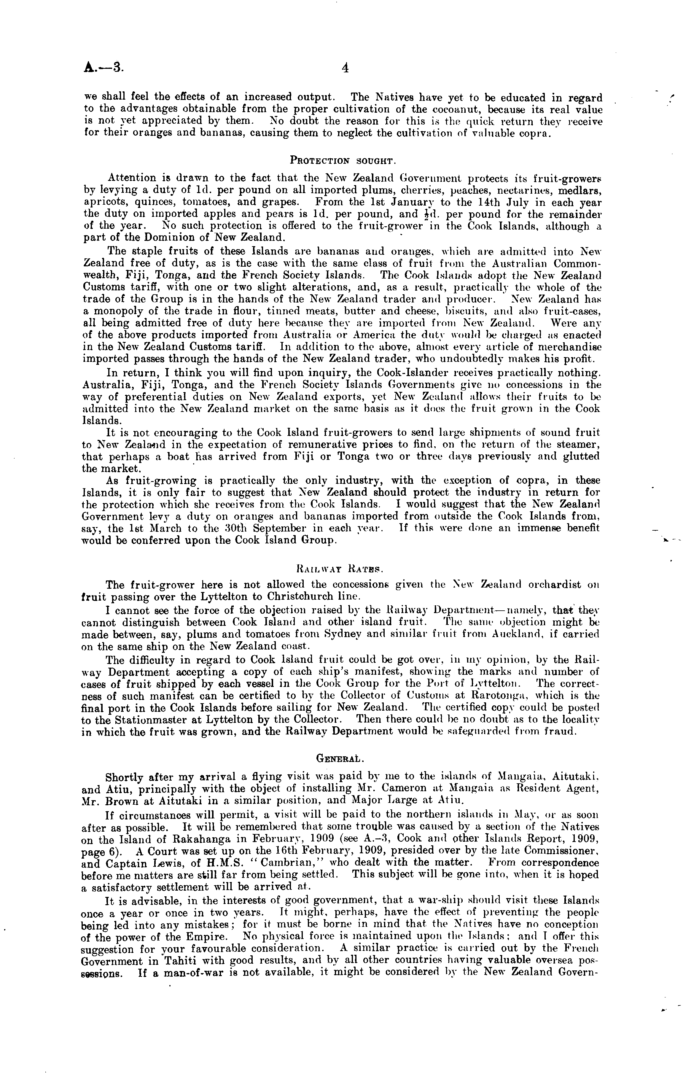 we shall feel the effects of an increased output. The Natives have yet to be educated in regard to the advantages obtainable from the proper cultivation of the cocoanut, because its real value is not yet appreciated by them. No doubt the reason for this is the quick return they receive for their oranges and bananas, causing them to neglect the cultivation of valuable copra. Protection sought. Attention is drawn to the fact that the New Zealand Government protects its fruit-growers by levying a duty of Id. per pound on all imported plums, oherries, peaches, nectarines, medlars, apricots, quinces, tomatoes, and grapes. From the Ist January to the 14th July in each year the duty on imported apples and pears is Id. per pound, and id. per pound for the remainder of the year. No such protection is offered to the fruit-grower in the Cook Islands, although a part of the Dominion of New Zealand. The staple fruits of these Islands are bananas and oranges, which are admitted into New Zealand free of duty, as is the case with the same class of fruit from the Australian Commonwealth, Fiji, Tonga, and the French Society Islands. The Cook Islands adopt the New Zealand Customs tariff, with one or two slight alterations, and, as a result, practically the whole of the trade of the Group is in the hands of the New Zealand trader ami producer. New Zealand has a monopoly of the trade in flour, tinned meats, butter and cheese, biscuits, ami also fruit-cases, all being admitted free of duty here because they are imported from New Zealand. Were any of the above products imported from Australia or America the duty would l>c charged as enacted in the New Zealand Customs tariff. In addition to the above, almost every article of merchandise imported passes through the hands of the New Zealand trader, who undoubtedly makes his profit. In return, I think you will find upon inquiry, the Cook-Islander receives practically nothing. Australia, Fiji, Tonga, and the French Society Islands Governments give no concessions in the way of preferential duties on New Zealand exports, yet New Zealand allows their fruits to be admitted into the New Zealand market on the same basis as it does the fruit grown in the Cook Islands. It is not encouraging to the Cook Island fruit-growers to send large shipments of sound fruit to New Zeala-nd in the expectation of remunerative prices to find, on the return of the steamer, that perhaps a boat has arrived from Fiji or Tonga two or three clays previously and glutted the market. As fruit-growing is practically the only industry, with the exception of copra, in these Islands, it is only fair to suggest that New Zealand should protect the industry in return for the protection which she receives from the Cook Islands, I would suggest that the New Zealand Government levy a duty on oranges ami bananas imported from outside the Cook Islands from, say, the Ist March to the 30th September in each year. If this were done an immense benefit would be conferred upon the Cook Island Group. Railwat Kates'. The fruit-grower here is not allowed the concessions given the New Zealand orchardist on fruit passing over the Lyttelton to Christchurch line. I cannot see the force of the objection raised by the Railway Department namely, that they cannot distinguish between Cook Island and other island fruit. The same objection might be made between, say, plums and tomatoes from Sydney and similar fruit from Auckland, if carried on the same ship on the New Zealand coast. The difficulty in regard to Cook Island fruit could be got over, in my opinion, by the Railway Department accepting a copy of each ship's manifest, showing the marks ami number of cases of fruit shipped by each vessel in the Cook Group for the Port of Lyttelton. The correctness of such manifest can be certified to by the Collector of Customs at Rarotonga, which is the final port in the Cook Islands before sailing for New Zealand. The certified copy could be posted to the Stationmaster at Lyttelton by the Collector. Then there could be no doubt as to the locality in which the fruit, was grown, and the Railway Department would lie safeguarded from fraud. General . Shortly after my arrival a flying visit was paid by me to the islands of Mangaia, Aitutaki. and Atiu, principally with the object of installing Mr. Cameron at Mangaia as Resident Agent. Mr. Brown at Aitutaki in a similar position, and Major Large at Atiu. If circumstances will permit, a visit will be paid to the northern islands in May. or as soon after as possible. It will be remembered that some trouble was caused by a section of the Natives on the Island of Rakahanga in February, 1909 (see A.-3, Cook ami other Islands Report, 1909, page 6). A Court was set up on the 16th February, 1909, presided over by the late Commissioner, and Captain I>ewis, of H.M.S. "Cambrian," who dealt with the matter. From correspondence before me matters are still far from being settled. This subject will he gone into, when it is hoped a satisfactory settlement will be arrived at. It is advisable, in the interests of good government, that a war-ship should visit these Islands once a year or once in two years. It might, perhaps, have the effect of preventing the people being led into any mistakes; for it must be borne in mind that the Natives have no conception of the power of the Empire. No physical force is maintained upon the Islands; and 1 offer this suggestion for your favourable consideration. A similar practice is carried out by the French Government in Tahiti with good results, and by all other countries having valuable oversea possessions. If a man-of-war is not available, it might be considered by the New Zealand Govern-