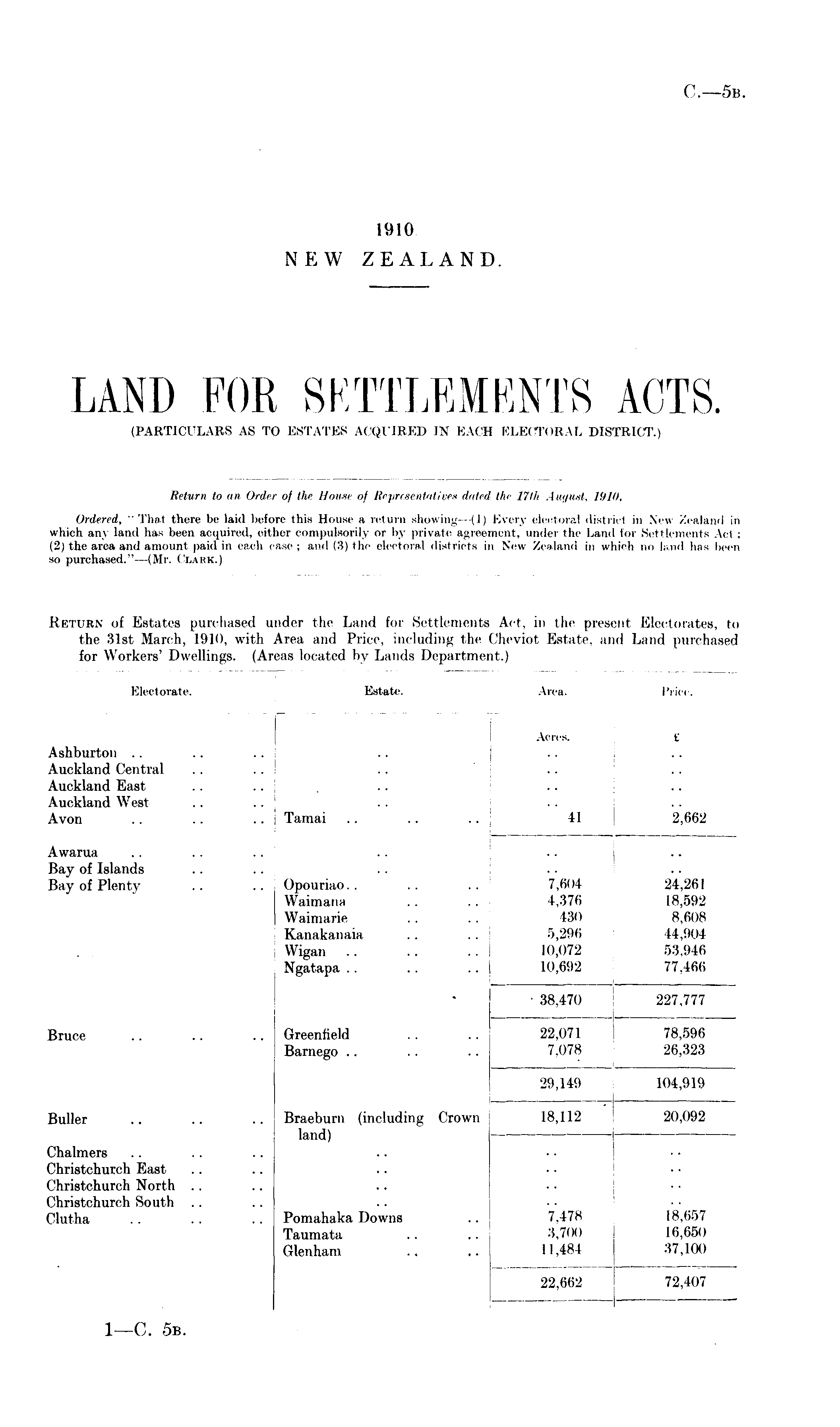 Return of Estates purchased under the Land for Settlements Act, in the present Electorates, to the 31st March, 1910, with Area and Price, including the Cheviot Estate, and Land purchased for Workers' Dwellings. (Areas located by Lands Department.)