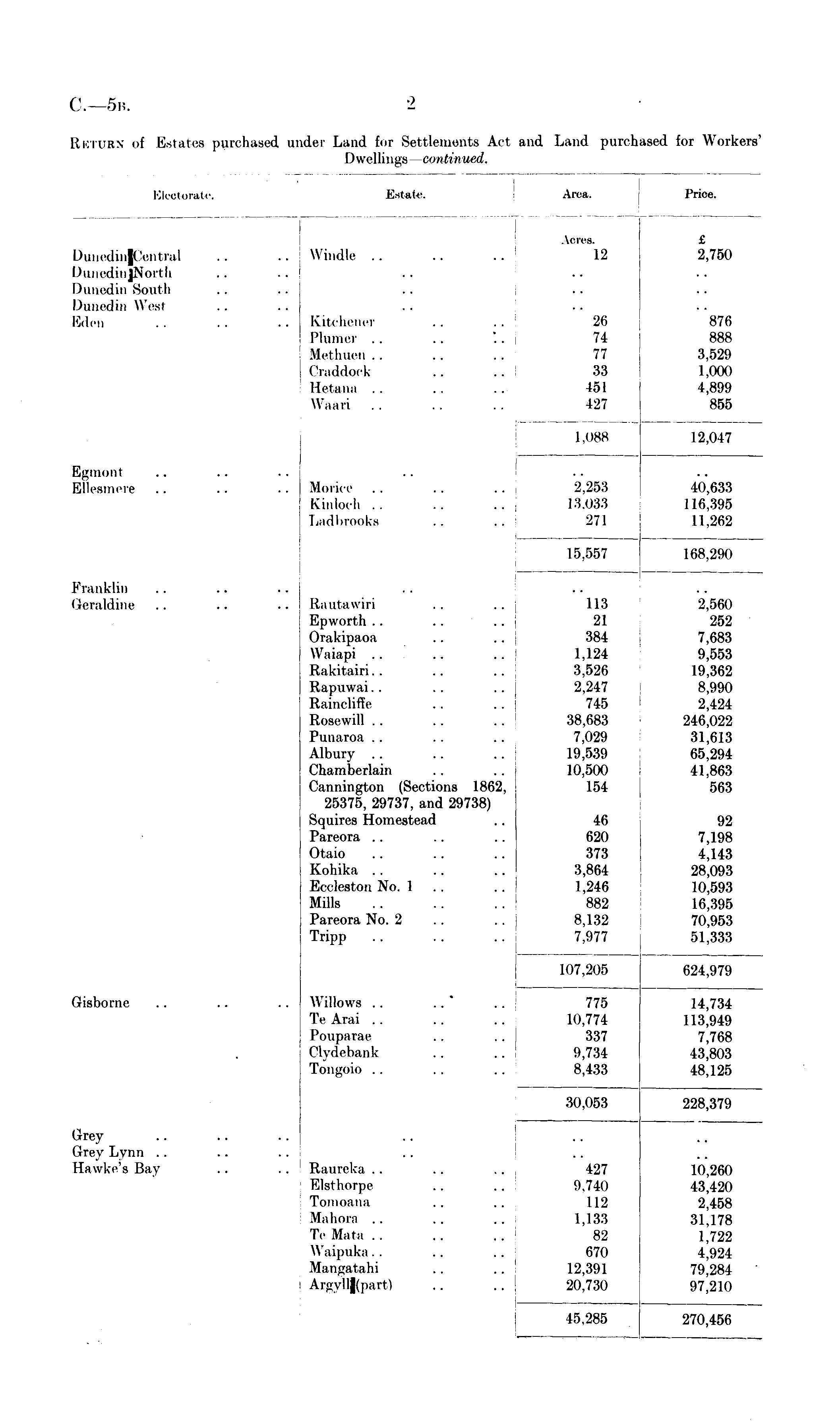 Electorate. Estate. Ana. Price. DunedinKentra) Dunedin jNorth Dunedin South Dunedin Wesl Eden Windle Kitchener Plumer .. .. ". .Met linen ('ruddock . . I letana Waari Acres. 12 26 74 77 33 451 127 £ 2,750 876 888 3,529 1,000 4,899 855 1.088 12,047 Egmonl Ellesmere Morice .. .. Kinloch .. Ladbrooks 2,253 13.033 271 40,633 116,395 11,262 15,557 168,290 Franklin Geraldine Rautawiri Epworth Orakipaoa Waiapi Rakitairi Rapuwai.. Raincliffe Rosewill Punaroa .. .. Albury .. .. .. j Chamberlain .. .. I Cannington (Sections 1862, 25375, 29737, and 29738) Squires Homestead Pareora Otaio Kohika Eccleston No. 1 . . Mills Pareora No. 2 Tripp 113 21 384 1,124 3,526 2,247 745 38,683 7,029 19,539 10,500 154 46 620 373 3,864 1,246 882 8,132 7,977 2,560 252 7,683 9,553 19,362 8,990 2,424 246,022 31,613 65,294 41,863 563 92 7,198 4,143 28,093 10,593 16,395 70,953 51,333 107,205 624,979 Gisborne Willows . . . . * Te Arai .. .. Pouparae .. .. j Clydebank .. .. Tongoio .. .. 775 10,774 337 9,734 8,433 Qn r\K<t 14,734 113,949 7,768 43,803 48,125 Grey Grey Lynn .. Hawke's Bay Raureka Elsthorpe Tomoana Mahora .. .. Te Mata Waipnka Mangatahi .. .. Argyll|(part) .. .. 30,053 427 9,740 112 1,133 82 670 12,391 20,730 30,053 228,379 10,260 43,420 2,458 31,178 1,722 4,924 79,284 97,210 I 45.285 270,456