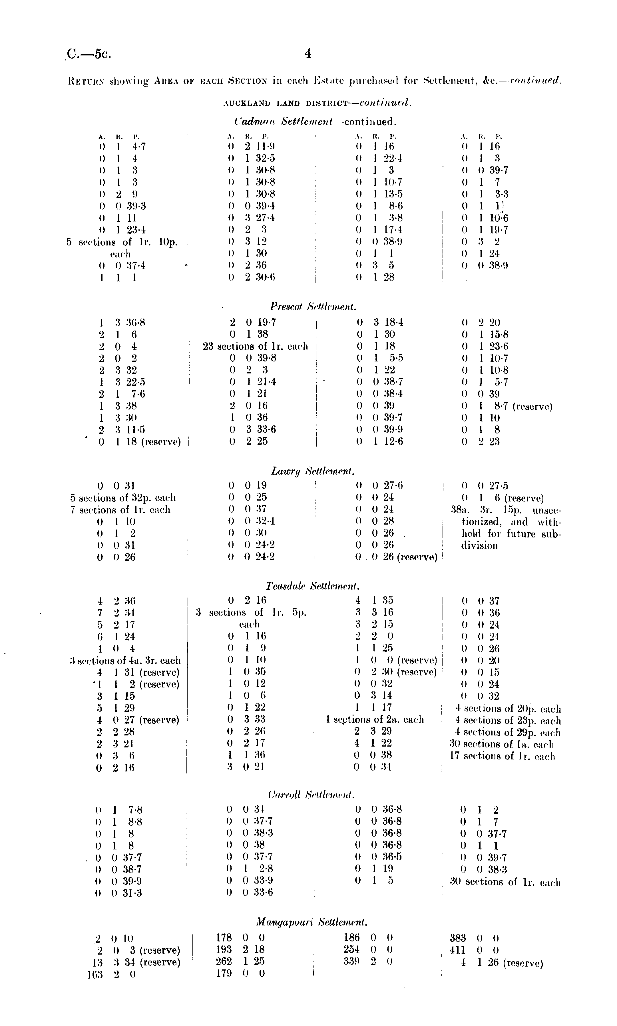 liMTunN showing Area of bacb Section in each Estate purchased for Settlement, he. continued. w CXI.AND LAND DISTRICT-- niii/iiilied. < 'adman Settlement —continued. a. h. p. A. R. p. \. n. p. A. 11. p. 0 I 4-7 0 2 11-9 0 I 16 o I 16 0 14 0 1 32-5 O I 221 0 1 3 0 13 oi 30-8 0 13 0 0 89-7 0 13 0 1 30-8 0 I 10-7 0 I 7 0 2 9 0 1 30-8 0 1 13-5 0 1 3-3 0 0 39-3 0 0 39-1 0 18-6 Oil! 0 111 0 3 27-1 0 I 3-8 0 1 10-6 0 1 23-4 0 2 3 0 1 17-4 0 1 19-7 5 sections of lr. 10p. i 0 3 12 0 0 38-9 0 3 2 each 0 I 30 0 II 0 I 24 0 0 37-4 ■ 0 2 36 0 3 5 0 0 38-9 111 02 30-6 0 1 28 Prescot Settlement. 1 3 368 2 0 19-7 | 0 3 18-4 0 2 20 2 16 0 1 38 0 1 30 0 1 15-8 2 0 4 28 sections of lr. each 0 1 18 0 1 23-6 2 0 2 0 0 39-8 o 1 5-5 0 1 10-7 2 3 32 o 2 3 0 1 22 o I 10-8 1 3 22-5 o I 21-4 0 0 38-7 0 1 5-7 2 I 7-6 0 1 21 0 0 38-4 0 0 39 I 3 38 2 0 16 0 0 39 0 I 8-7 (reserve) 1 3 30 I 036 o o 39-7 0 1 lo 2 3 11-5 0 3 33-6 0 0 39-9 0 18 o I 18 (reserve) 0 2 25 0 I 12-6 0 2 2.". La/Wry Settlement. 0 0 31 o O 19 0 0 27-6 0 0 27-5 5 sections of 32p. each 0 0 25 0 0 24 o 1 6 (reserve) 7 sections of lr. each 0 037 0 o 21 38a. 3r. Isp. unsec--0 I 10 0 0 32-4 0 028 lionized, and with 0 I 2 0 0 30 0 O 26 held for future sub--0 0 31 0 0 21-2 0 0 26 division Q 0 26 o l) 24-2 O O 26 (reserve) Tensihile Settlement. 1 2 36 0 2 16 I I 35 I 0 0 37 7 2 31 3 sections of lr. sp. 3 3 16 () (I 36 5 2 17 each 3 2 15 (I II 21 6 121 0 I 16 2 2 0 0 o 21 10 4 0 19 II 25 0 0 26 3 sections of 4a. 3r. each 0 I lo I 0 o (reserve) o 020 I I 31 (reserve) 1 0 35 0 2 30 (reserve) 0 0 15 •112 (reserve) I 012 0 0 32 0 0 24 3 I 15 1 o 6 0 3 II 00 32 5 I 29 0 I 22 II 17 I sections of 20p. each 1 O 27 (reserve) 0 3 33 4 sections of 2a. each 4 sections of 23p. each 2 2 28 0 2 26 2 3 29 I sections of 29p. each 2 3 21 o 2 17 4 1 22 30 sections of la. each 0 3 6 1 I 36 0 0 38 17 sections of lr. each 0 2 16 3 0 21 0 0 34 ('arrtill Settlement. (1 1 7-8 0 0 31 0 0 36-8 0 1 2 0 1 8-8 0 0 37-7 0 0 36-8 0 1 7 0 18 0 0 38-3 0 0 36-8 0 0 37-7 0 18 o 0 38 0 0 36-8 0 1 1 11 0 37-7 0 0 37-7 0 0 36-5 0 0 39-7 (i 0 38-7 o I 2-8 0 1 19 0 0 38-3 0 0 39-9 0 0 33-9 0 1 5 30 sections of lr. each 0 0 31-3 0 0 33-6 Manga-pouri Settlement. 2 0 lo 178 0 0 186 0 0 383 0 0 2 0 3 (reserve) L 93 2 18 251 0 0 111 0 0 13 334 (reserve) 262 125 339 2 0 4 1 26 (reserve) 163 2 0 179 0 0 \