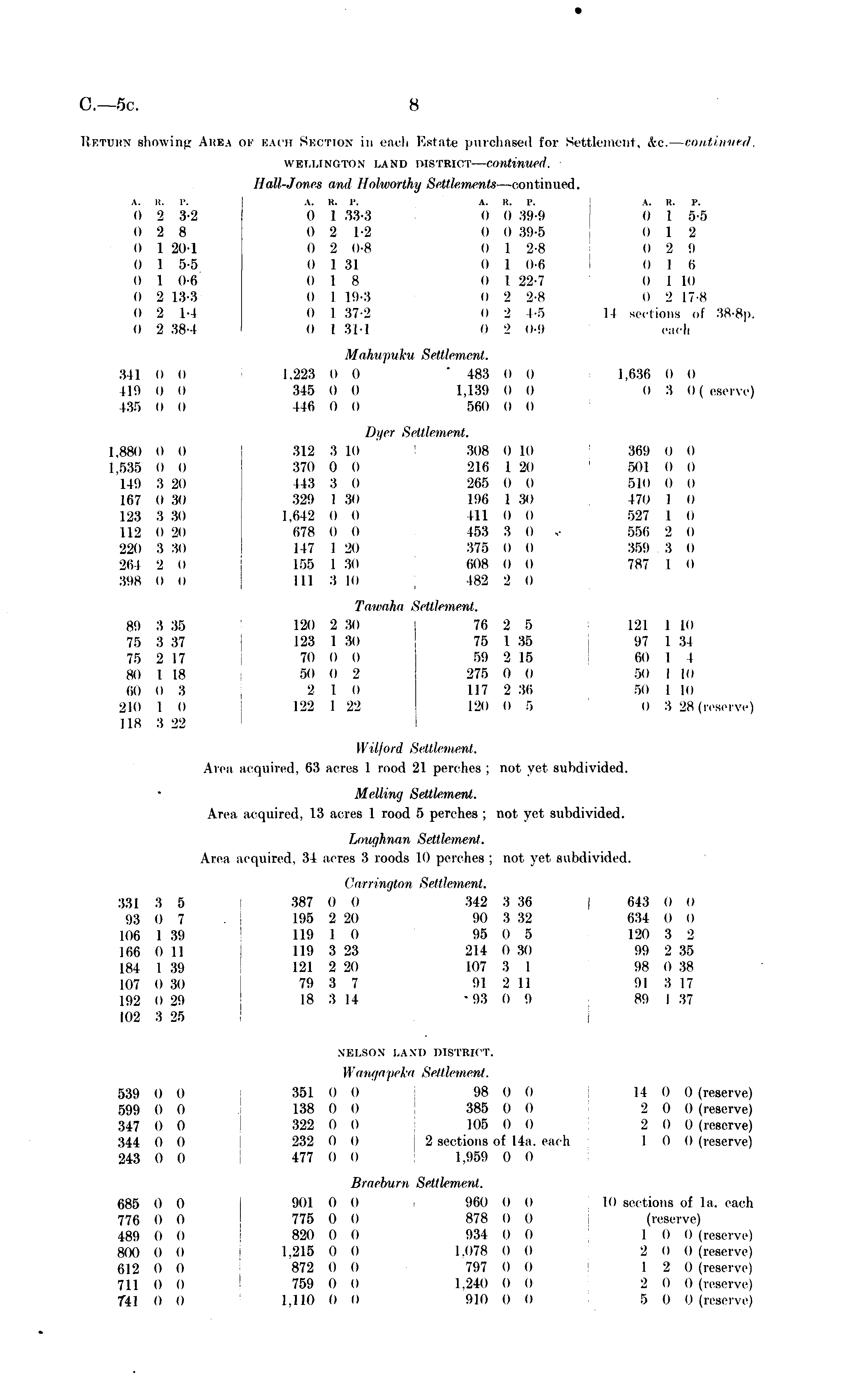 Return showing Area of each Section in each Estate purchased for Settlement, he. -continued. WELLINGTON LAND DISTRICT — continued. Hall-Jones and Hohoorthy Settlements —continued. A. K. P. A. li. P. A. R, 1". A. 11. P. 0 2 3-2 0 I -33-3 0 0 39-9 0 I 5-5 0 2 8 0 2 1-2 0 0 39-5 it 1 2 0 1 20-1 0 2 0-8 0 1 2-8 0 2 9 0 1 5-5 0 I 31 0 1 0-6 0 I 6 0 1 0-6 0 18 0 1 22-7 o I 10 0 2 13-3 0 I 19-3 0 2 2-8 n 2 17-8 o 2 1-4 0 I 37-2 0 2 1-5 I I sections of 38-Bp. o 2 381 o I 31-1 o 2 o-9 each Mahwpuku Settlement. 341 0 0 1.223 o o 483 0 0 1.636 0 0 119 o o 315 o o 1,139 o o o 3 ()( eserve) 13,5 o o 116 i) o 560 o o Dyer Settlement. 1,880 0 0 312 3 10 308 0 10 369 I) 0 1.535 o 0 370 0 0 216 1 20 501 o o 119 3 20 443 3 0 265 0 0 510 o o 167 030 329 1 30 196 1 30 470 I o 123 3 3o 1,642 0 0 411 0 o 527 1 0 112 0 20 678 0 0 153 3 0 556 2 0 220 3 30 147 1 20 375 0 0 359 3 o 264 2 0 155 1 30 608 0 0 787 1 0 398 0 0 111 3 10 182 2 0 Titiea/ai Settlement. 89 3 35 120 2 30 76 2 5 121 I 10 75 3, 37 123 I 30 75 I 35 97 I 34 75 2 17 70 o o 59 2 15 60 I I 80 1 18 50 0 2 275 0 0 50 I |() (10 i) 3 2 10 117 236 s(i I 10 210 I o 122 1 22 120 o 5 o 3 28 (reserve) 118 3 22 Wilford Settlement. Area acquired, 63 acres 1 rood 21 perches: not yet subdivided. Mellimj Settlement. Area acquired. 13 acres 1 rood 5 perches ; not yet subdivided. Loughnan Settlement. Area acquired, 34 acres 3 roods 10 perches ; not yet subdivided. Ciim'ni/tim Settlement. 331 3 5 387 0 0 342 3 36 | 643 0 0 93 0 7 . 195 2 20 90 3 32 634 0 0 106 1 39 119 1 0 95 0 5 120 3 2 166 o 11 119 3 23 214 0 30 99 2 35 184 1 39 121 2 20 107 3 I 98 038 107 o 30 79 3 7 91 2 II 91 3 17 192 0 29 18 3 14 -93 0 9 89 I 37 102 3 25 NELSON I.AM) DISTRICT. Wangafeka Settlement. 539 0 o 351 0 o 98 0 o 14 0 0 (reserve) 599 0 0 138 0 0 385 0 O 2 0 0 (reserve) 347 0 0 322 0 0 106 0 0 2 0 o (reserve) 344 o o 232 0 0 2 sections of 14a. each 1 0 0 (reserve) 243 0 0 477 0 0 1.959 0 0 liraehitrn Settlement. 685 0 0 901 0 o 960 0 0 lo sections of la. each 776 0 0 775 0 0 878 0 0 (reserve) 489 o 0 820 o o 934 o o 1 o o (reserve) 800 0 0 1-215 0 0 1.078 0 0 2 0 0 (reserve) 612 0 0 872 0 0 797 0 0 1 2 0 (reserve) 711 0 0 759 0 0 1.240 0 0 2 0 0 (reserve) 741 0 o 1.110 0 0 910 O 0 5 0 0 (reserve)