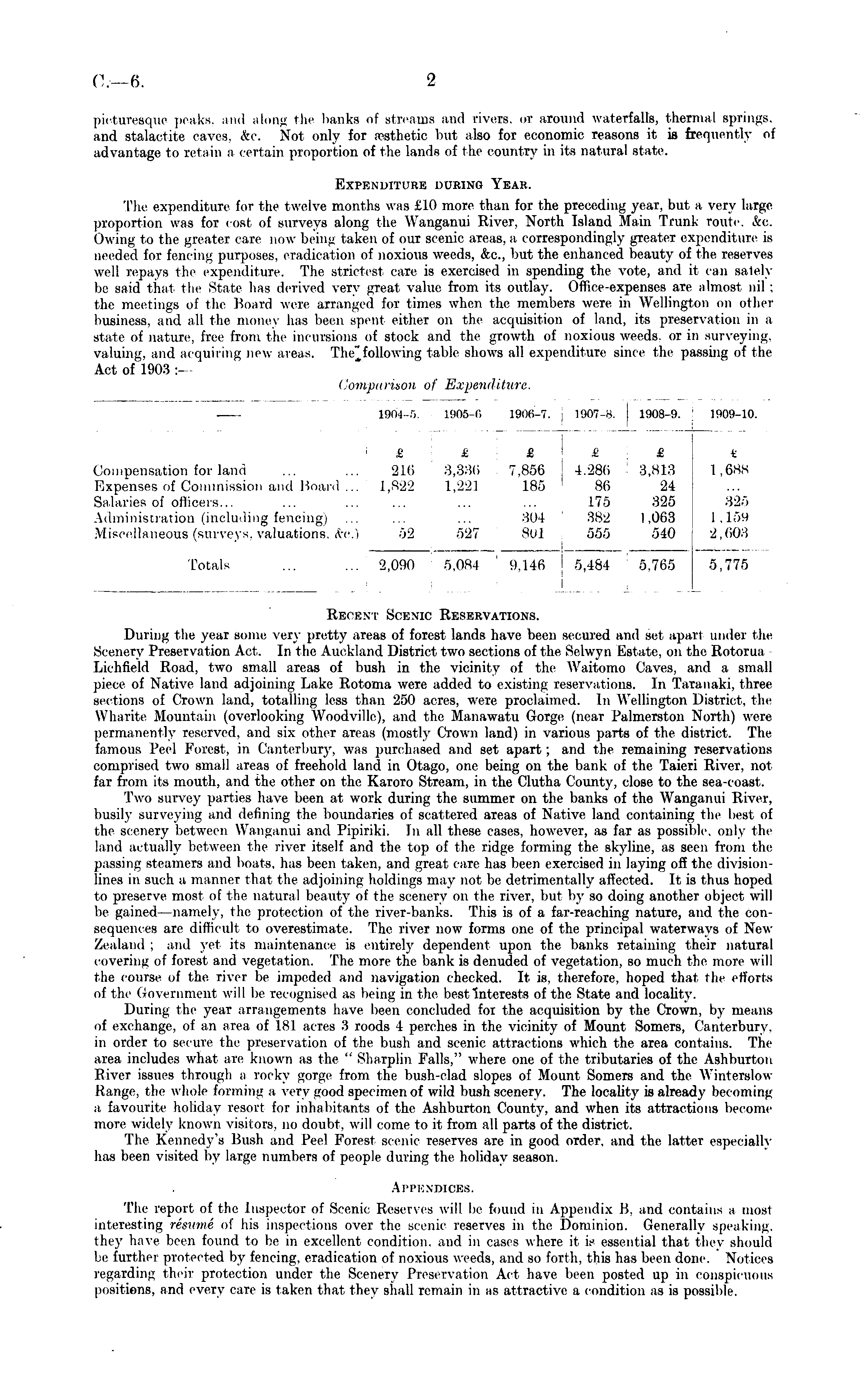 190.1-5. 1905- li 1906-7. 1907 8. 1908-9. £ £ £ £ £ 1009-10. t Compensation for land Expenses of Commission and Board ... Salaries of officers... Administration (including fencing) Miscellaneous (surveys, valuations. &c.) 216 3,336 7.856 4,286 3,813 1,822 1,221 185 86 24 175 325 304 38-2 1,063 r>2 527 801 555 540 1 .688 325 l. 15H 2,603 Totals 2,090 5,084 9,146 5,484 5,765 5,775