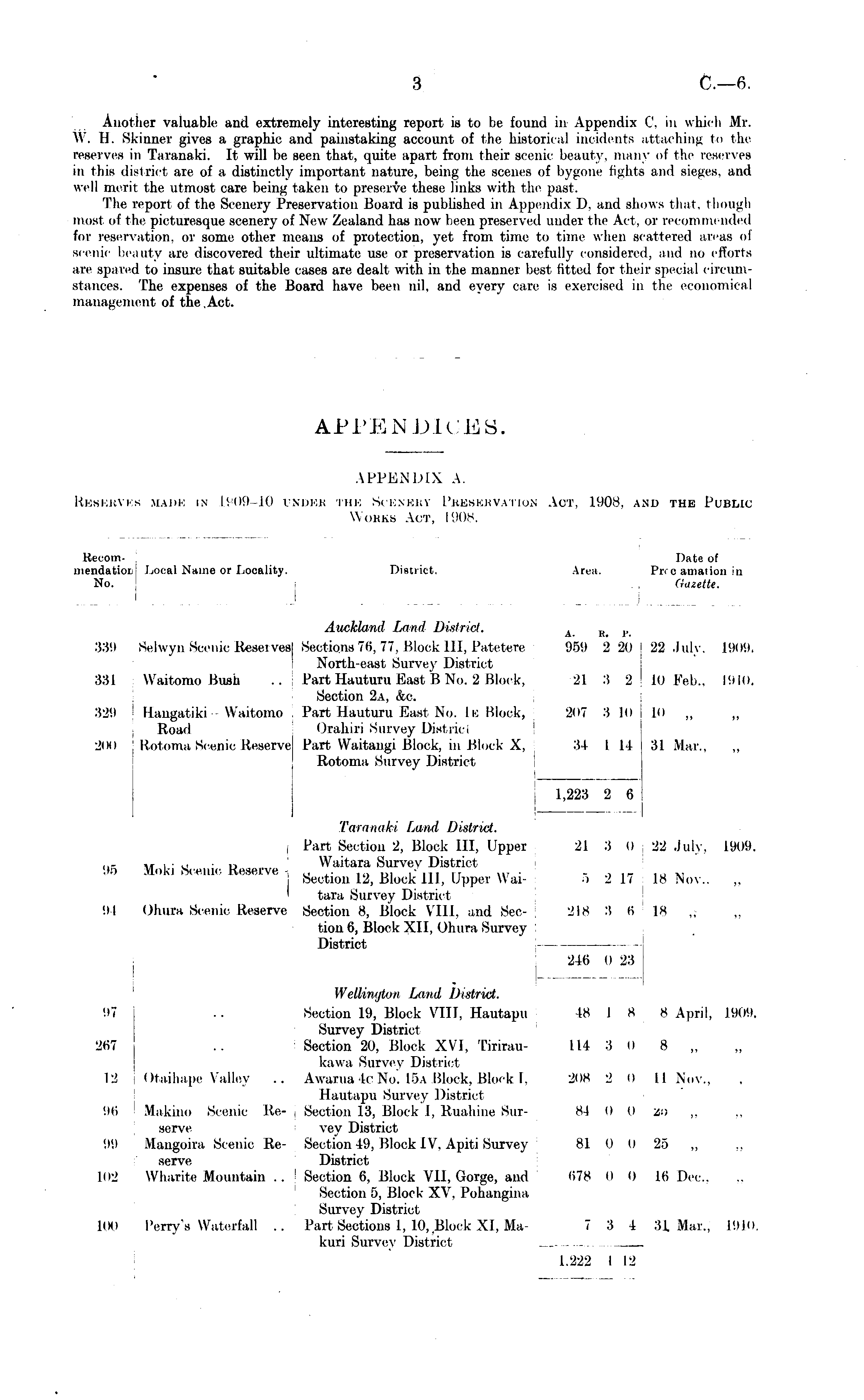 APPENDIX A. Reserves made in 1909-10 under the Scenery Preservation Act, 1908, and the Public Works Act, 1908.