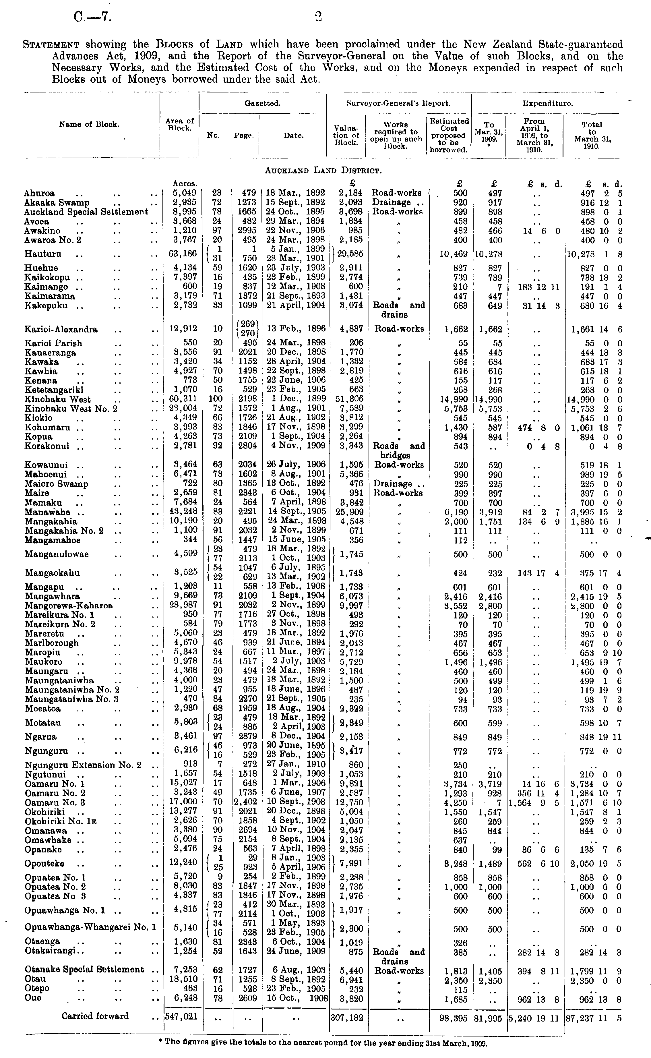 Statement showing the Blocks of Land which have been proclaimed under the New Zealand State-guaranteed Advances Act, 1909, and the Report of the Surveyor-General on the Value of such Blocks, and on the Necessary Works, and the Estimated Cost of the Works, and on the Moneys expended in respect of such Blocks out of Moneys borrowed under the said Act.