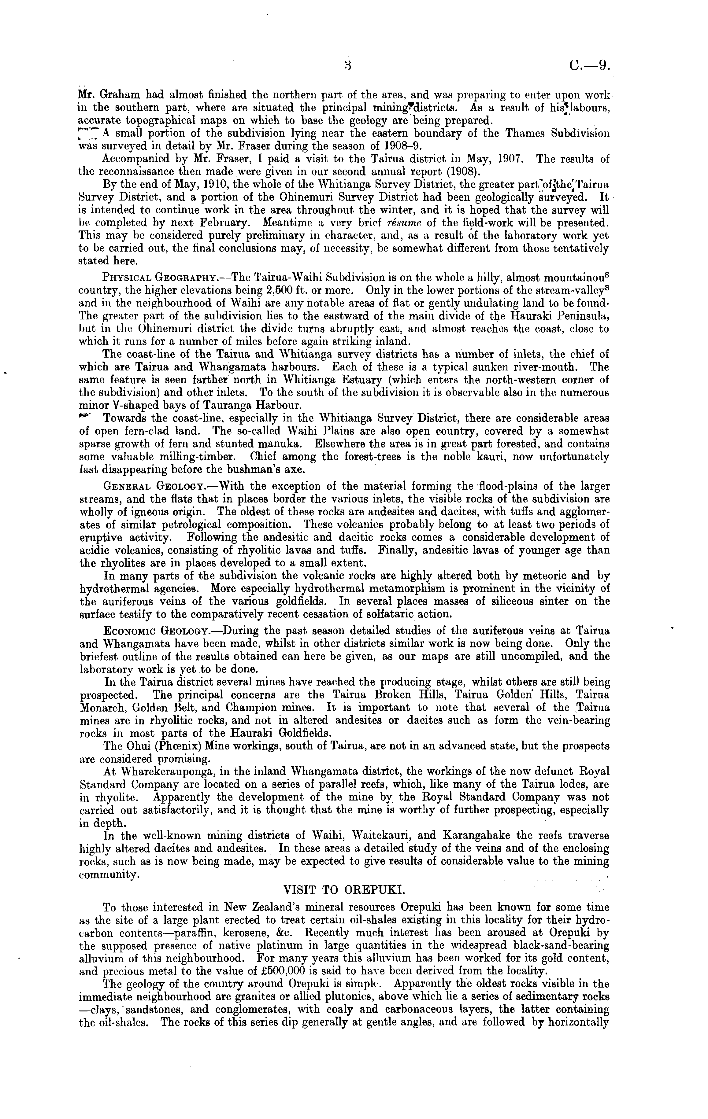 Mr. Graham had almost finished the northern part of the area, and was preparing to enter upon work in the southern part, where are situated the principal miningTdistricts. As a result of his* labours, accurate topographical maps on which to base the geology are being prepared. *~A small portion of the subdivision lying near the eastern boundary of the Thames Subdivision was surveyed in detail by Mr. Fraser during the season of 1908-9. Accompanied by Mr. Fraser, I paid a visit to the Tairua district in May, 1907. The results of the reconnaissance then made were given in our second annual report (1908). By the end of May, 1910, the whole of the Whitianga Survey District, the greater Survey District, and a portion of the Ohinemuri Survey District had been geologically surveyed. It is intended to continue work in the area throughout the winter, and it is hoped that the survey will lie completed by next February. Meantime a very brief resume, of the field-work will be presented. This may lie considered purely preliminary in character, and. as a result of the laboratory work yet to be carried out, the final conclusions may, of necessity, be somewhat different from those tentatively stated here. Physical Geography.—The Tairua-Waihi Subdivision is on the whole a hilly, almost mountainou 8 country, the higher elevations being 2,500 ft. or more. Only in the lower portions of the stream-valley 8 and in the neighbourhood of Waihi are any notable areas of flat or gently undulating land to be foundThe greater part of the subdivision lies to the eastward of the main divide of the Hauraki Peninsula, but in the Ohinemuri district the divide turns abruptly east, and almost reaches the coast, close to which it runs for a number of miles before again striking inland. The coast-line of the Tairua and Whitianga survey districts has a number of inlets, the chief of which are Tairua and Whangamata harbours. Each of these is a typical sunken river-mouth. The same feature is seen farther north in Whitianga Estuary (which enters the north-western corner of the subdivision) and other inlets. To the south of the subdivision it is observable also in the numerous minor V-shaped bays of Tauranga Harbour. T"- Towards the coast-line, especially in the Whitianga Survey District, there are considerable areas of open fern-clad land. The so-called Waihi Plains are also open country, covered by a somewhat sparse growth of fern and stunted manuka. Elsewhere the area is in great part forested, and contains some valuable milling-timber. Chief among the forest-trees is the noble kauri, now unfortunately fast disappearing before the bushman's axe. General Geology.—With the exception of the material forming the flood-plains of the larger streams, and the flats that in places border the various inlets, the visible rocks of the subdivision are wholly of igneous origin. The oldest of these rocks are andesites and dacites, with tuffs and agglomerates of similar petrological composition. These volcanics probably belong to at least two periods of eruptive activity. Following the andesitic and dacitic rocks comes a considerable development of acidic volcanics, consisting of rhyolitic lavas and tuffs. Finally, andesitic lavas of younger age than the rhyolites are in places developed to a small extent. In many parts of the subdivision the volcanic rocks are highly altered both by meteoric and by hydrothermal agencies. More especially hydrothermal mctamorphism is prominent in the vicinity of the auriferous veins of the various goldfields. In several places masses of siliceous sinter on the surface testify to the comparatively recent cessation of solfataric action. Economic Geology.—During the past season detailed studies of the auriferous veins at Tairua and Whangamata have been made, whilst in other districts similar work is now being done. Only the briefest outline of the results obtained can here be given, as our maps are still uncompiled, and the laboratory work is yet to be done. In the Tairua district several mines have reached the producing stage, whilst others are still being prospected. The principal concerns are the Tairua Broken Hills, Tairua Golden Hills, Tairua Monarch, Golden Belt, and Champion mines. It is important to note that several of the Tairua mines are in rhyolitic rocks, and not in altered andesites or dacites such as form the vein-bearing rocks in most parts of the Hauraki Goldfields. The Ohui (Phoenix) Mine workings, south of Tairua, are not in an advanced state, but the prospects are considered promising. At Wharekerauponga, in the inland Whangamata district, the workings of the now defunct Royal Standard Company are located on a series of parallel reefs, which, like many of the Tairua lodes, are in rhyolitc. Apparently the development of the mine by the Royal Standard Company was not carried out satisfactorily, and it is thought that the mine is worthy of further prospecting, especially in depth. In the well-known mining districts of Waihi, Waitekauri, and Karangahake the reefs traverse highly altered dacites and andesites. In these areas a detailed study of the veins and of the enclosing rocks, such as is now being made, may be expected to give results of considerable value to the mining community. VISIT TO OREPUKI. To those interested in New Zealand's mineral resources Orepuki has been known for some time as the site of a large plant erected to treat certain oil-shales existing in this locality for their hydrocarbon contents —paraffin, kerosene, &c. Recently much interest has been aroused at Orepuki by the supposed presence of native platinum in large quantities in the widespread black-sand-bearing alluvium of this neighbourhood. For many years this alluvium has been worked for its gold content, and precious metal to the value of £500,000 is said to have been derived from the locality. The geology of the country around Orepuki is simple. Apparently the oldest rocks visible in the immediate neighbourhood
