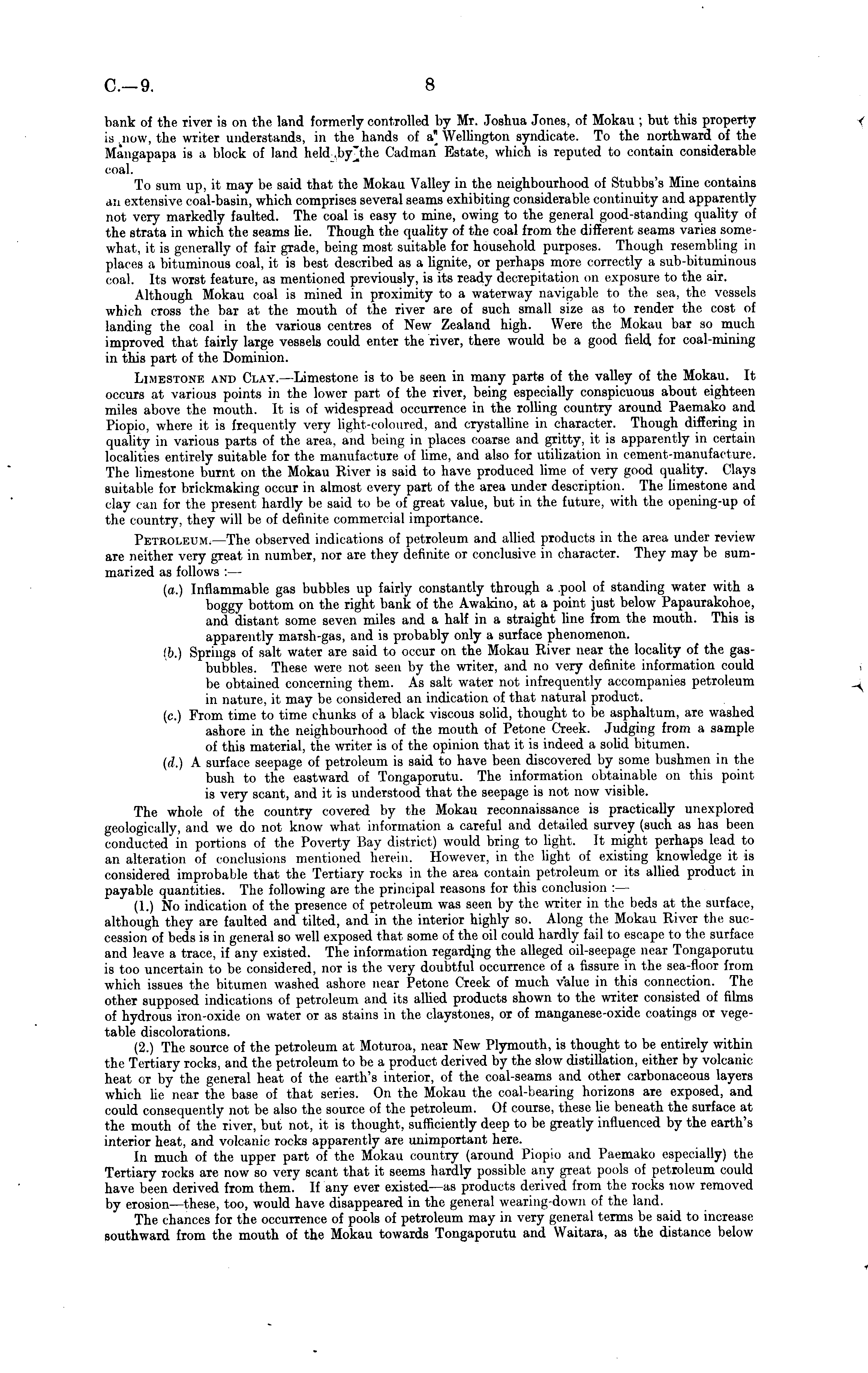 bank of the river is on the land formerly controlled by Mr. Joshua Jones, of Mokau ; but this property is .now, the writer understands, in the hands of a* Wellington syndicate. To the northward of the Mangapapa is a block of land held .by'the Cadman Estate, which is reputed to contain considerable coal. To sum up, it may be said that the Mokau Valley in the neighbourhood of Stubbs's Mine contains an extensive coal-basin, which comprises several seams exhibiting considerable continuity and apparently not very markedly faulted. The coal is easy to mine, owing to the general good-standing quality of the strata in which the seams lie. Though the quality of the coal from the different seams varies somewhat .it is generally of fair grade, being most suitable for household purposes. Though resembling in places a bituminous coal, it is best described as a lignite, or perhaps more correctly a sub-bituminous coal. Its worst feature, as mentioned previously, is its ready decrepitation on exposure to the air. Although Mokau coal is mined in proximity to a waterway navigable to the sea, the vessels which cross the bar at the mouth of the river are of such small size as to render the cost of landing the coal in the various centres of New Zealand high. Were the Mokau bar so much improved that fairly large vessels could enter the river, there would be a good field for coal-mining in this part of the Dominion. Limestone and Clay.—Limestone is to be seen in many parts of the valley of the Mokau. It occurs at various points in the lower part of the river, being especially conspicuous about eighteen miles above the mouth. It is of widespread occurrence in the rolling country around Paemako and Piopio, where it is frequently very light-coloured, and crystalline in character. Though differing in quality in various parts of the area, and being in places coarse and gritty, it is apparently in certain localities entirely suitable for the manufacture of lime, and also for utilization in cement-manufacture. The limestone burnt on the Mokau River is said to have produced lime of very good quality. Clays suitable for brickmaking occur in almost every part of the area under description. The limestone and clay can for the present hardly be said to be of great value, but in the future, with the opening-up of the country, they will be of definite commercial importance. I'iotroleum.—The observed indications of petroleum and allied products in the area under review are neither very great in number, nor are they definite or conclusive in character. They may be summarized as follows ". — (a.) Inflammable gas bubbles up fairly constantly through a .pool of standing water with a boggy bottom on the right bank of the Awakino, at a point just below Papaurakohoe, and distant some seven miles and a half in a straight line from the mouth. This is apparently marsh-gas, and is probably only a surface phenomenon. (b.) Springs of salt water are said to occur on the Mokau River near the locality of the gasbubbles. These were not seen by the writer, and no very definite information could be obtained concerning them. As salt water not infrequently accompanies petroleum in nature, it may be considered an indication of that natural product, (c.) From time to time chunks of a black viscous solid, thought to be asphaltum, are washed ashore in the neighbourhood of the mouth of Petone Creek. Judging from a sample of this material, the writer is of the opinion that it is indeed a solid bitumen. (d.) A surface seepage of petroleum is said to have been discovered by some bushmen in the bush to the eastward of Tongaporutu. The information obtainable on this point is very scant, and it is understood that the seepage is not now visible. The whole of the country covered by the Mokau reconnaissance is practically unexplored geologically, and we do not know what information a careful and detailed survey (such as has been conducted in portions of the Poverty Bay district) would bring to light. It might perhaps lead to an alteration of conclusions mentioned herein. However, in the light of existing knowledge it is considered improbable that the Tertiary rocks in the area contain petroleum or its allied product in payable quantities. The following are the principal reasons for this conclusion : — (1.) No indication of the presence of petroleum was seen by the writer in the beds at the surface, although they are faulted and tilted, and in the interior highly so. Along the Mokau River the succession of beds is in general so well exposed t hat some of the oil could hardly fail to escape to the surface and leave a trace, if any existed. The information regarding the alleged oil-seepage near Tongaporutu is too uncertain to be considered, nor is the very doubtful occurrence of a fissure in the sea-floor from which issues the bitumen washed ashore near Petone Creek of much value in this connection. The other supposed indications of petroleum and its allied products shown to the writer consisted of films of hydrous iron-oxide on water or as stains in the claystones, or of manganese-oxide coatings or vegetable discoloTations. (2.) The source of the petroleum at Moturoa, near New Plymouth, is thought to be entirely within the Tertiary rocks, and the petroleum to be a product derived by the slow distillation, either by volcanic heat or by the general heat of the earth's interior, of the coal-seams and other carbonaceous layers which lie near the base of that series. On the Mokau the coal-bearing horizons are exposed, and could consequently not be also the source of the petroleum. Of course, these he beneath the surface at the mouth of the river, but not, it is thought, sufficiently deep to be greatly influenced by the earth's interior heat, and volcanic rocks apparently are unimportant here. In much of the upper part of the Mokau country (around Piopio and Paemako especially) the Tertiary rocks are now so very scant that it seems hardly possible any great po