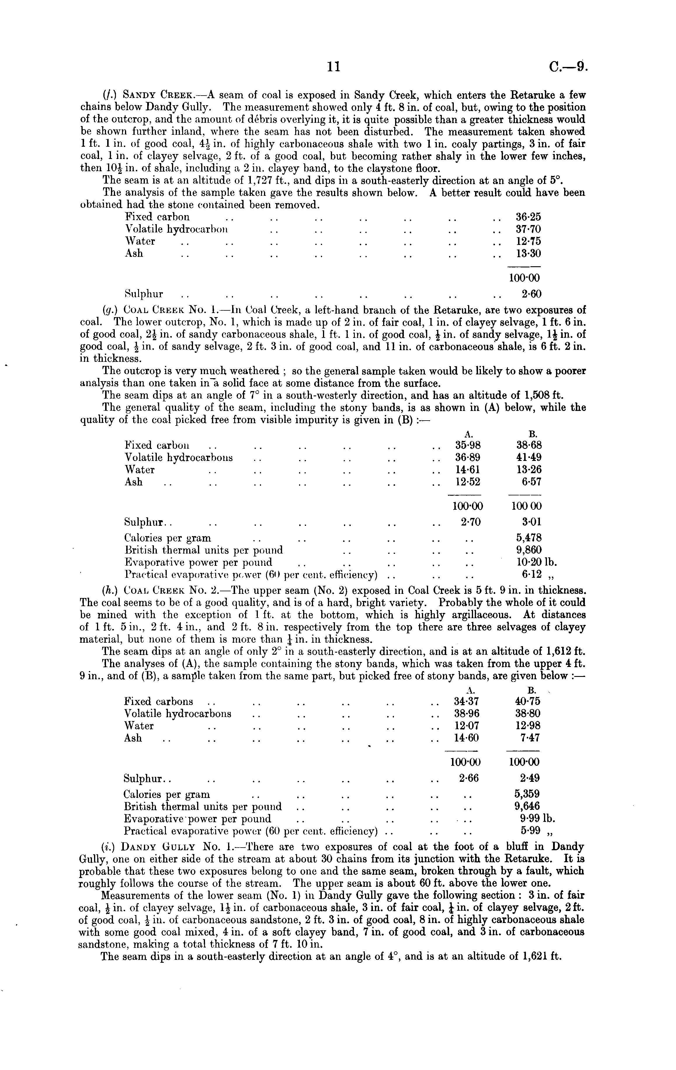 (/.) Sandy Creek. —A seam of coal is exposed in Sandy Creek, which enters the Retaruke a few chains below Dandy Gully. The measurement showed only 4 ft. 8 in. of coal, but, owing to the position of the outcrop, and the amount of debris overlying it, it is quite possible than a greater thickness would be shown further inland, where the seam has not been disturbed. The measurement taken showed 1 ft. 1 in. of good coal, i\ in. of highly carbonaceous shale with two 1 in. coaly partings, 3 in. of fair coal, 1 in. of clayey selvage, 2 ft. of a good coal, but becoming rather shaly in the lower few inches, then 10J in. of shale, including a 2 in. clayey band, to the claystone floor. The seam is at an altitude of 1,727 ft., and dips in a south-easterly direction at an angle of s°. The analysis of the sample taken gave the results shown below. A better result could have been obtained had the stone contained been removed. Fixed carbon .. .. .. .. .. .. .. 36-25 Volatile hydrocarbon .. .. .. .. .. .. 37-70 Water .. .. .. .. .. .. .. 12-75 Ash .. .. .. .. .. .. 13-30 100-00 Sulphur .. . . . . .. .. .. .. .. 2-60 (g.) Coal Creek No. 1. —In Coal Creek, a left-hand branch of the Retaruke, are two exposures of coal. The lower outcrop, No. 1, which is made up of 2 in. of fair coal, 1 in. of clayey selvage, 1 ft. 6 in. of good coal, 2\ in. of sandy carbonaceous shale, 1 ft. 1 in. of good coal, \ in. of sandy selvage, \\ in. of good coal, \ in. of sandy selvage, 2 ft. 3 in. of good coal, and 11 in. of carbonaceous shale, is 6 ft. 2 in. in thickness. The outcrop is very much weathered ; so the general sample taken would be likely to show a poorer analysis than one taken in~a solid face at some distance from the surface. The seam dips at an angle of 7° in a south-westerly direction, and has an altitude of 1,508 ft. The general quality of the seam, including the stony bands, is as shown in (A) below, while the quality of the coal picked free from visible impurity is given in (B) : — A. B. Fixed carbon .. .. .. .. .. 35-98 38-68 Volatile hydrocarbons .. .. .. 36-89 41-49 Water .. .. .. .. .. .. 14-61 13-26 Ash .. .. .. .. .. .. 12-52 6-57 100-00 100 00 Sulphur.. .. .. .. .. .. .. 2-70 3-01 Calories per gram . . .. .. .. .. .. 5,478 British thermal units per pound .. .. .. .. 9,860 Evaporative power per pound . . .. .. .. .. 10-20 lb. Practical:evaporative power (60 per cent, efficiency) .. .. .. 6-12 ~ (h.) Coal Creek No. 2. —The upper seam (No. 2) exposed in Coal Creek is 5 ft. 9 in. in thickness. The coal seems to be of a good quality, and is of a hard, bright variety. Probably the whole of it could be mined with the exception of 1 ft. at the bottom, which is highly argillaceous. At distances of Ift. 5 in., 2 ft. 4 in., and 2 ft. 8 in. respectively from the top there are three selvages of clayey material, but none of them is more than \ in. in thickness. The seam dips at an angle of only 2° in a south-easterly direction, and is at an altitude of 1,612 ft. The analyses of (A), the sample containing the stony bands, which was taken from the upper 4 ft. 9 in., and of (B), a sample taken from the same part, but picked free of stony bands, are given below : — A. B. Fixed carbons .. .. .. .. .. .. 34-37 40-75 Volatile hydrocarbons .. .. .. .. .. 38-96 38-80 Water .. .. .. .. .. .. 12-07 12-98 Ash .. .. .. .. .. .. 14-60 7-47 100-00 100-00 Sulphur.. .. .. .. .. .. .. 2-66 2-49 Calories per gram .. .. .. .. .. .. 5,359 British thermal units per pound .. .. .. .. .. 9,646 Evaporative power per pound .. .. .. .. .. 9-99 lb. Practical evaporative power (60 per cent, efficiency) .. .. .. 5-99 ~ (i.) Dandy Gully No. I.—There are two exposures of coal at the foot of a bluff in Dandy Gully, one on either side of the stream at about 30 chains from its junction with the Retaruke. It is probable that these two exposures belong to one and the same seam, broken through by a fault, which roughly follows the course of the stream. The upper seam is about 60 ft. above the lower one. Measurements of the lower seam (No. 1) in Dandy Gully gave the following section : 3 in. of fair coal, | in. of clayey selvage, of carbonaceous shale, 3 in. of fair coal, of clayey selvage, 2 ft. of good coal, | in. of carbonaceous sandstone, 2 ft. 3 in. of good coal, 8 in. of highly carbonaceous shale with some good coal mixed, 4 in. of a soft clayey band, 7 in. of good coal, and 3 in. of carbonaceous sandstone, making a total thickness of 7 ft. 10 in. The seam dips in a south-easterly direction at an angle of 4°, and is at an altitude of 1,621 ft.