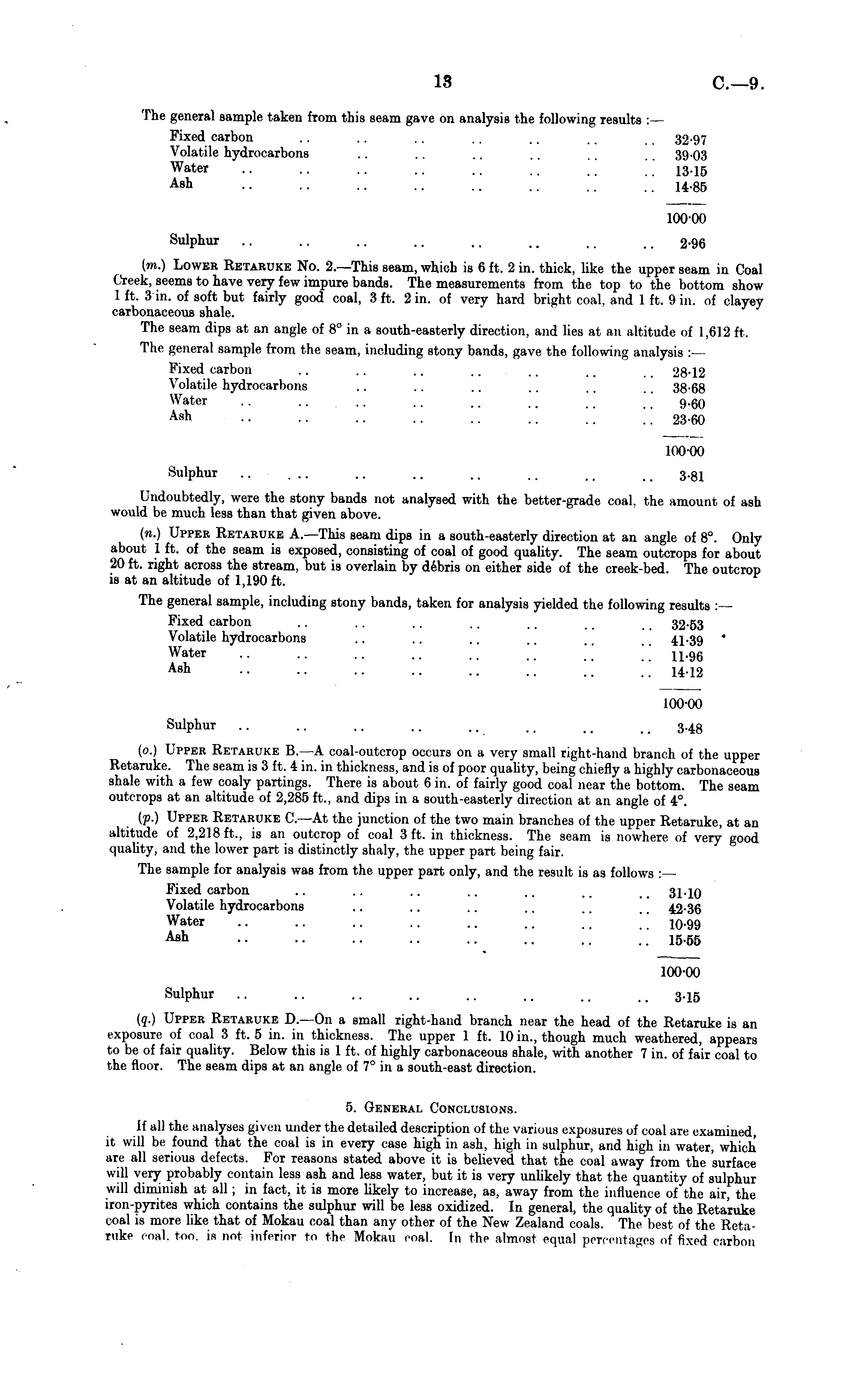The general sample taken from this seam gave on analysis the following results : — Fixed carbon .. .. .. .. .. .. 32-97 Volatile hydrocarbons .. .. .. .. .. .. 39-03 Water •• ■• ■• -- .. .. .. .. 13-15 Ash •• •• •• -• -. .. 14-85 100-00 Sulphur .. .. .. .. .. .. ~ , _ 2-96 (m.) Lower Retaruke No. 2.—This seam, which is 6 ft. 2 in. thick, like the upper seam in Coal Creek, seems to have very few impure bands. The measurements from the top to the bottom show 1 ft. 3 in. of soft but fairly good coal, 3 ft. 2 in. of very hard bright coal, and 1 ft. 9 in. of clayey carbonaceous shale. The seam dips at an angle of 8° in a south-easterly direction, and lies at an altitude of 1,612 ft. The general sample from the seam, including stony bands, gave the following analysis : — Fixed carbon .. .. .. .. .. . < 28-12 Volatile hydrocarbons .. .. .. .. .. . _ 38-68 Water •• .... .. .. .. .. ..' 9-60 Ash •• •• •• -- -. .. .. .. 23-60 100-00 Sulphur .. .. .. .. .. .. .. it 3 . 81 Undoubtedly, were the stony bands not analysed with the better-grade coal, the amount of ash would be much less than that given above. (m.) Upper Retaruke A.—This seam dips in a south-easterly direction at an angle of B°. Only about 1 ft. of the seam is exposed, consisting of coal of good quality. The seam outcrops for about 20 ft. right across the stream, but is overlain by debris on either side of the creek-bed. The outcrop is at an altitude of 1,190 ft. The general sample, including stony bands, taken for analysis yielded the following results :— Fixed carbon .. .. .. .. ~ 32-53 Volatile hydrocarbons .. .. .. .. .. 41-39 * Water •• •• -• -- -. .. .'.' .. 11-96 Aah •• •• ■• -- .. .. .. .. 1412 100-00 Sulphur .. .. .. .. .. .. .. t> 34 8 (o.) Upper Retaruke B.—A coal-outcrop occurs on a very small right-hand branch of the upper Retaruke. The seam is 3 ft. 4 in. in thickness, and is of poor quality, being chiefly a highly carbonaceous shale with a few coaly partings. There is about 6 in. of fairly good coal near the bottom. The seam outcrops at an altitude of 2,285 ft., and dips in a south-easterly direction at an angle of 4°. (p.) Upper Retaruke C—At the junction of the two main branches of the upper Retaruke, at an altitude of 2,218 ft., is an outcrop of coal 3 ft. in thickness. The seam is nowhere of very good quality, and the lower part is distinctly shaly, the upper part being fair. The sample for analysis was from the upper part only, and the result is as follows : — Fixed carbon .. .. .. .. .. _ _ 31-10 Volatile hydrocarbons .. .. .. .. .. 42-36 Water .. .. .. .. .. .. ~ 10 . 99 •■ ■■ ■• •• •- .. .. .. 15-55 100-00 Sulphur .. .. .. .. .. .. .. .. 3 . 15 (q.) Upper Retaruke D.—On a small right-hand branch near the head of the Retaruke is an exposure of coal 3 ft. 5 in. in thickness. The upper 1 ft. 10 in., though much weathered, appears to be of fair quality. Below this is 1 ft. of highly carbonaceous shale, with another 7 in. of fair coal to the floor. The seam dips at an angle of 7° in a south-east direction. 5. General Conclusions. If all the analyses given under the detailed description of the various exposures of coal are examined, it will be found that the coal is in every case high in ash, high in sulphur, and high in water, which are all serious defects. For reasons stated above it is believed that the coal away from the surface will very probably contain less ash and less water, but it is very unlikely that the quantity of sulphur will diminish at all; in fact, it is more likely to increase, as, away from the influence of the air, the iron-pyrites which contains the sulphur will be less oxidized. In general, the quality of the Retaruke coal is more like that of Mokau coal than any other of the New Zealand coals. The best of the Retaruke coal, too, is not inferior to the Mokau coal. In the almost equal percentages of fixed carbon