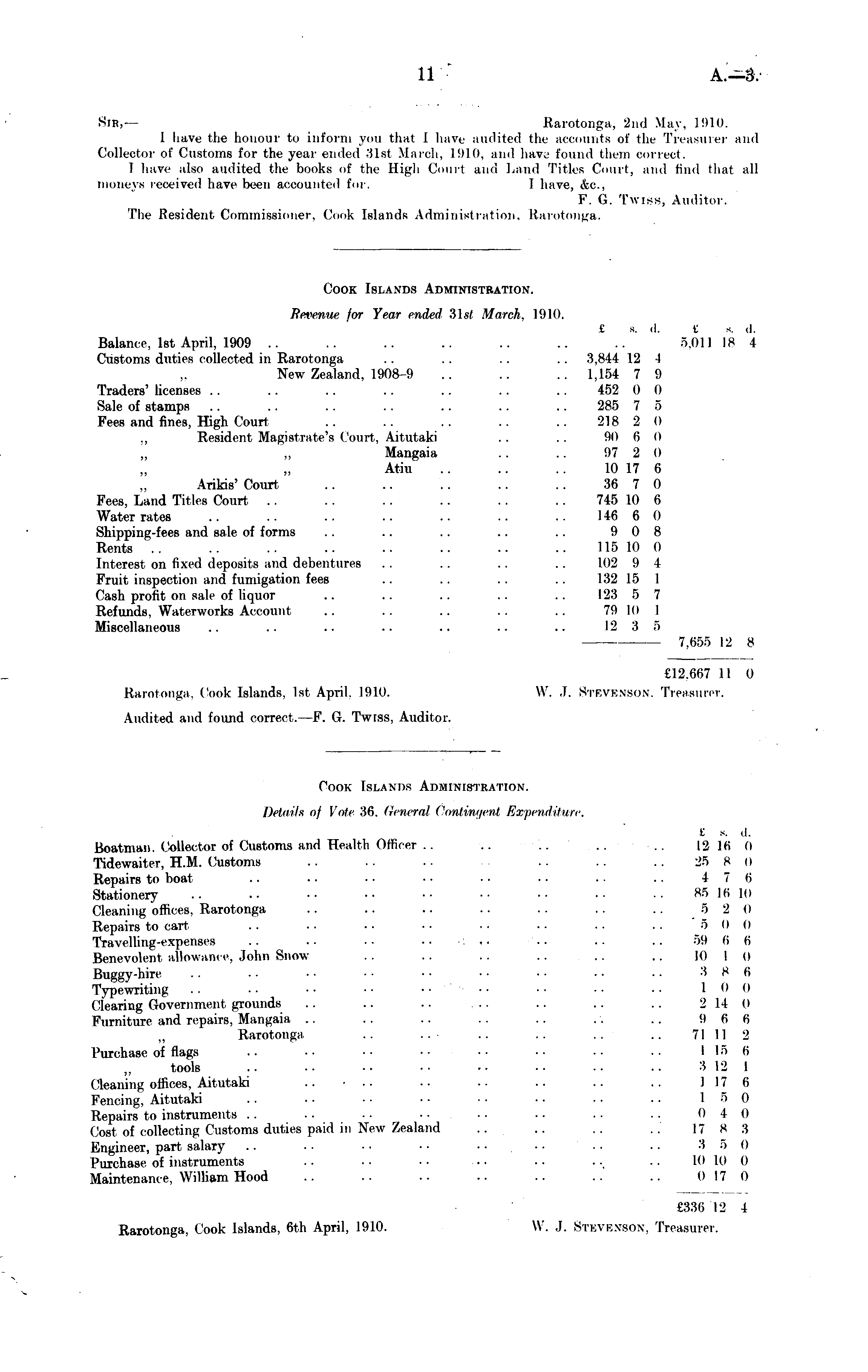 Sir,— Rarotonga, 2nd May. 1910. I have the honour to inform you that I have audited the accounts of the Treasurer and Collector of Customs for the year ended 31st March, 1910, and have found them correct. 1 have also audited the books of the High Court ami Land Titles Court, and find that all moneys received have been accounted for. I have, Sec., I'. G. Twiss, Auditor. The Resident Commissioner, Cook Islands Administration, Rarotonga.