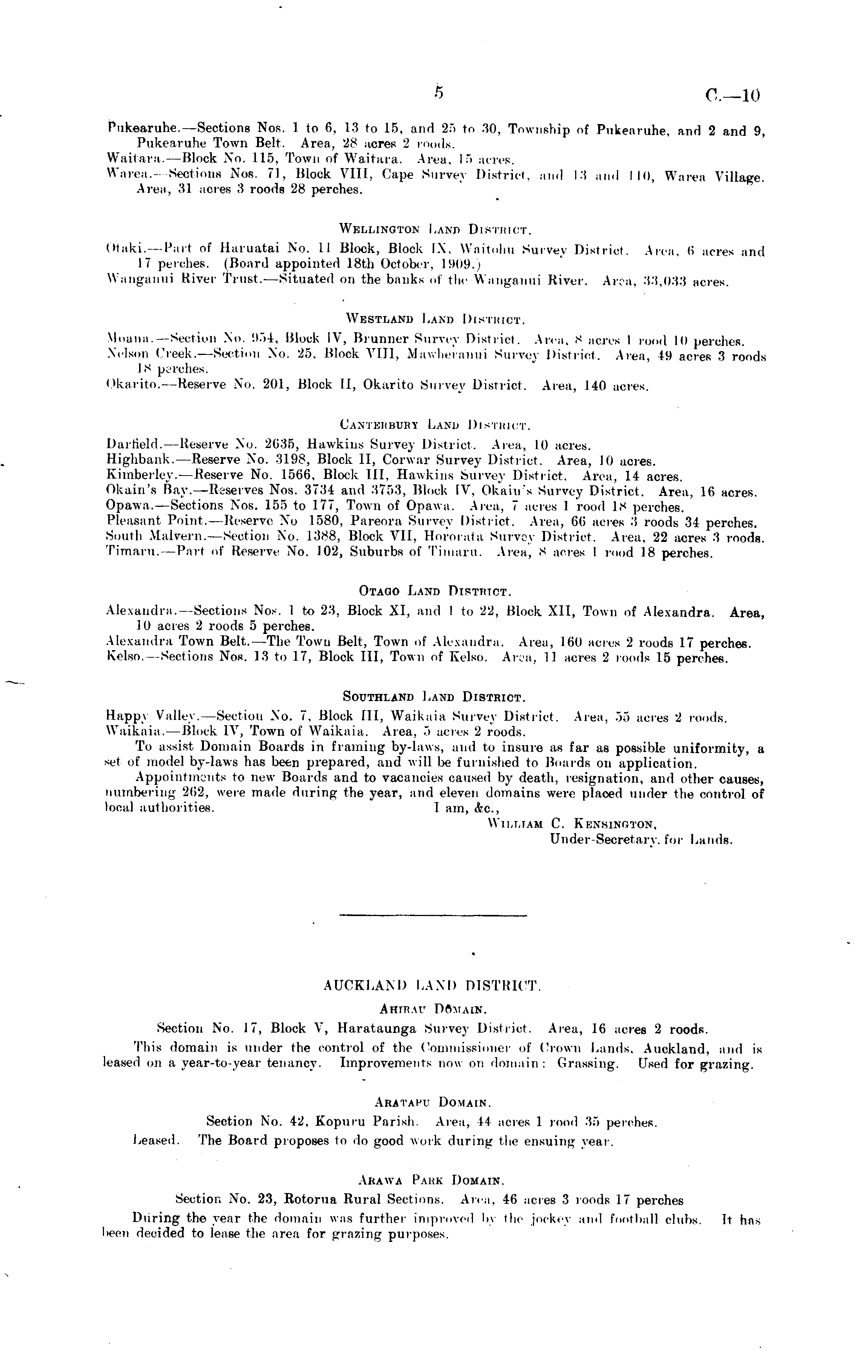 AUCKLAND LAND DISTRICT. Ahihau DAmain. Section No. 17, Block V, Sarataunga Survey District. Area, Hi acres 2 roods. This domain is under the control of the Commissioner <it' Crown Lands. Auckland, ami is leased iii) a year-to-year tenancy. Improvements mm on domain: Grassing. Used for grazing. Aratapv Domain. Section No. 12, Kopuru Parish. Area, II acres I rood c> perohes. [.eased. The Board proposes to do good work during the ensuing year. Arawa Park Domain. Section Xo. 23, Rotorua Rural Sections. Area, 46 acres 3 roods 17 perches During the year the domain was further improved by the jockey and football clubs. It hns been decided to lease the area for grazing purposes.