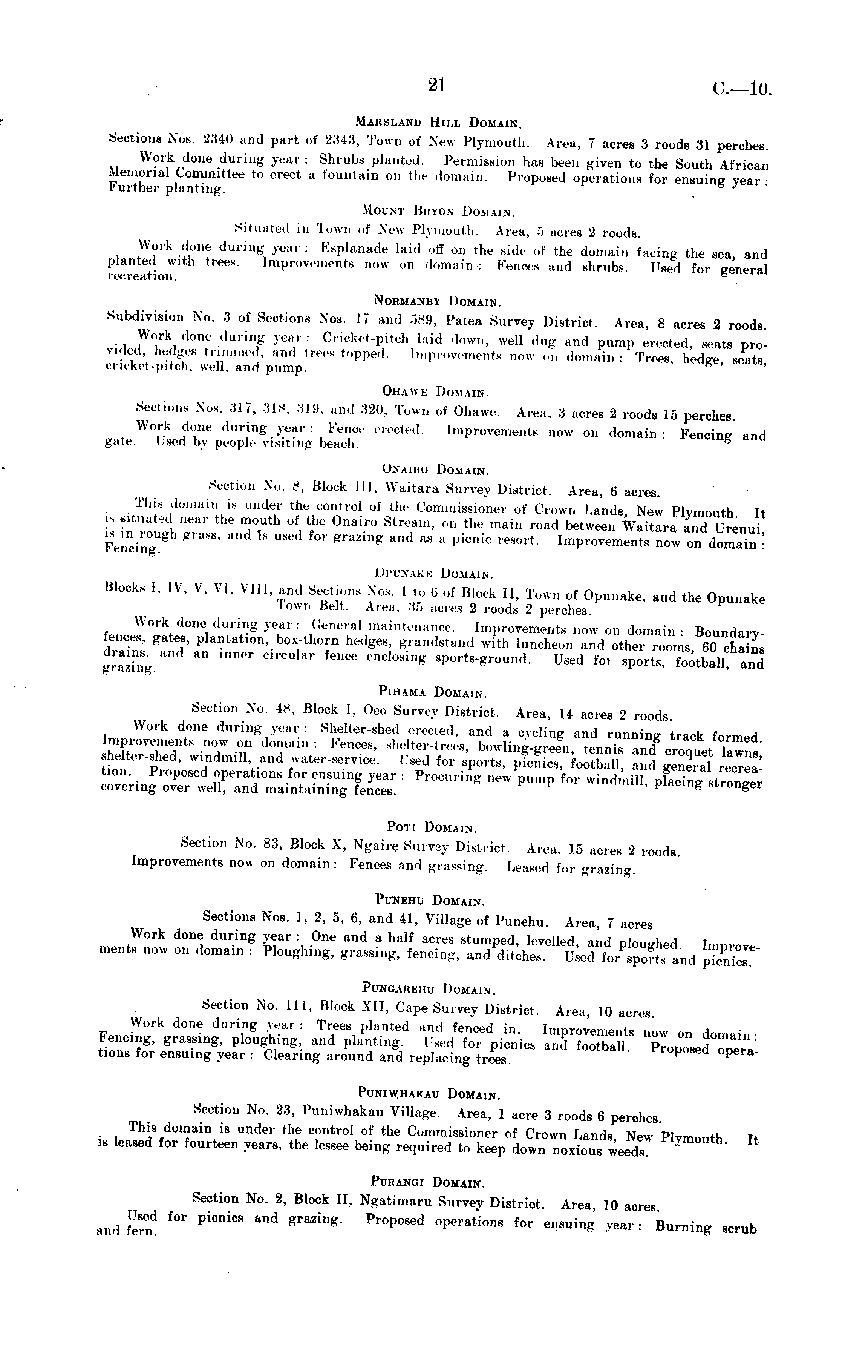Marslanb Hill Domain. Sections Nos. 2340 and pari of 2343, Town of New Plymouth. Area, 7 acres 3 roods 31 perches. Work don© during year : Shrubs planted. Permission has been given to the South African Memorial Committee to erecl .. fountain on the domain. Proposed operations for ensuing year • r urther planting. ° ■ Mount Buyon Domain. Situated in 'I own of New Plymouth. Area, 5 acres 2 roods. Work done during year : Esplanade laid off on the side of the domain facing the sea, and planted with trees. Improvements now ~„ domain-: Fenoes and shrubs. Used for general recreation. 6 Normanby Domain. Subdivision No. 3 of Sections Nos. 17 and 589, Patea Survey District. Area, 8 acres 2 roods Work done during yeaf: Cricket-pitch laid down, well dug and pump erected, seats provided hedges trimmed, and trees top] Improvements now ,„, domain: Trees, hedge seats cricKet-pitcn, well, and pump. ° Ohawe Domain. Sections Nos. 317, 318, 319, and 320, Town of Ohawe. Area, 3 acres 2 roods 15 perches Work done during year: Fence erected. Improvements now on domain: Fencing and gate. I sed by people visiting beach. 6 Onairo Domain. Seel ion No. 8, Block 111. Waitara Survey District. Area, 6 acres. This domain is under the control of the Commissioner of Crown Lands, New Plymouth It - situated near the mouth oi the Onairo Stream, on the main road between Waitara and Urenu Pencil "a SS : " " "*'"' graZiEg aDd aS B piCDic "*■ '-1-vements now ondomain .' Dpunake Domain. Blocks I. IV. V. VI, VIII. ami Sections Nos. I to 6 of Block 11, Tow,, of Opunake, and the Opunake Pown Belt. Area, 35 acres 2 roods 2 perches. Work done during year: General maintenance. Improvements now lomain : Boundarvfences, gates, plantation, hoi-thorn hedges, grandstand with luncheon and other rooms 60 chains '!::Z, '■'" """"' ""'""' : "' teDOe , " < - 1 " si "- *«**«»»*• Used fo. sports, football and Pihama Domain. Section No. 48, Block 1, Oeo Survey District. Area, 14 acres 2 roods 8 " CT ■ "" * i, " , " ,ra - pKe Poti Domain. Section No. 83, Block X, Ngaire Survsy District. Area. 15 acres 2 roods. Improvements now on domain : Fences and grassing. Leased tor grazing. Punehu Domain. Sections Nos. 1, 2, 5, 6, and 41, Village of Punehu. Area, 7 acres Work done during year : One and a half acres stumped, levelled and T,„ ments now on domain : houghing, grassing, fencing, Pitches Usedtr'spoSlnd JEST PUNGAREHTJ DOMAIN. Section No. 111. Block XII, Cape Survey District. Area, 10 aces Work done during year: Trees planted and fenced in. Improvements now ~„ ) Fencing, grassing, ploughing, and planting. Used for picnics and Sail >o, efc tions for ensuing year : Clearing around and replacing trees rroposea operaPuniwhakau Domain. Section No. 23, Puniwhakau Village. Area, 1 acre 3 roods 6 perches This domain is under the control of the Commissioner of Crown Lands, New Plymouth It is leased for fourteen years, the lessee being required to keep down noxious weeds - Vm ° Uth - Tt Purangi Domain. Section No. 2, Block 11, Ngatimaru Survey District. Area 10 acres an,lf f ern d "* *"***• Pr ° P ° Sed o P erations '»' ™*™? year: Burning scrub