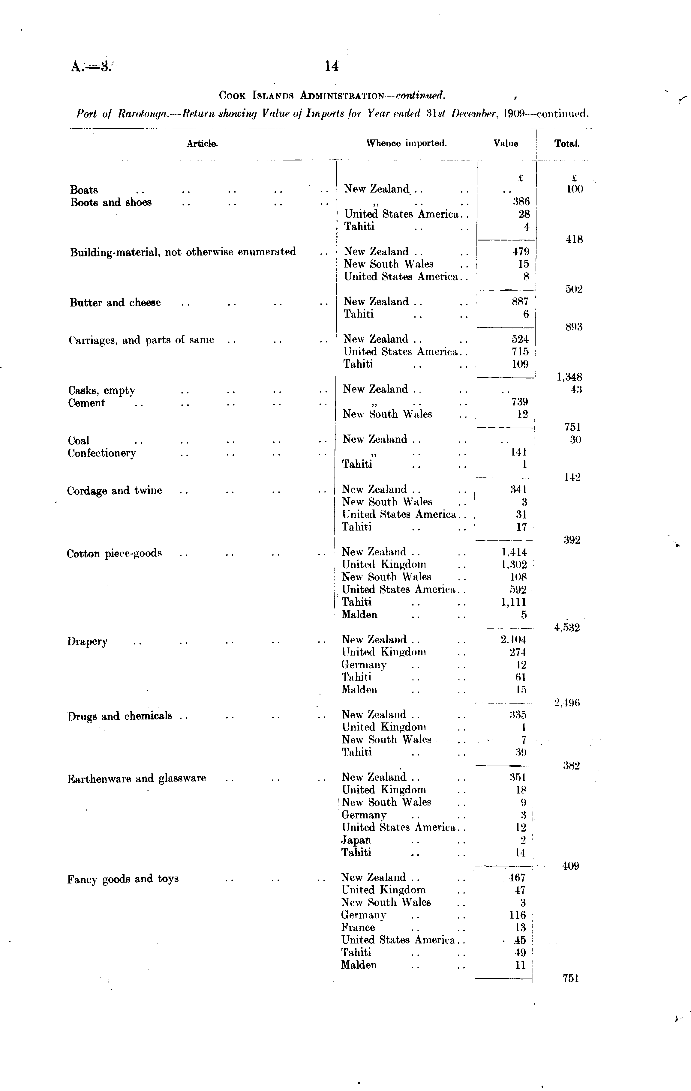 Cook Islands Administration—continued. Port of Rarotonga.-Return showing Value of Imports for Year ended 31st December, 1909-continued.