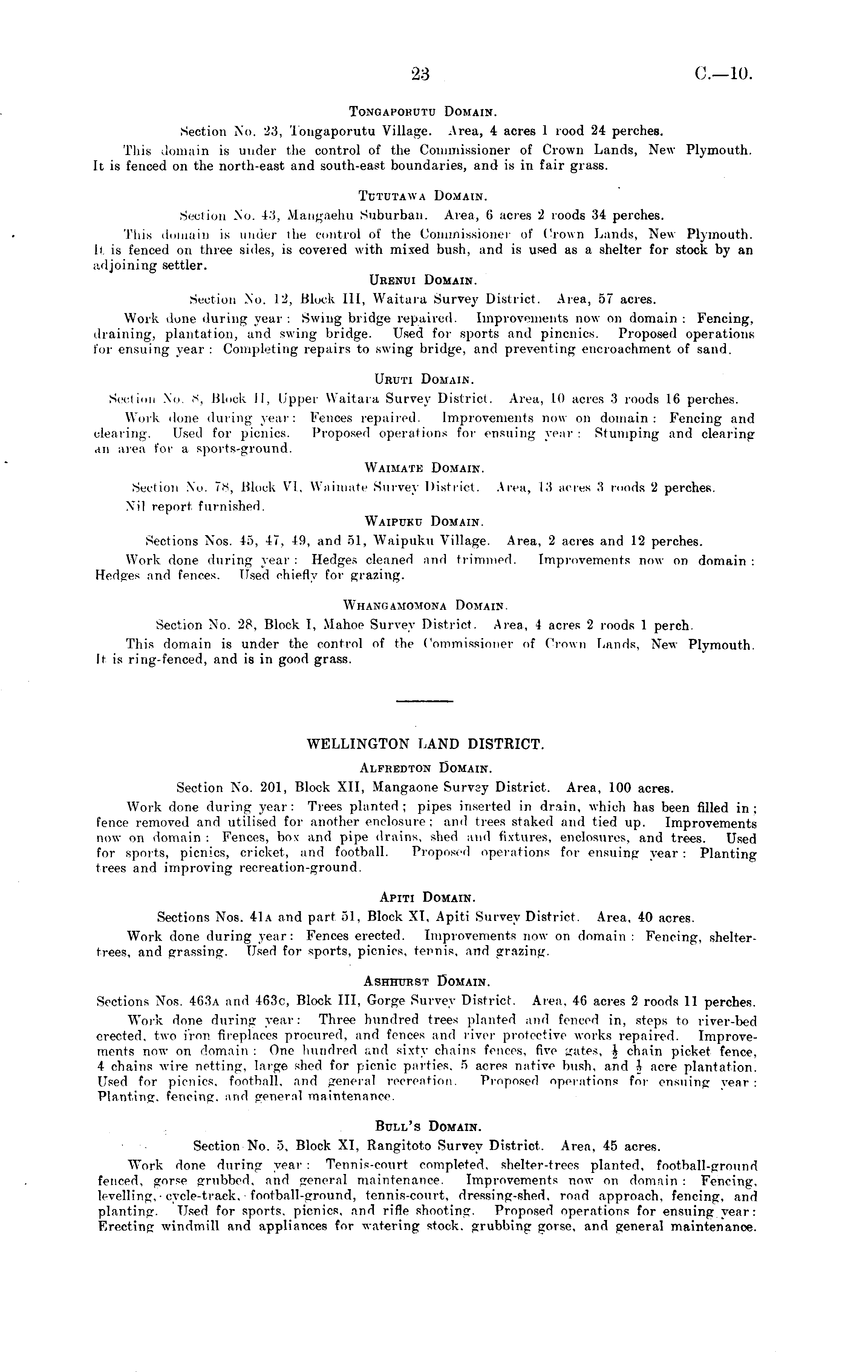 WELLINGTON LAND DISTRICT. Alfredton Domain. Section No. 201, Block XII, Mangaone Survay District. Area, 100 acres. Work done during year: Trees planted; pipes inserted in drain, which has been filled in; fence removed and utilised for another enclosure: ami trees staked and tied up. Improvements now on domain : Fences, box and pipe drains, shed and fixtures, enclosures, and trees. Used for sports, picnics, cricket, and football. Proposal operations for ensuing year : Planting trees and improving recreation-ground. Apiti Domain. Sections Nos. 41a and part 51. Block XI, Apiti Survey District. Area, 40 acres. Work done during year: Fences erected. Improvements now on domain : Fencing, sheltertrees, and grassing. Used for sports, picnics, tennis, and grazing. Ashhttrst Domain. Sections Nos. 463 a and 463 c, Block 111, Gorge Survey District. Area, 46 acres 2 roods 11 perches. Work done during year: Three hundred trees planted ami fenced in, steps to river-bed erected, two iron fireplaces procured, and fences and river protective works repaired. Improvements now on domain : One hundred and sixty chains fences, five .rates. J chain picket fence. 4 chains wire netting, large shed for picnic parties. 5 acres native bush, and 1 aero plantation. Used for picnics, football, and general recreation. Proposed operations for ensuing year : Planting, fencing, and general maintenance. Bull's Domain. Section No. 5, Block XI, Rangitoto Survey District. Area, 45 acres. Work done during year : Tennis-court completed, shelter-trees planted, football-ground fenced, gorse grubbed, and general maintenance. Improvements now on domain : Fencing, levelling, • cycle-track, ■ football-ground, tennis-court, dressinsr-shed, road approach, fencing, and planting. Used for sports, picnics, and rifle shooting. Proposed operations for ensuing year: Erecting windmill and appliances for watering stock, grubbing gorse, and general maintenance.