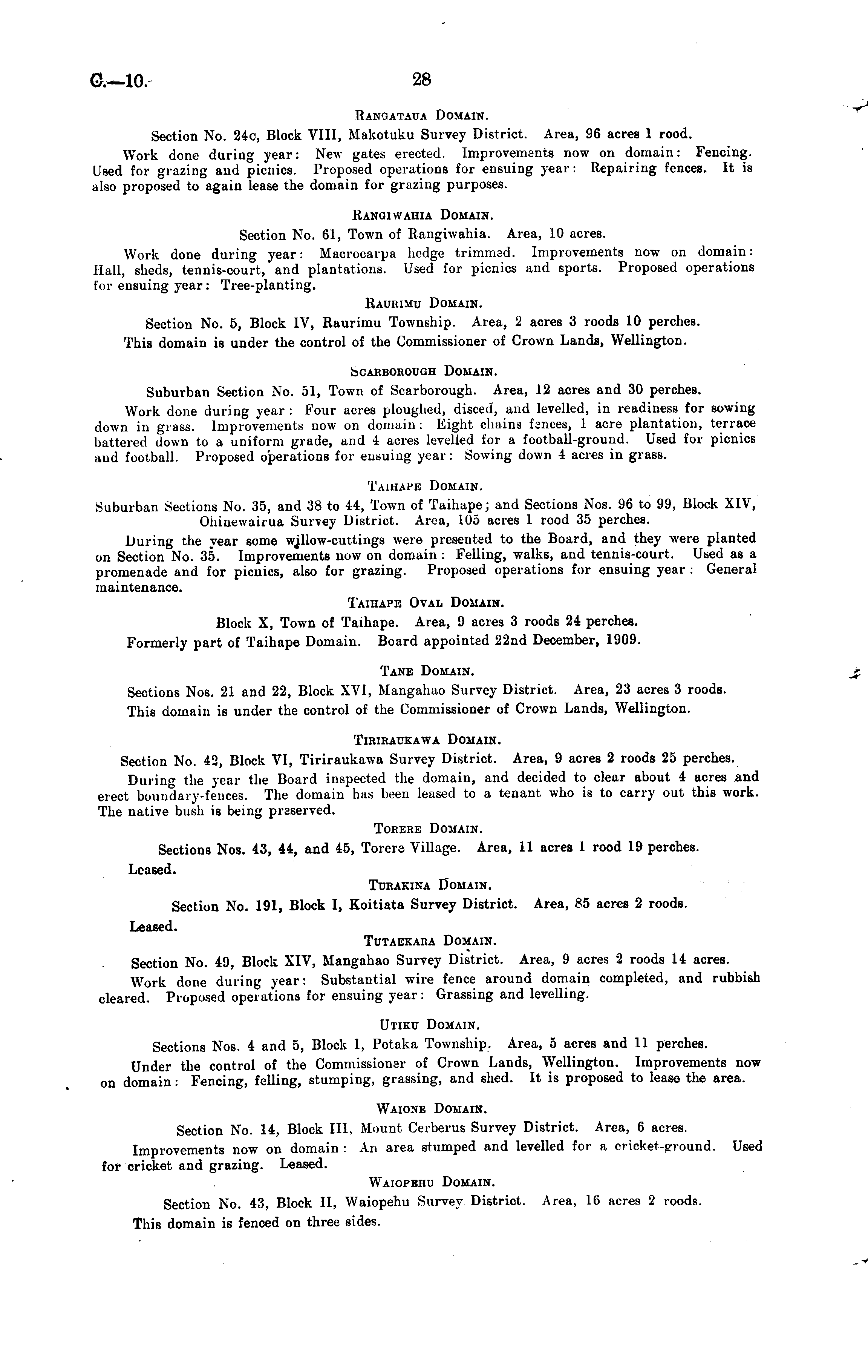Rangataua Domain. Section No. 24c, Block VIII, Makotuku Survey District. Area, 96 acres 1 rood. Work done during year: New gates erected. Improvements now on domain: Fencing. Used for grazing and picnics. Proposed operations for ensuing year: Repairing fences. It is also proposed to again lease the domain for grazing purposes. Rangiwahia Domain. Section No. 61, Town of Rangiwahia. Area, 10 acres. Work done during year: Macrocarpa hedge trimmed. Improvements now on domain: Hall, sheds, tennis-court, and plantations. Used for picnics and sports. Proposed operations for ensuing year: Tree-planting. Raurimu Domain. Section No. 5, Block IV, Raurimu Township. Area, 2 acres 3 roods 10 perches. This domain is under the control of the Commissioner of Crown Lands, Wellington. SCARBOROUGH DOMAIN. Suburban Section No. 51, Town of Scarborough. Area, 12 acres and 30 perches. Work done during year : Four acres ploughed, disced, and levelled, in readiness for sowing down in grass. Improvements now on domain: Eight chains fences, 1 acre plantation, terrace battered down to a uniform grade, and 4 acres levelled for a football-ground. Used for picnics and football. Proposed operations for ensuing year: Sowing down 4 acres in grass. Taihape Domain. Suburban Sections No. 35, and 38 to 44, Town of Taihape; and Sections Nos. 96 to 99, Block XIV, Ohinewairua Survey District. Area, 105 acres 1 rood 35 perches. During the year some wjllow-cuttings were presented to the Board, and they were planted on Section No. 35. Improvements now on domain : Felling, walks, and tennis-court. Used as a promenade and for picnics, also for grazing. Proposed operations for ensuing year : General maintenance. Taihape Oval Domain. Block X, Town of Taihape. Area, 9 acres 3 roods 24 perches. Formerly part of Taihape Domain. Board appointed 22nd December, 1909. Tane Domain. Sections Nos. 21 and 22, Block XVI, Mangahao Survey District. Area, 23 acres 3 roods. This domain is under the control of the Commissioner of Crown Lands, Wellington. Tiriraukawa Domain. Section No. 42, Block VI, Tiriraukawa Survey District. Area, 9 acres 2 roods 25 perches. During the year the Board inspected the domain, and decided to clear about 4 acres and erect boundary-fences. The domain has been leased to a tenant who is to carry out this work. The native bush is being preserved. Torere Domain. Sections Nos. 4.3, 44, and 45, Torers Village. Area, 11 acres 1 rood 19 perches. Leased. Turakina Domain. Section No. 191, Block I, Koitiata Survey District. Area, 85 acres 2 roods. Leased. TUTAEKARA DOMAIN. Section No. 49, Block XIV, Mangahao Survey District. Area, 9 acres 2 roods 14 acres. Work done during year: Substantial wire fence around domain completed, and rubbish cleared. Proposed operations for ensuing year: Grassing and levelling. Utiku Domain. Sections Nos. i and 5, Block I, Potaka Township. Area, 5 acres and 11 perches. Under the control of the Commissioner of Crown Lands, Wellington. Improvements now on domain : Fencing, felling, stumping, grassing, and shed. It is proposed to lease the area. Waione Domain. Section No. 14, Block 111, Mount Cerberus Survey District. Area, 6 acres. Improvements now on domain :An area stumped and levelled for a ericket-°round. Used for cricket and grazing. Leased. Waiofehu Domain. Section No. 43, Block 11, Waiopehu Survey District. Area, 16 acres 2 roods. This domain is fenced on three sides.