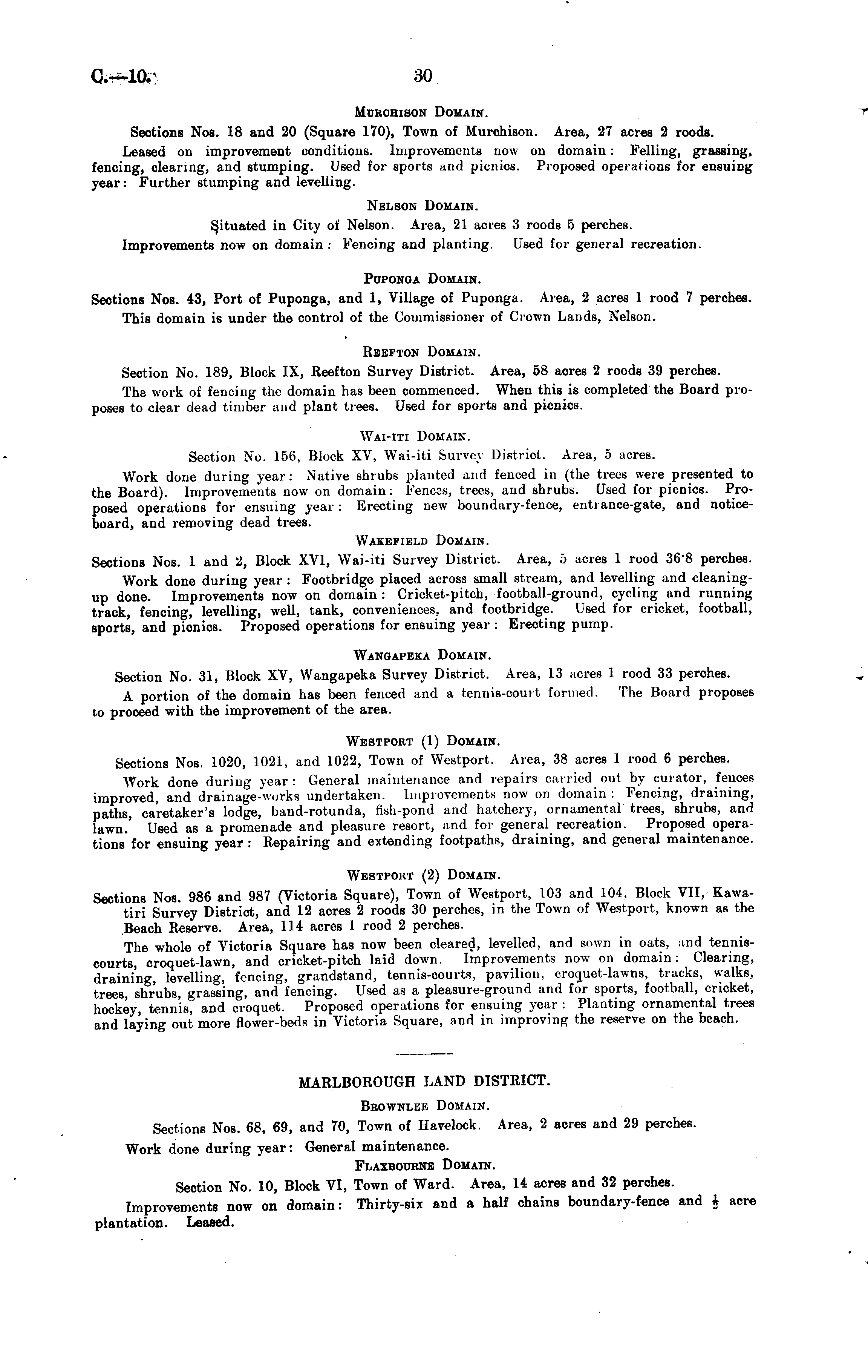 MARLBOROUGH LAND DISTRICT. Brownlee Domain. Sections Nos. 68, 69, and 70, Town of Havelock. Area, 2 acres and 29 perches. Work done during year: General maintenance. Flaxbourne Domain. Section No. 10, Block VI, Town of Ward. Area, 14 acres and 32 perches. Improvements now on domain: Thirty-six and a half chains boundary-fence and \ acre plantation. Leased.