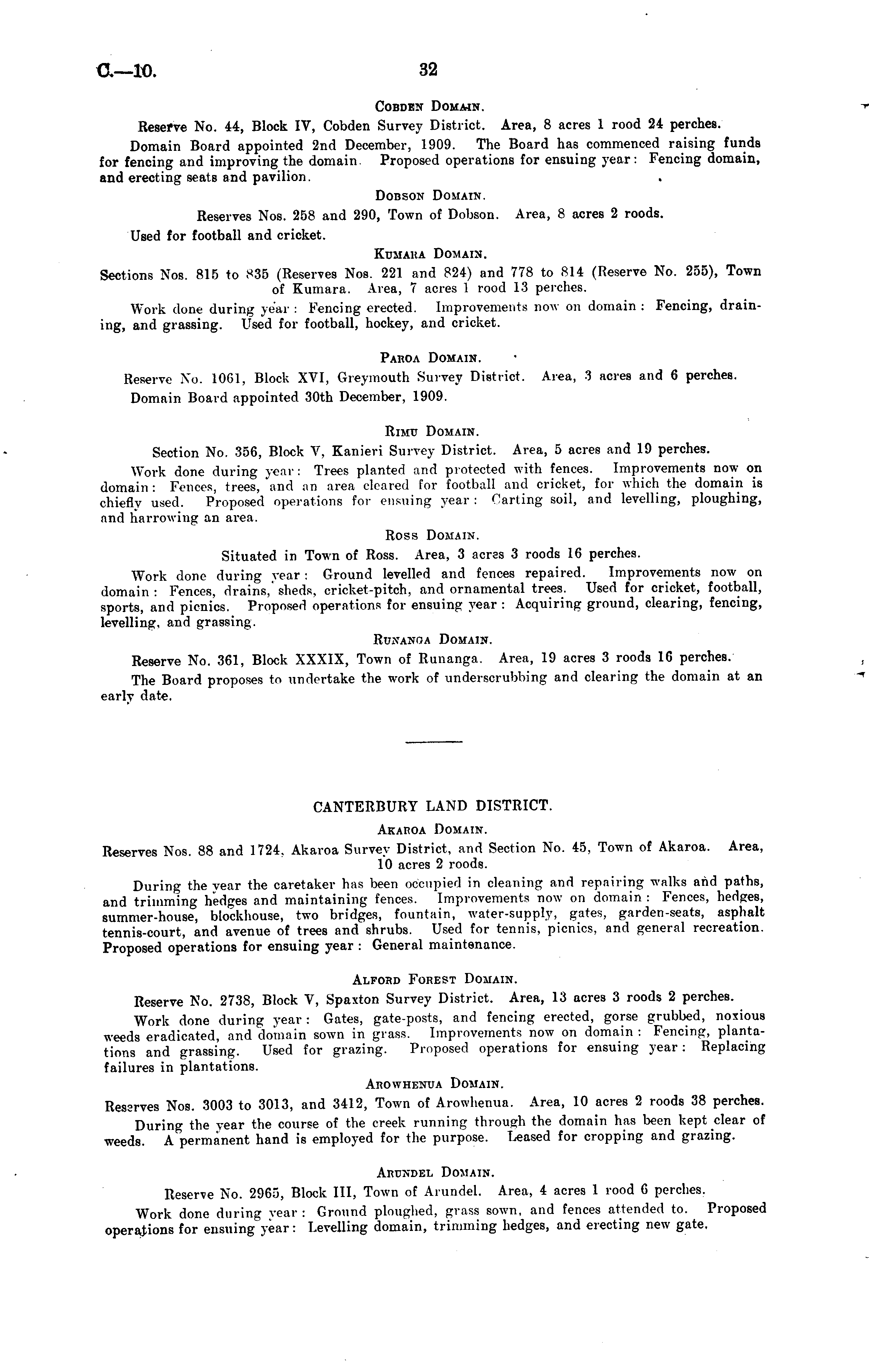 Cobden Domain. Reserve No. 44, Block IV, Cobden Survey District. Area, 8 acres 1 rood 24 perches. Domain Board appointed 2nd December, 1909. The Board has commenced raising funds for fencing and improving the domain Proposed operations for ensuing year: Fencing domain, and erecting seats and pavilion. Dobson Domain. Reserves Nos. 258 and 290, Town of Dobson. Area, 8 acres 2 roods. Used for football and cricket. Kumaha Domain. Sections Nos. 815 to 835 (Reserves Nos. 221 and 824) and 778 to 814 (Reserve No. 255), Town of Kuniara. Area, 7 acres 1 rood 13 perches. Work done during year : Fenoing erected. Improvements now on domain : Fencing, draining, and grassing. Used for football, hockey, and cricket. Paroa Domain. Reserve No. 1061, Block XVI, Greymouth Survey District. Area, 3 acres and 6 perches. Domain Board appointed 30th December, 1909. Rimu Domain. Section No. 356, Block V, Kanieri Survey District. Area, 5 acres and 19 perches. Work done during year: Trees planter! and protected -with fences. Improvements now on domain: Fences, trees, and an urea cleared for football and cricket, for which the domain is chiefly used. Proposed operations for ensuing year: Carting soil, and levelling, ploughing, and harrowing an area. Ross Domain. Situated in Town of Ross. Area, 3 acrss 3 roods 16 perches. Work done during year : Ground levelled and fences repaired. Improvements now on domain: Fences, drains, sheds, cricket-pitch, and ornamental trees. Used for cricket, football, sports, and picnics. Proposed operations for ensuing year : Acquiring ground, clearing, fencing, levelling, and grassing. Runanoa Domain. Reserve No. 361, Block XXXIX, Town of Runanga. Area, 19 acres 3 roods 16 perches. The Board proposes to undertake the work of underscrubbing and clearing the domain at an early date.