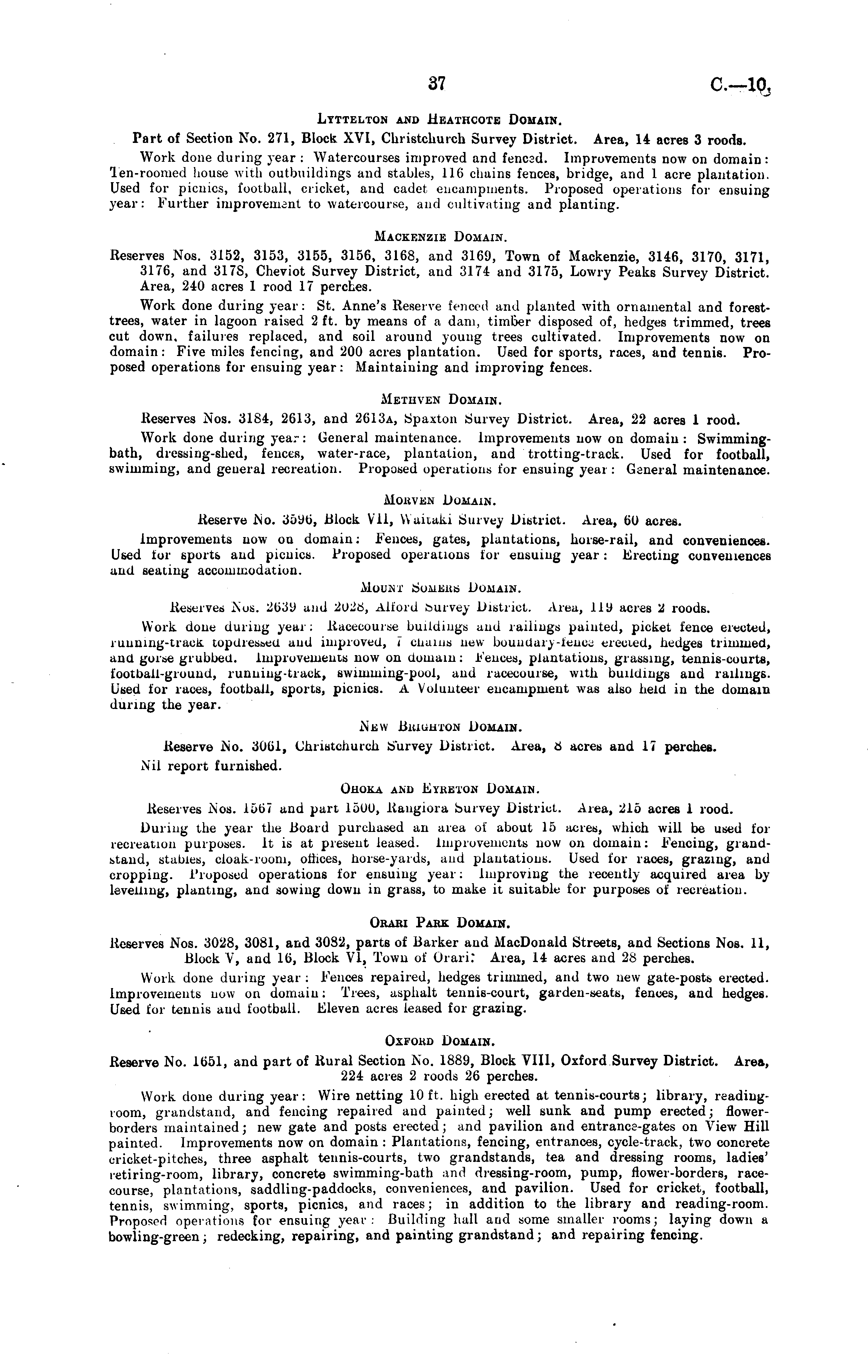 Lyttelton and Heathcote Domain. Part of Section No. 271, Block XVI, Christchurch Survey District. Area, 14 acres 3 roods. Work done during rear : Watercourses improved and fencsd. Improvements now on domain : 'len-roonied house with outbuildings and stables, 116 chains fences, bridge, and 1 acre plantation. Used for picnics, football, cricket, and cadet encampments. Proposed operations for ensuing 3'ear: Further improvement to watercourse, and cultivating and planting. Mackenzie Domain. Reserves Nos. 3152, 3153, 3155, 3156, 3168, and 3169, Town of Mackenzie, 3146, 3170, 3171, 3176, and 3175, Cheviot Survey District, and 3174 and 3175, Lowry Peaks Survey District. Area, 240 acres 1 rood 17 perches. Work done during year: St. Anne's Reserve fenced and planted with ornamental and foresttrees, water in lagoon raised 2 ft. by means of a dam, timber disposed of, hedges trimmed, trees cut down, failures replaced, and soil around young trees cultivated. Improvements now on domain: Five miles fencing, and 200 acres plantation. Used for sports, races, and tennis. Proposed operations for ensuing year: Maintaining and improving fences. Metiiven Domain. Reserves Nos. 3184, 2613, and 2613 a, Spaxton Survey District. Area, 22 acres 1 rood. Work done during year: General maintenance. Improvements now on domain : Swimmingbath, dressing-shed, fences, water-race, plantation, and trotting-track. Used for football, swimming, and general recreation. Proposed operations for ensuing year : General maintenance. MoitVEN Domain. Reserve No. 35y0, Block Vll, \\ uitaki Survey District. Area, 60 acres. Improvements now ou domain: Fences, gates, plantations, horse-rail, and convenience**. Used for sports and picnics. Proposed operations for ensuing year: Erecting conveniences and seating accommodation. Mount Someus Domain. Reserves Mos. 263 i) and '2026, All'ord Purvey District. Area, 119 acres '2 roods. Work done during year: Racecourse buildings and railings painted, picket fence erected, running-track topdres&ed and improved, 1 cnums new boundary-fence erected, budges trimmed, and gorse grubbed. Improvements now on domain: Fences, plantations, grassing, tennis-courts, iootball-grouud, running-track, swimming-pool, and racecourse, with buildings and railings. Used for lacos, football, sports, picnics. A Volunteer encampment was also held in the domain during the year. Nisw liiuuiiTON Domain. Reserve .No. 3061, (Jhnstchurch Purvey District. Area, 6 acres and 17 perches. Nil report furnished. Ohoka and Eyketon Domain. Reserves .Nos. 1567 and part 1500, Rangiora burvey District. Area, 215 acres 1 rood. During the year the Board purchased an area of about 15 acres, which will be used for recreation purposes. It is at present leased. Improvements now on domain: Fencing, grandstand, stables, cloak-room, offices, horse-yards, and plantations. Used for races, grazing, and cropping, l'roposod operations for ensuing year: Improving the recently acquired area by levelling, planting, and sowing down in grass, to make it suitable for purposes of recreation. Oram Park Domain. Reserves Nos. 3028, 3081, and 3082, parts of Barker and Mac Donald Streets, and Sections Nos. 11, Block V, and 16, Block VI, Town of Urari: Area, 14 acres and 28 perches. Work done during year : Fences repaired, hedges trimmed, and two new gate-post& erected. Improvements now on domain: Trees, asphalt tennis-court, garden-seats, fences, and hedges. Used for tenuis and football. Eleven acres leased for grazing. Oxfokd Domain. Reserve No. 1651, and part of Rural Section No. 1889, Block VIII, Oxford Survey District. Area, 224 acres 2 roods 26 perches. Work done during year: Wire netting 10ft. high erected at tennis-courts; library, readingioom, grandstand, and fencing repaired and painted; well sunk and pump erected; flowerborders maintained; new gate and posts erected; and pavilion and entrance-gates on View Hill painted. Improvements now on domain : Plantations, fencing, entrances, cycle-track, two concrete cricket-pitches, three asphalt tennis-courts, two grandstands, tea and dressing rooms, ladies' retiring-room, library, concrete swimming-bath anrl dressing-room, pump, flower-borders, racecourse, plantations, saddling-paddocks, conveniences, and pavilion. Used for cricket, football, tennis, swimming, sports, picnics, and races; in addition to the library and reading-room. Proposed operations for ensuing year: Building hall and some smaller rooms; laying down a bowling-green; redecking, repairing, and painting grandstand; and repairing fencing.