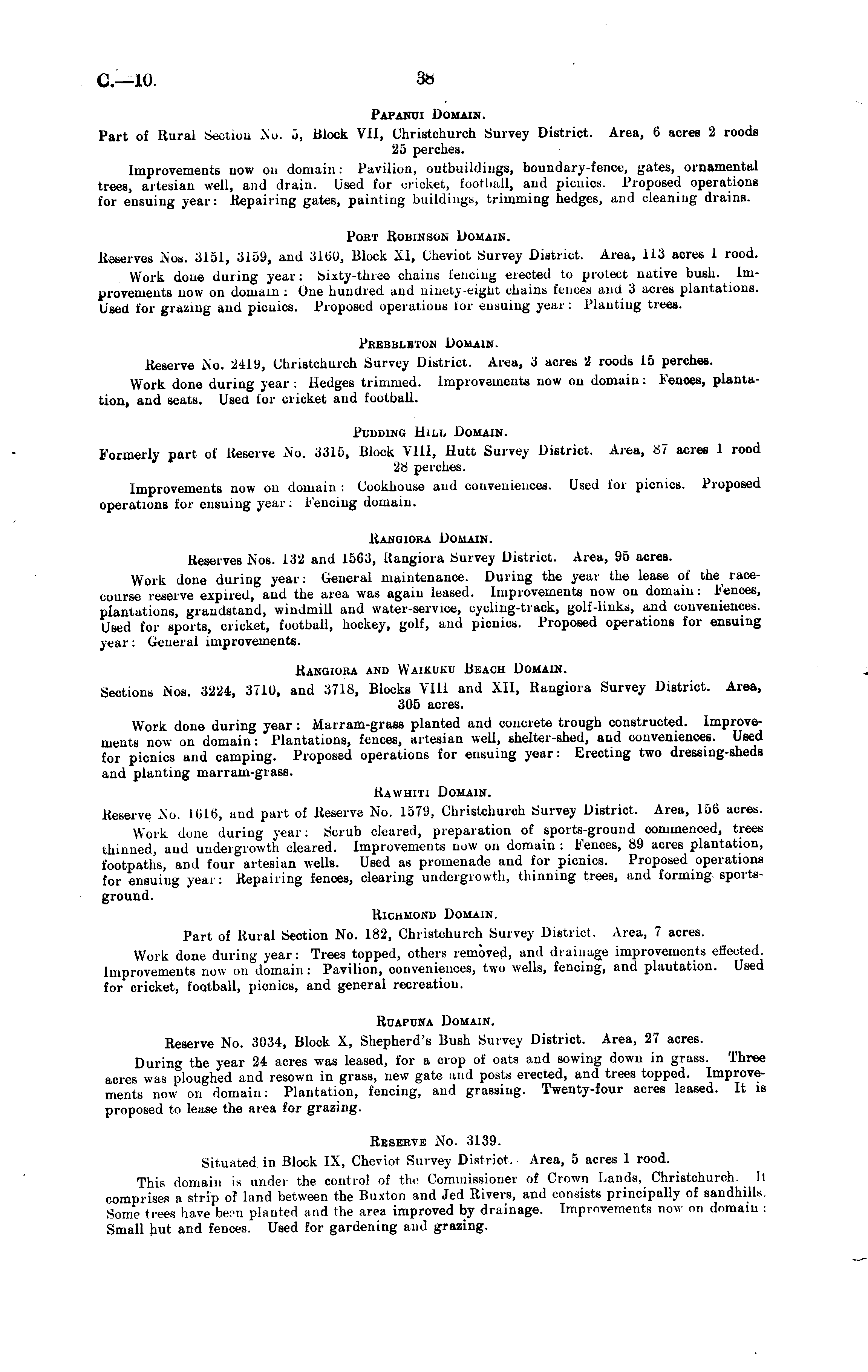 Papanui Domain. Part of Rural Section Nu. 5, Block VII, Christchurch Survey District. Area, 6 acres 2 roods 25 perches. Improvements now on domain: Pavilion, outbuildings, boundary-fence, gates, ornamental trees, artesian well, and drain. Used for uricket, football, and picnics. Proposed operations for ensuing year: Repairing gates, painting buildings, trimming hedges, and cleaning drains. Port Robinson Domain. Reserves Nos. 3151, 3159, and 3160, Block XI, Cheviot Survey District. Area, 113 acres, 1 rood. Work done during year: Sixty-three chains fencing erected to protect native bush, improvements now on domain : One hundred and ninety-eight chains fences and 3 acres plantations. Used for grazing and picnics. Proposed operations for ensuing year : Planting trees. Pkebbletok Domain. Reserve iNo. 2419, (Jhristchurch Survey District. Area, 3 acres 2 roods 15 perches. Work done during year : Hedges trimmed. Improvements now on domain: Fences, plantation, and seats. Used for cricket and football. Pudoing Hill, Domain. Formerly part of Reserve No. 3315, Block VIII, Hutt Survey District. Area, 87 acres 1 rood 28 perches. Improvements now on domain : Cookhouse and conveniences. Used for picnics. Proposed operations for ensuing year : Fencing domain. Ranqiora Domain. Reserves Nos. 132 and 1563, Rangiora Survey District. Area, 95 acres. Work done during year: General maintenance. During the year the lease of the racecourse reserve expired, and the area was again leased. Improvements now on domain: Fences, plantations, grandstand, windmill and water-service, cycling-track, golf-links, and conveniences. Used for sports, cricket, football, hockey, golf, and picnics. Proposed operations for ensuing year: General improvements. Rangiora and Waikuku Beach Domain. Sections Nos. 3224, 3710, and 3718, Blocks VIII and XII, Rangiora Survey District. Area, 305 acres. Work done during year : Marram-grass planted and concrete trough constructed, improvements now on domain: Plantations, fences, artesian well, shelter-shed, and conveniences. Used for picnics and camping. Proposed operations for ensuing year: Erecting two dressing-sheds and planting marram-grass. Rawhiti Domain. Reserve .No. 1016, and part of Reserve No. 1579, Christchurch Survey District. Area, 156 acres. Work done during year: Scrub cleared, preparation of sports-ground commenced, trees thinned, and undergrowth cleared. Improvements now on domain : Fences, 89 acres plantation, footpaths, and four artesian wells. Used as promenade and for picnics. Proposed operations for ensuing year: Repairing fences, clearing undergrowth, thinning trees, and forming sportsground. Richmond Domain. Part of Rural Section No. 182, Christchuroh Survey District. Area, 7 acres. Work done during year: Trees topped, others removed, and drainage improvements effected. Improvements now on domain : Pavilion, conveniences, two wells, fencing, and plantation. Used for cricket, football, picnics, and general recreation. Ruapuna Domain. Reserve No. 3034, Block X, Shepherd's Bush Survey District. Area, 27 acres. During the year 24 acres was leased, for a crop of oats and sowing down in grass. Three acres was ploughed and resown in grass, new gate and posts erected, and trees topped. Improvements now ..n domain: Plantation, fencing, and grassing. Twenty-four acres leased. It is proposed to lease the area for grazing. Reserve No. 3139. Situated in Block IX, Cheviot Survey District. Area, 5 acres 1 rood. This domain is under the control of tin I ioner of Crown Lands, Christchureh. It comprises a strip of land between the Burton and Jed Rivers, and consists principally of sandhills. Some trees have been planted and the area improved by drainage. Improvements now nn domain : Small hut and fences. Used for gardening and grazing.