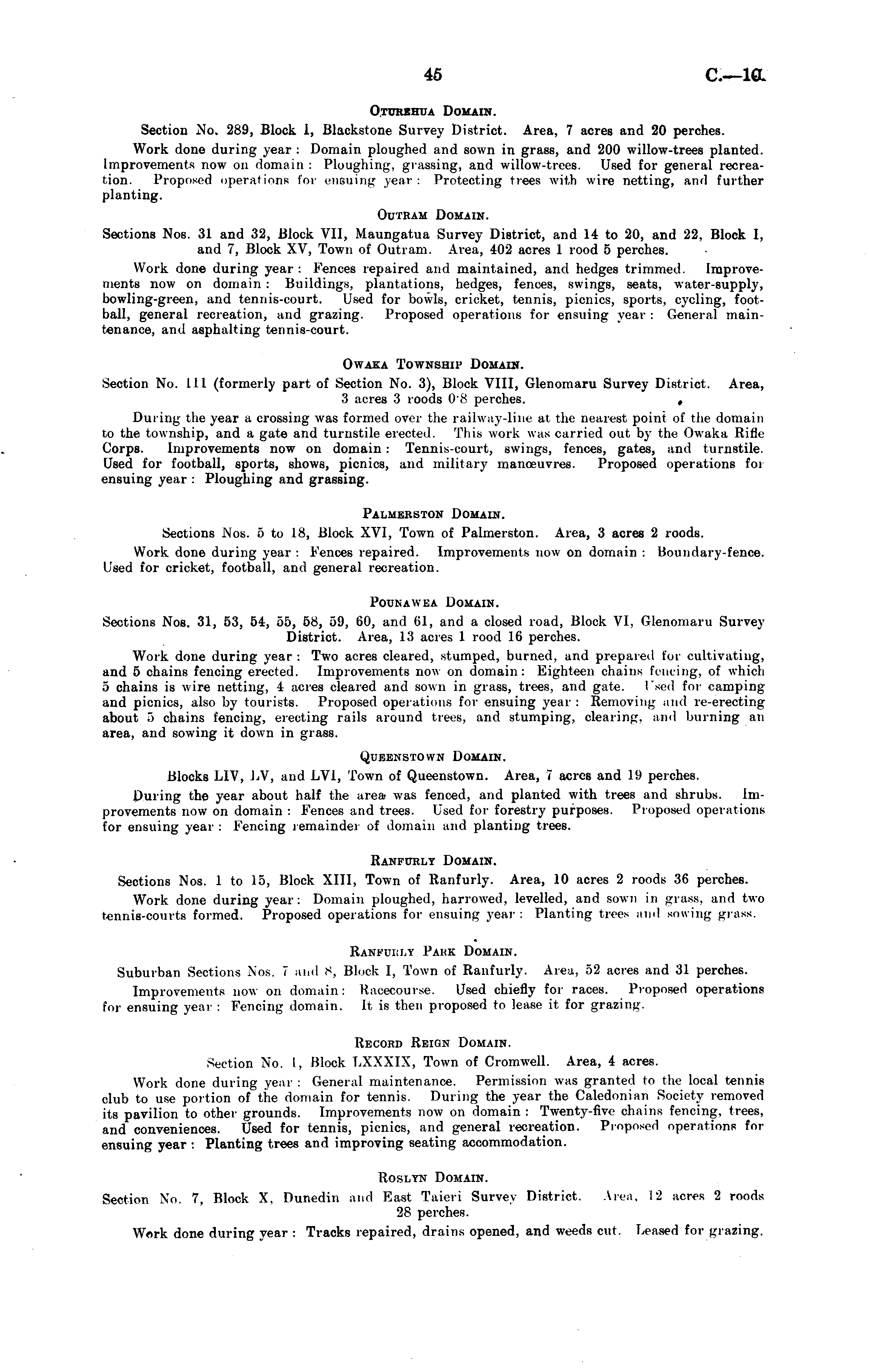 O.turehua Domain. Section No. 289, Block. I, Blackstone Survey District. Area, 7 acres and 20 perches. Work done during year : Domain ploughed and sown in grass, and 200 willow-trees planted. Improvements now on domain : Ploughing, grassing, and willow-trees. Used for general recreation. Proposed operations lor ensuing fear: Protecting trees with wire netting, and further planting. Outram Domain. Sections Nos. 31 and 32, Block VII, Maungatua Survey District, and 14 to 20, and 22, Block I, and 7, Block XV, Town of Outram. Area, 402 acres 1 rood 5 perches. Work done during year : Fences repaired and maintained, and hedges trimmed. Improvements now on domain : Buildings, plantations, hedges, fences, swings, seats, water-supply, bowling-green, and tennis-court. Used for bowls, cricket, tennis, picnics, sports, cycling, football, general recreation, and grazing. Proposed operations for ensuing year : General maintenance, and asphalting tennis-court. Owaka Township Domain. Section No. 11l (formerly part of Section No. 3), Block VIII, Glenomaru Survey District. Area, 3 acres 3 roods 08 perches. t During the year a crossing was formed over the railway-line at the Dearest point of the domain to the township, and a gate and turnstile erected. This work was carried out by the Owaka liinV Corps. Improvements now on domain: Tennis-court, swings, fences, gates, and turnstile. Used for football, sports, shows, picnics, and military manoeuvres. Proposed operations for ensuing year : Ploughing and grassing. Palmerston Domain. Sections Nos. sto 18, Block XVI, Town of Palmerston. Area, 3 acres 2 roods. Work done during year: Fences repaired. Improvements now on domain : Boundary-fenoe. Used for cricket, football, and general recreation. Pounawba Domain. Sections Nos. 31, 53, 54, 55, 58, 59, 60, and 61, and a closed road, Block VI, Glenomaru Survey District. Area, 13 acres 1 rood 16 perches. Work done during year : Two acres cleared, stumped, burned, and prepared for cultivating, and 5 chains fencing erected. Improvements now on domain: Eighteen chains fencing, of which 5 chains is wire netting, 4 acres cleared and sown in grass, trees, and gate. Used for camping and picnics, also by tourists. Proposed operations for ensuing year: Removing and re-erecting about .") chains fencing, erecting rails around trees, and stumping, olearing, and burning an area, and sowing it down in grass. QUBBNSTOVVN DOMAIN. Blocks LIV, LV, and LVI, Town of Queenstown. Area, 7 acres and 19 perches. During the year about half the area- was fenced, and planted with trees and shrubs. Improvements now on domain : Fences and trees. Used for forestry purposes. Proposed operations for ensuing year : Fencing remainder of domain and planting trees. Ranfurly Domain. Sections Nos. 1 to 15, Block XIII, Town of Ranfurly. Area, 10 acres 2 roods 36 perches. Work done during year: Domain ploughed, harrowed, levelled, and sown in grass, and two tennis-courts formed. Proposed operations for ensuing year: Planting trees and sowing grass. Ranfuiily Park Domain. Suburban Sections Nos. 7 and 8, Block I, Town of Ranfurly. Area, .">2 acres and 31 perches. Improvements now on domain : Racecourse. Used chiefly for races. Proposed operations for ensuing year : Fencing domain. It is then proposed to lease it for grazing. Record Reign Domain. Section No. I, Block LXXXIX, Town of Cromwell. Area, 4 acres. Work done during year: General maintenance. Permission was granted to the local tennis club to use portion of the domain for tennis. During the year the Caledonian Society removed its pavilion to other grounds. Improvements now on domain: Twenty-five chains fencing, trees, and conveniences. Used for tennis, picnics, arid general recreation. Proposed operations for ensuing year : Planting trees and improving seating accommodation. Roslyn Domain. Section No. 7, Block X. Dunedin and East Taieri Survey District. Area, 12 acres 2 roods 28 perches. Work done during year : Tracks repaired, drains opened, and weeds cut. Leased for grazing.