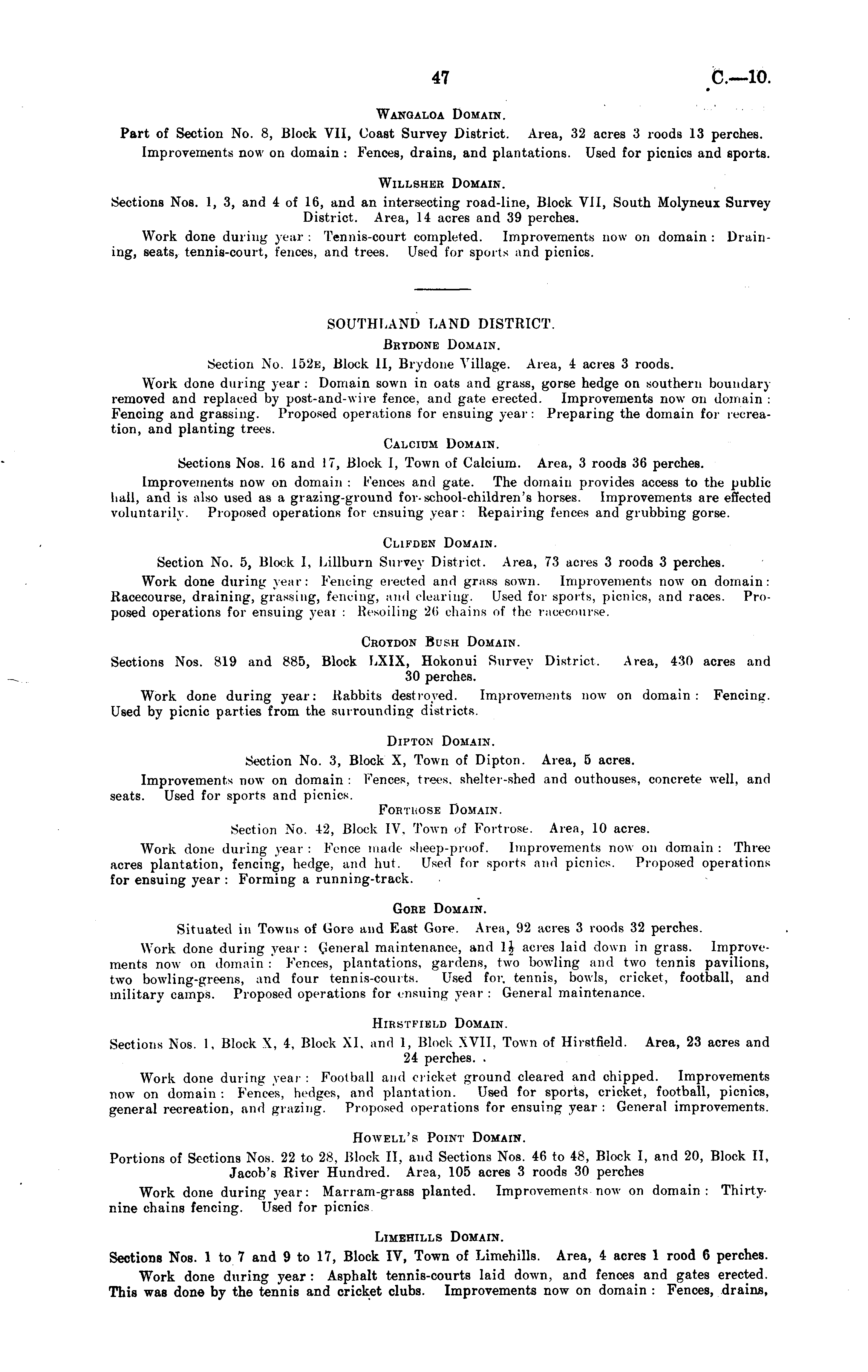 Wangaloa Domain. Part of Section No. 8, Block VII, Coast Survey District. Area, 32 acres 3 roods 13 perches. Improvements now on domain : Fences, drains, and plantations. Used for picnics and sports. Willsher Domain. Sections Nos. 1, 3, and 4 of 16, and an intersecting road-line, Block VII, South Molyneux Survey District. Area, 14 acres and 39 perches. Work done during year: Tennis-court completed. Improvements now on domain: Draining, seats, tennis-court, fences, and trees. Used for sports and picnics.