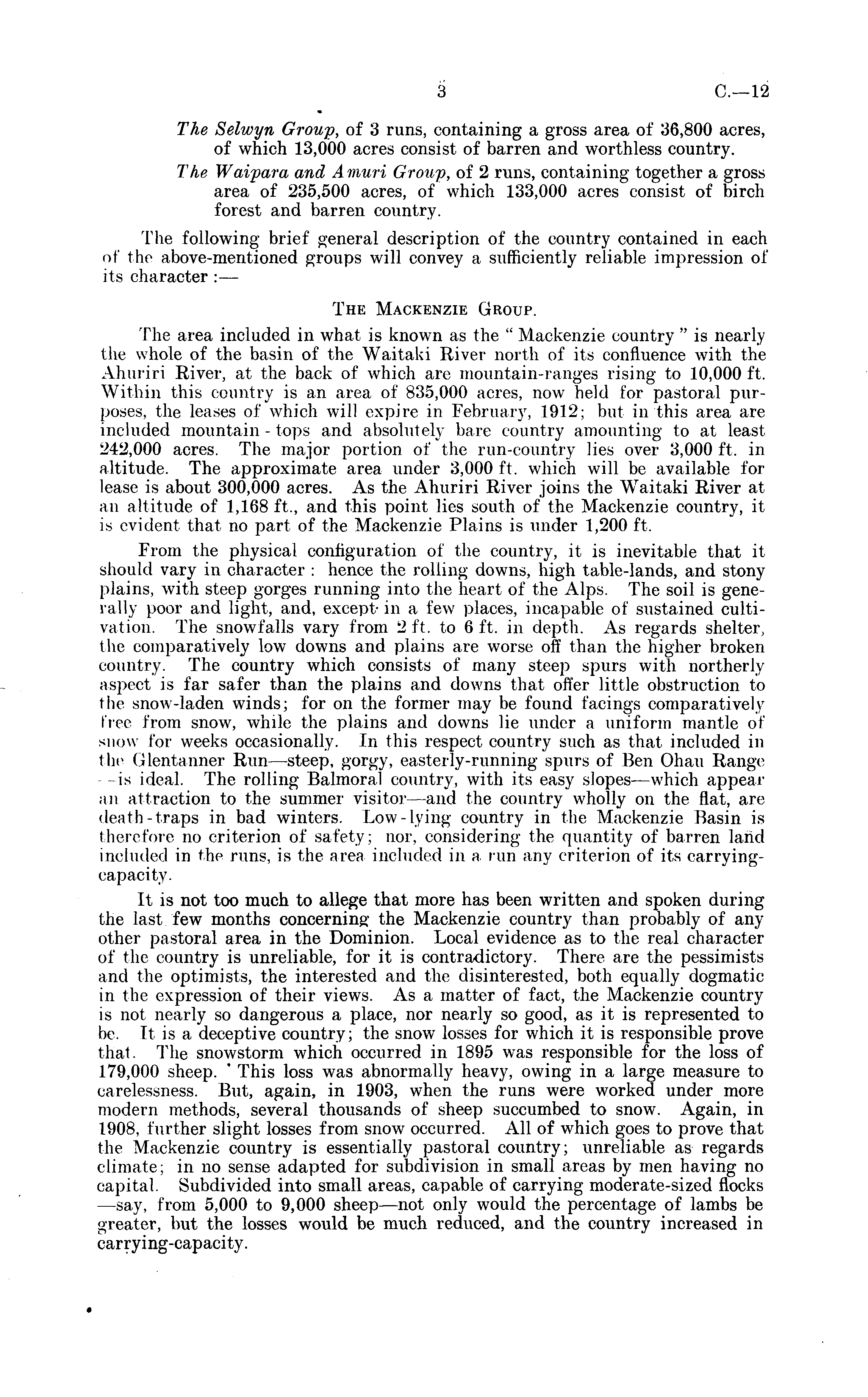The Selwyn Group, of 3 runs, containing a gross area of 36,800 acres, of which 13,000 acres consist of barren and worthless country. The Waipara and A muri Group, of 2 runs, containing together a gross area of 235,500 acres, of which 133,000 acres consist of birch forest and barren country. The following brief general description of the country contained in each of the above-mentioned groups will convey a sufficiently reliable impression of its character : — The Mackenzie Group. The area included in what is known as the " Mackenzie country " is nearly the whole of the basin of the Waitaki River north of its confluence with the Ahuriri River, at the back of which are mountain-ranges rising to 10,000 ft. Within this country is an area of 835,000 acres, now held for pastoral purposes, the leases of which will expire in February, 1912; but in this area are included mountain - tops and absolutely bare country amounting to at least 242,000 acres. The major portion of the run-country lies over 3,000 ft. in altitude. The approximate area under 3,000 ft. which will be available for lease is about 300,000 acres. As the Ahuriri River joins the Waitaki River at an altitude of 1,168 ft., and this point lies south of the Mackenzie country, it is evident that no part of the Mackenzie Plains is under 1,200 ft. From the physical configuration of the country, it is inevitable that it should vary in character : hence the rolling downs, high table-lands, and stony plains, with steep gorges running into the heart of the Alps. The soil is generally poor and light, and, except- in a few places, incapable of sustained cultivation. The snowfalls vary from 2 ft. to 6 ft. in depth. As regards shelter, the comparatively low downs and plains are worse off than the higher broken country. The country which consists of many steep spurs with northerly aspect is far safer than the plains and downs that offer little obstruction to the snow-laden winds; for on the former may be found facings comparatively free from snow, while the plains and downs lie under a uniform mantle of snow for weeks occasionally. In this respect country such as that included in the Glentanner Run —steep, gorgy, easterly-running spurs of Ben Ohau Range is ideal. The rolling Balmoral country, with its easy slopes—which appear an attraction to the summer visitor—and the country wholly on the flat, are death-traps in bad winters. Low-lying country in the Mackenzie Basin is therefore no criterion of safety; nor, considering the quantity of barren land included in the runs, is the area included in a run any criterion of its carryingcapacity. It is not too much to allege that more has been written and spoken during the last few months concerning the Mackenzie country than probably of any other pastoral area in the Dominion. Local evidence as to the real character of the country is unreliable, for it is contradictory. There are the pessimists and the optimists, the interested and the disinterested, both equally dogmatic in the expression of their views. As a matter of fact, the Mackenzie country is not nearly so dangerous a place, nor nearly so good, as it is represented to be. It is a deceptive country; the snow losses for which it is responsible prove that. The snowstorm which occurred in 1895 was responsible for the loss of 179,000 sheep. ' This loss was abnormally heavy, owing in a large measure to carelessness. But, again, in 1903, when the runs were worked under more modern methods, several thousands of sheep succumbed to snow. Again, in 1908, further slight losses from snow occurred. All of which goes to prove that the Mackenzie country is essentially pastoral country; unreliable as regards climate; in no sense adapted for subdivision in small areas by men having no capital. Subdivided into small areas, capable of carrying moderate-sized flocks —say, from 5,000 to 9,000 sheep—not only would the percentage of lambs be greater, but the losses would be much reduced, and the country increased in carrying-capacity.