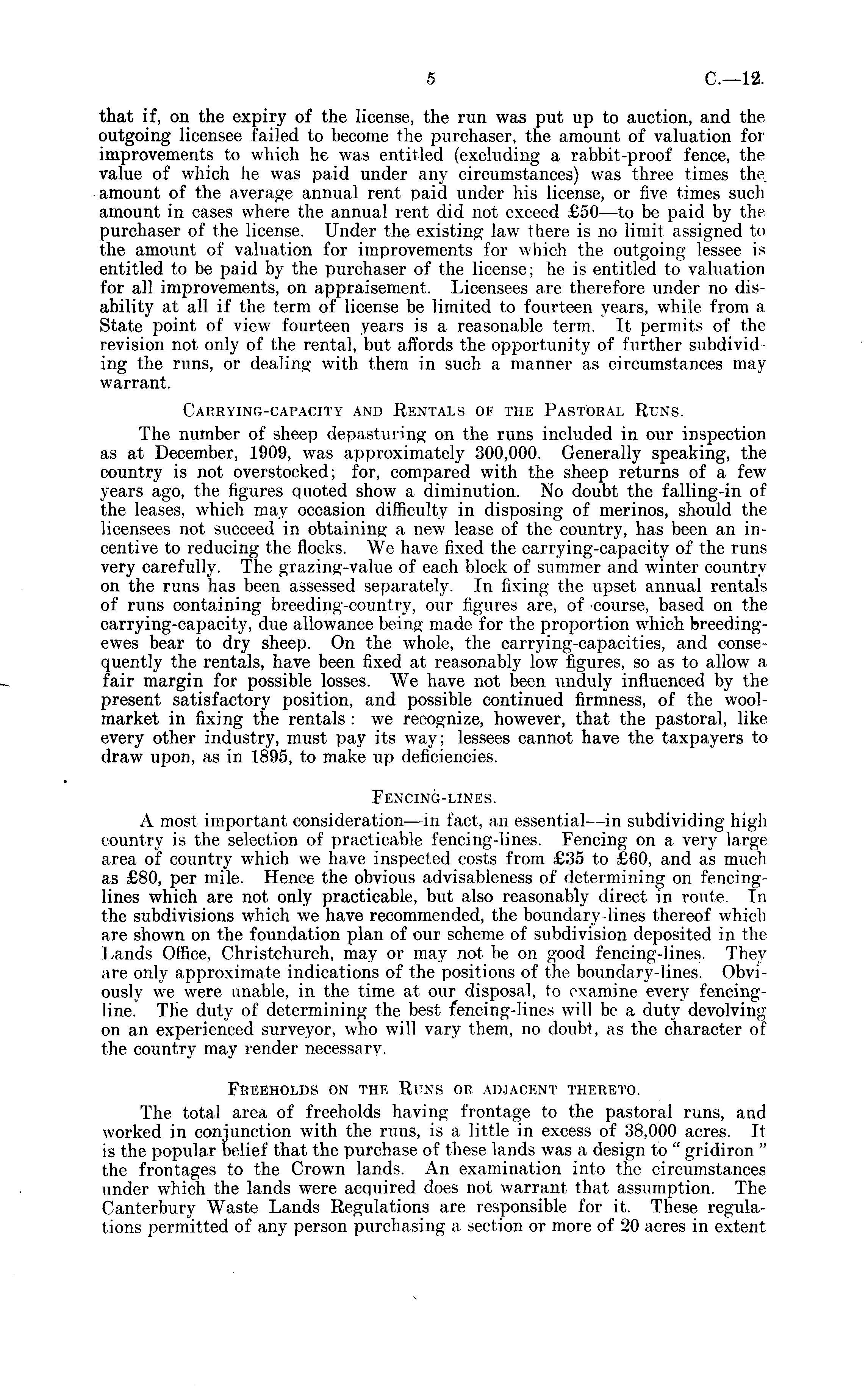 that if, on the expiry of the license, the run was put up to auction, and the outgoing licensee failed to become the purchaser, the amount of valuation for improvements to which he was entitled (excluding a rabbit-proof fence, the value of which he was paid under any circumstances) was three times the amount of the average annual rent paid under his license, or five times such amount in cases where the annual rent did not exceed £50 —to be paid by the purchaser of the license. Under the existing law there is no limit assigned to the amount of valuation for improvements for which the outgoing lessee is entitled to be paid by the purchaser of the license; he is entitled to valuation for all improvements, on appraisement. Licensees are therefore under no disability at all if the term of license be limited to fourteen years, while from a State point of view fourteen years is a reasonable term. It permits of the revision not only of the rental, but affords the opportunity of further subdividing the runs, or dealing with them in such a manner as circumstances may warrant. Carrying-capacity and Rentals of the Pastoral Runs. The number of sheep depasturing on the runs included in our inspection as at December, 1909, was approximately 300,000. Generally speaking, the country is not overstocked; for, compared with the sheep returns of a few years ago, the figures quoted show a diminution. No doubt the falling-in of the leases, which may occasion difficulty in disposing of merinos, should the licensees not succeed in obtaining a new lease of the country, has been an incentive to reducing the flocks. We have fixed the carrying-capacity of the runs very carefully. The grazing-value of each block of summer and winter country on the runs has been assessed separately. In fixing the upset annual rentals of runs containing breeding-country, our figures are, of course, based on the carrying-capacity, due allowance being made for the proportion which breedingewes bear to dry sheep. On the whole, the carrying-capacities, and consequently the rentals, have been fixed at reasonably low figures, so as to allow a fair margin for possible losses. We have not been unduly influenced by the present satisfactory position, and possible continued firmness, of the woolmarket in fixing the rentals : we recognize, however, that the pastoral, like every other industry, must pay its way; lessees cannot have the taxpayers to draw upon, as in 1895, to make up deficiencies. Fencing-lines. A most important consideration —in fact, an essential —in subdividing high country is the selection of practicable fencing-lines. Fencing on a very large area of country which we have inspected costs from £35 to £60, and as much as £80, per mile. Hence the obvious advisableness of determining on fencinglines which are not only practicable, but also reasonably direct in route. In the subdivisions which we have recommended, the boundary-lines thereof which are shown on the foundation plan of our scheme of subdivision deposited in the Lands Office, Christchurch, may or may not be on good fencing-lines. They are only approximate indications of the positions of the boundary-lines. Obviously we were unable, in the time at our disposal, to examine every fencingline. The duty of determining the best fencing-lines will be a duty devolving on an experienced surveyor, who will vary them, no doubt, as the character of the country may render necessary. Freeholds on the Runs or adjacent thereto. The total area of freeholds having frontage to the pastoral runs, and worked in conjunction with the runs, is a little in excess of 38,000 acres. It is the popular belief that the purchase of these lands was a design to " gridiron " the frontages to the Crown lands. An examination into the circumstances under which the lands were acquired does not warrant that assumption. The Canterbury Waste Lands Regulations are responsible for it. These regulations permitted of any person purchasing a section or more of 20 acres in extent
