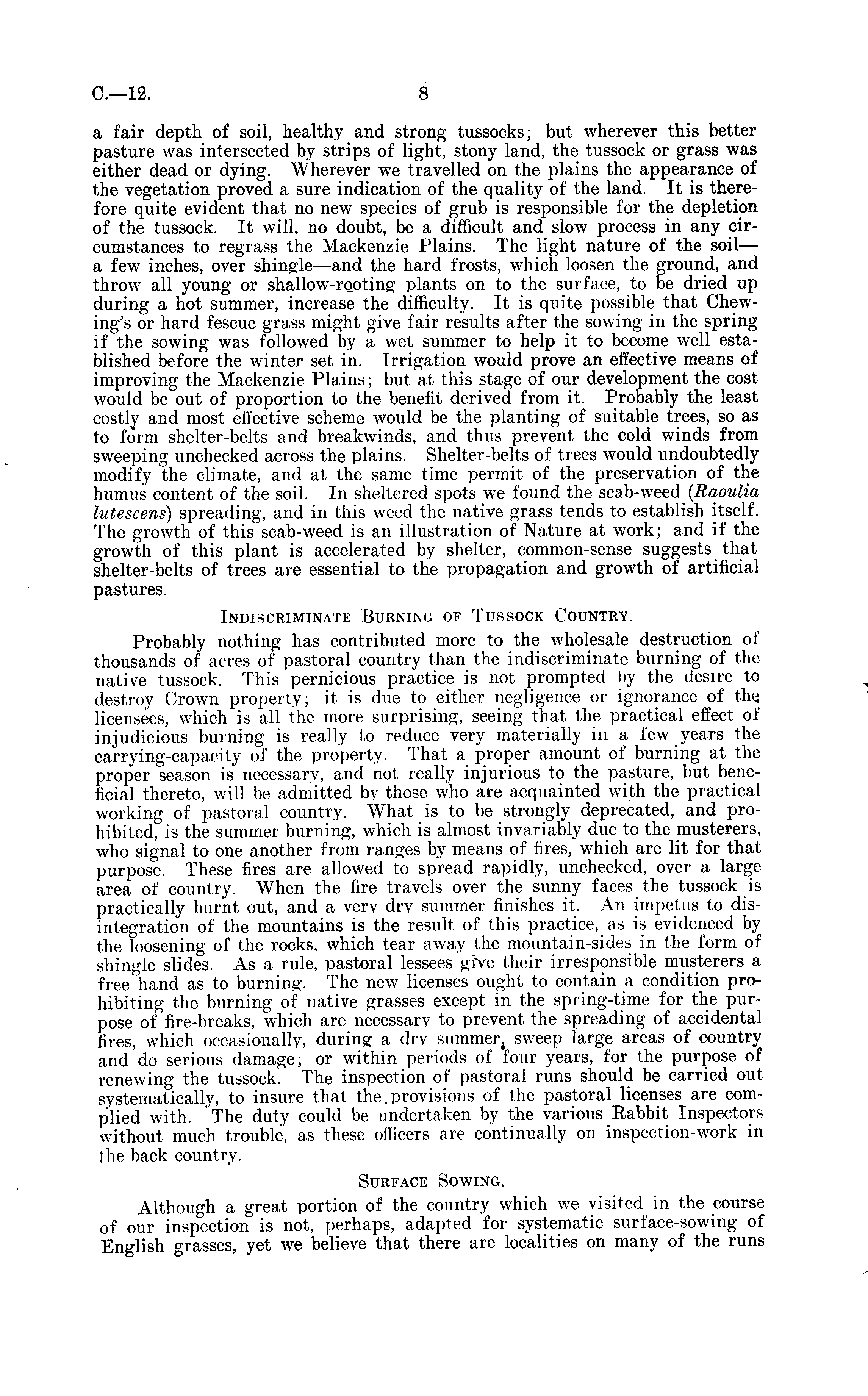 a fair depth of soil, healthy and strong tussocks; but wherever this better pasture was intersected by strips of light, stony land, the tussock or grass was either dead or dying. Wherever we travelled on the plains the appearance of the vegetation proved a sure indication of the quality of the land. It is therefore quite evident that no new species of grub is responsible for the depletion of the tussock. It will, no doubt, be a difficult and slow process in any circumstances to regrass the Mackenzie Plains. The light nature of the soil — a few inches, over shingle—and the hard frosts, which loosen the ground, and throw all young or shallow-rooting plants on to the surface, to be dried up during a hot summer, increase the difficulty. It is quite possible that Chewing's or hard fescue grass might give fair results after the sowing in the spring if the sowing was followed by a wet summer to help it to become well established before the winter set in. Irrigation would prove an effective means of improving the Mackenzie Plains; but at this stage of our development the cost would be out of proportion to the benefit derived from it. Probably the least costly and most effective scheme would be the planting of suitable trees, so as to form shelter-belts and breakwinds, and thus prevent the cold winds from sweeping unchecked across the plains. Shelter-belts of trees would undoubtedly modify the climate, and at the same time permit of the preservation of the humus content of the soil. In sheltered spots we found the scab-weed (Raoulia lutescens) spreading, and in this weed the native grass tends to establish itself. The growth of this scab-weed is an illustration of Nature at work; and if the growth of this plant is accelerated by shelter, common-sense suggests that shelter-belts of trees are essential to the propagation and growth of artificial pastures. Indiscriminate Burning of Tussock Country. Probably nothing has contributed more to the wholesale destruction of thousands of acres of pastoral country than the indiscriminate burning of the native tussock. This pernicious practice is not prompted by the desire to destroy Crown property; it is due to either negligence or ignorance of the. licensees, which is all the more surprising, seeing that the practical effect of injudicious burning is really to reduce very materially in a few years the carrying-capacity of the property. That a proper amount of burning at the proper season is necessary, and not really injurious to the pasture, but beneficial thereto, will be admitted by those who are acquainted with the practical working of pastoral country. What is to be strongly deprecated, and prohibited, is the summer burning, which is almost invariably due to the musterers, who signal to one another from ranges by means of fires, which are lit for that purpose. These fires are allowed to spread rapidly, unchecked, over a large area of country. When the fire travels over the sunny faces the tussock is practically burnt out, and a very dry summer finishes it. An impetus to disintegration of the mountains is the result of this practice, as is evidenced by the loosening of the rocks, which tear away the mountain-sides in the form of shingle slides. As a rule, pastoral lessees give their irresponsible musterers a free hand as to burning. The new licenses ought to contain a condition prohibiting the burning of native grasses except in the spring-time for the purpose of fire-breaks, which are necessary to prevent the spreading of accidental fires, which occasionally, during a dry sweep large areas of country and do serious damage; or within periods of four years, for the purpose of renewing the tussock. The inspection of pastoral runs should be carried out systematically, to insure that the.provisions of the pastoral licenses are complied with. The duty could be undertaken by the various Rabbit Inspectors without much trouble, as these officers are continually on inspection-work in the back country. Surface Sowing. Although a great portion of the country which we visited in the course of our inspection is not, perhaps, adapted for systematic surface-sowing of English grasses, yet we believe that there are localities on many of the runs