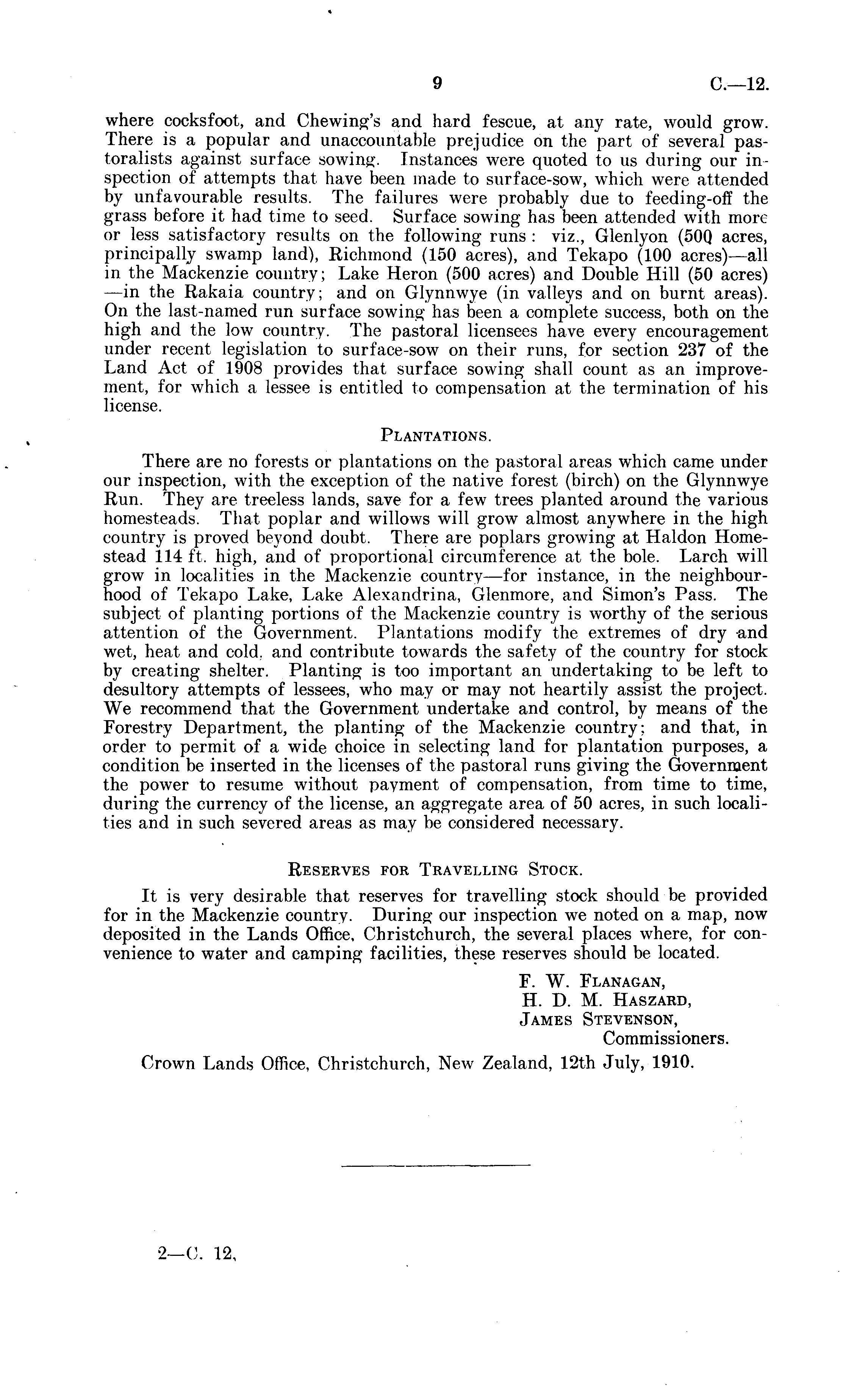 where cocksfoot, and Chewing's and hard fescue, at any rate, would grow. There is a popular and unaccountable prejudice on the part of several pastoralists against surface sowing. Instances were quoted to us during our inspection of attempts that have been made to surface-sow, which were attended by unfavourable results. The failures were probably due to feeding-off the grass before it had time to seed. Surface sowing has been attended with more or less satisfactory results on the following runs : viz., Glenlyon (50Q acres, principally swamp land), Richmond (150 acres), and Tekapo (100 acres) —all in the Mackenzie country; Lake Heron (500 acres) and Double Hill (50 acres) —in the Rakaia country; and on Glynnwye (in valleys and on burnt areas). On the last-named run surface sowing has been a complete success, both on the high and the low country. The pastoral licensees have every encouragement under recent legislation to surface-sow on their runs, for section 237 of the Land Act of 1908 provides that surface sowing shall count as an improvement, for which a lessee is entitled to compensation at the termination of his license. Plantations. There are no forests or plantations on the pastoral areas which came under our inspection, with the exception of the native forest (birch) on the Glynnwye Run. They are treeless lands, save for a few trees planted around the various homesteads. That poplar and willows will grow almost anywhere in the high country is proved beyond doubt. There are poplars growing at Haldon Homestead 114 ft. high, and of proportional circumference at the bole. Larch will grow in localities in the Mackenzie country—for instance, in the neighbourhood of Tekapo Lake, Lake Alexandrina, Glenmore, and Simon's Pass. The subject of planting portions of the Mackenzie country is worthy of the serious attention of the Government. Plantations modify the extremes of dry and wet, heat and cold, and contribute towards the safety of the country for stock by creating shelter. Planting is too important an undertaking to be left to desultory attempts of lessees, who may or may not heartily assist the project. We recommend that the Government undertake and control, by means of the Forestry Department, the planting of the Mackenzie country; and that, in order to permit of a wide choice in selecting land for plantation purposes, a condition be inserted in the licenses of the pastoral runs giving the Government the power to resume without payment of compensation, from time to time, during the currency of the license, an aggregate area of 50 acres, in such localities and in such severed areas as may be considered necessary. Reserves for Travelling Stock. It is very desirable that reserves for travelling stock should be provided for in the Mackenzie country. During our inspection we noted on a map, now deposited in the Lands Office, Christchurch, the several places where, for convenience to water and camping facilities, these reserves should be located. F. W. Flanagan, H. D. M. Haszard, James Stevenson, Commissioners. Crown Lands Office, Christchurch, New Zealand, 12th July, 1910.